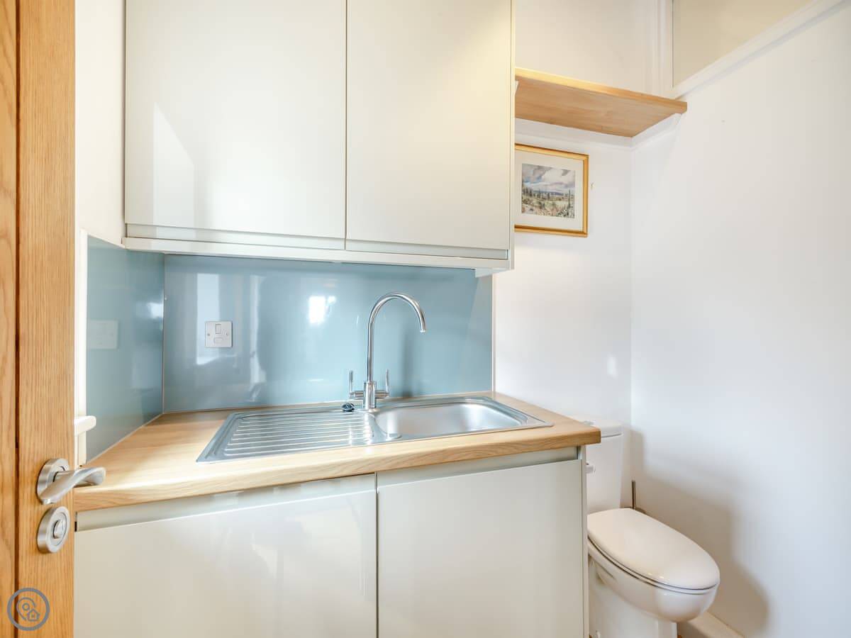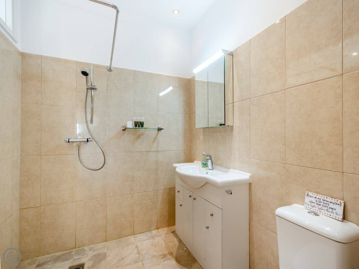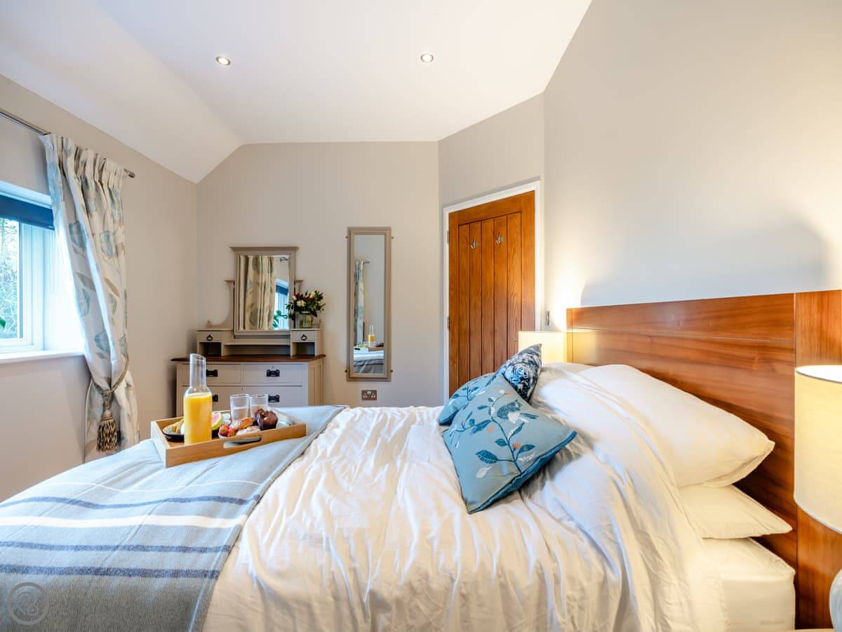It sleeps three. One bedroom with a kingsize bed, one bathroom. It's got a 5 Star rating, which means it's well-equipped and comfortable. There are no steps or stairs anywhere, so it's all on one level. The bathroom is a wet room.