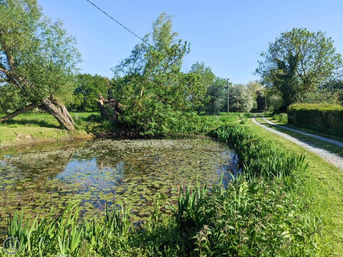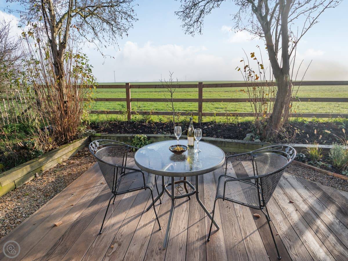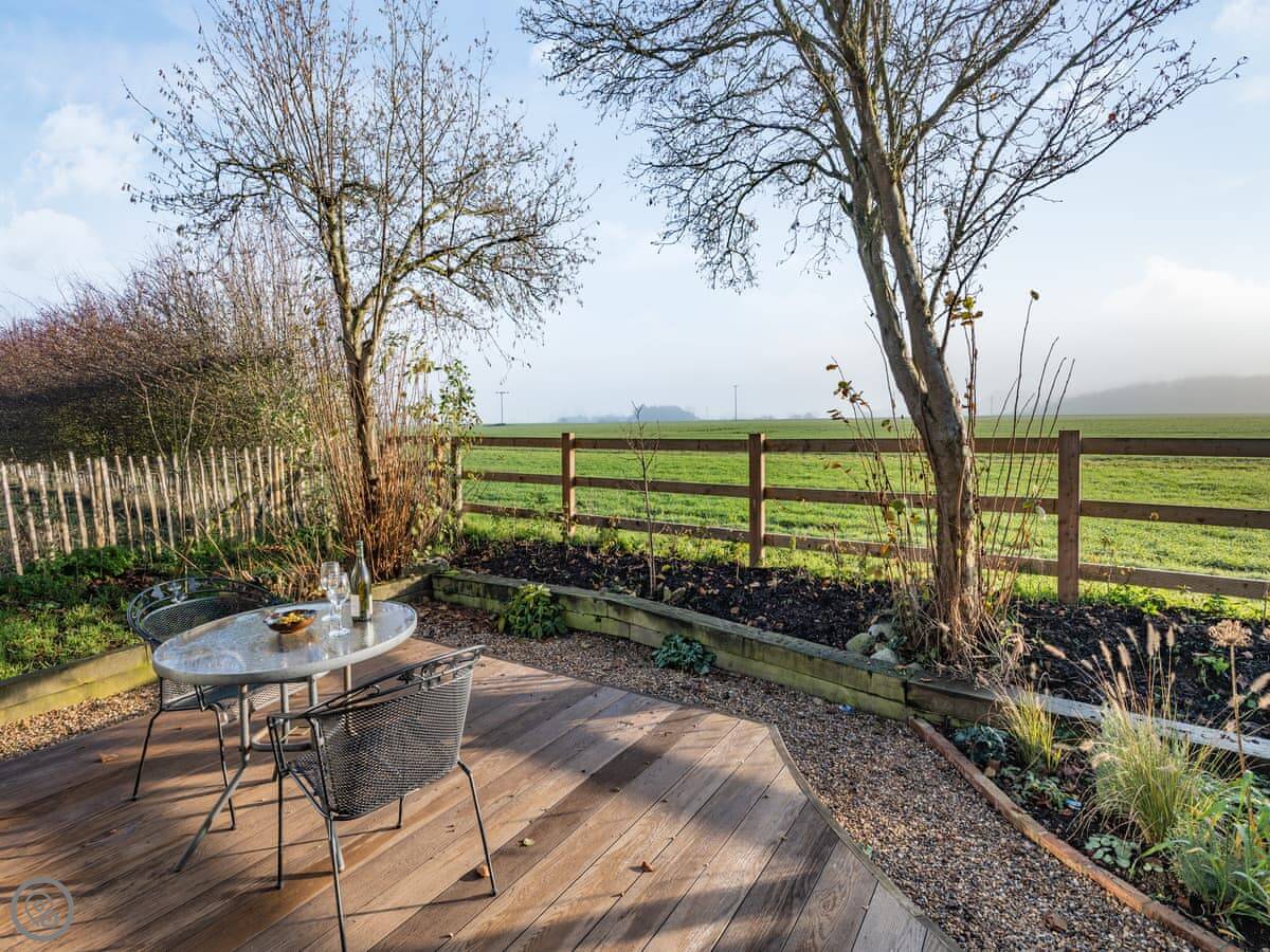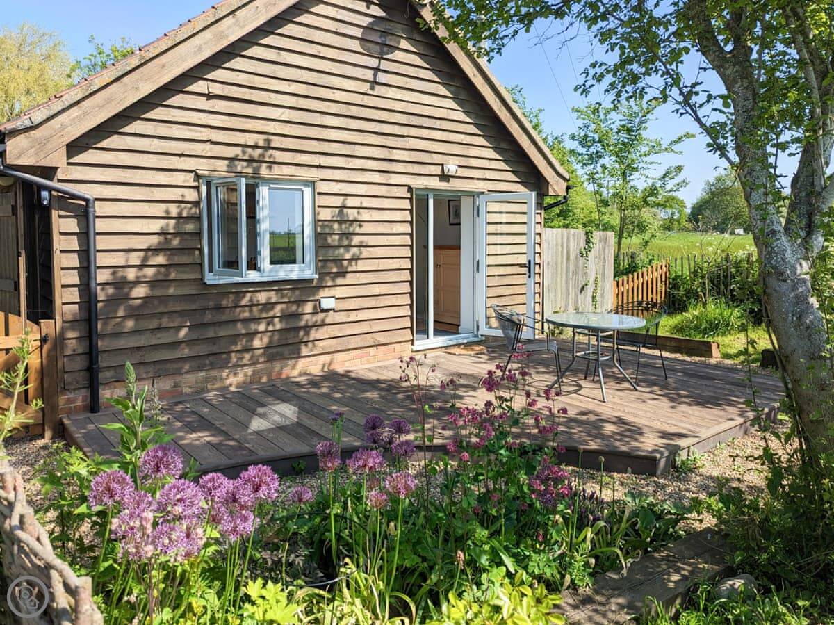 You've got your own enclosed courtyard garden with a table and chairs. It looks out over the fields. About twenty steps from your door is the village common, with a duck pond and wildflowers. It's a nice spot.