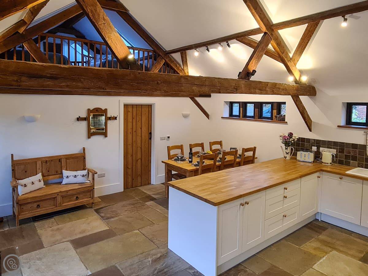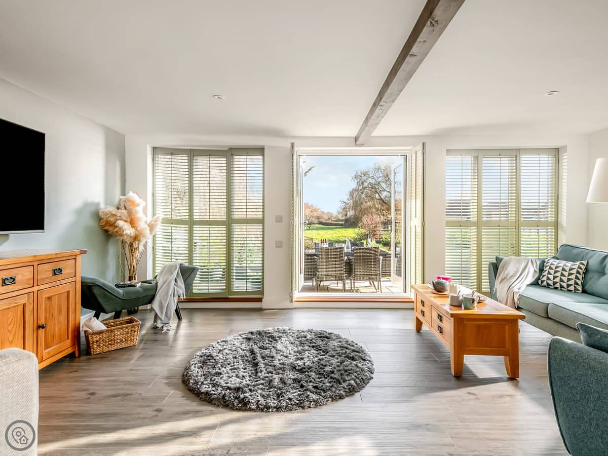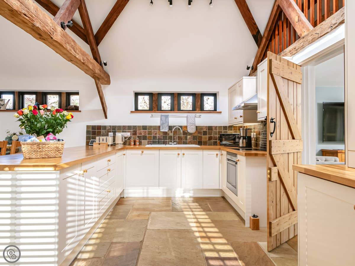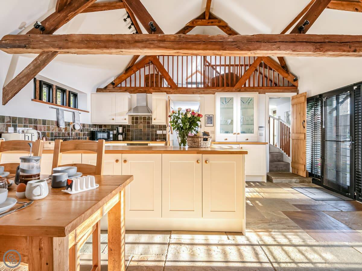 The kitchen is big with a vaulted ceiling and old beams. The living room has doors out to the garden. It's got a 5 Star rating. It's comfortable and everything works.