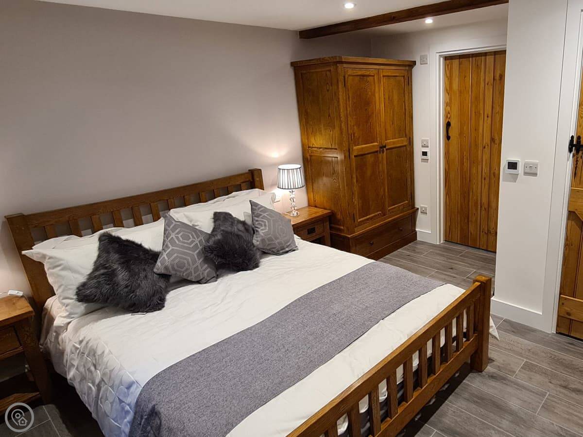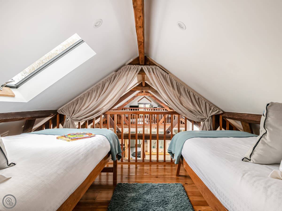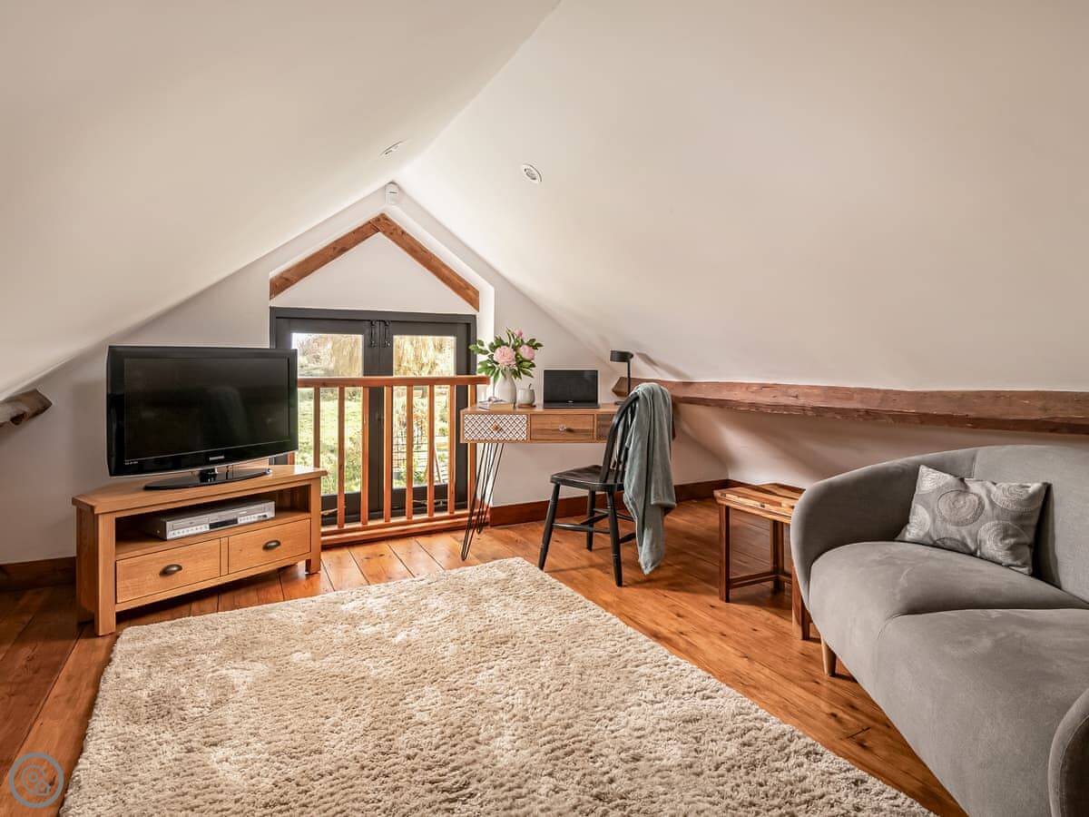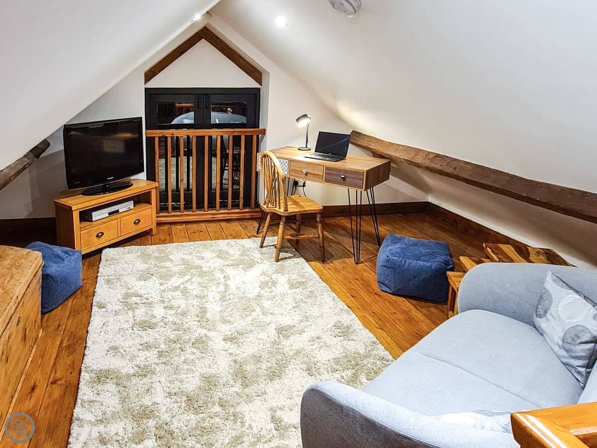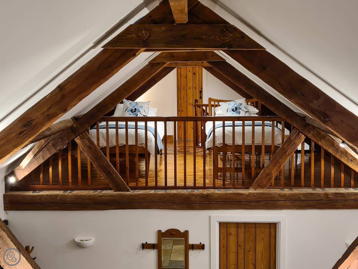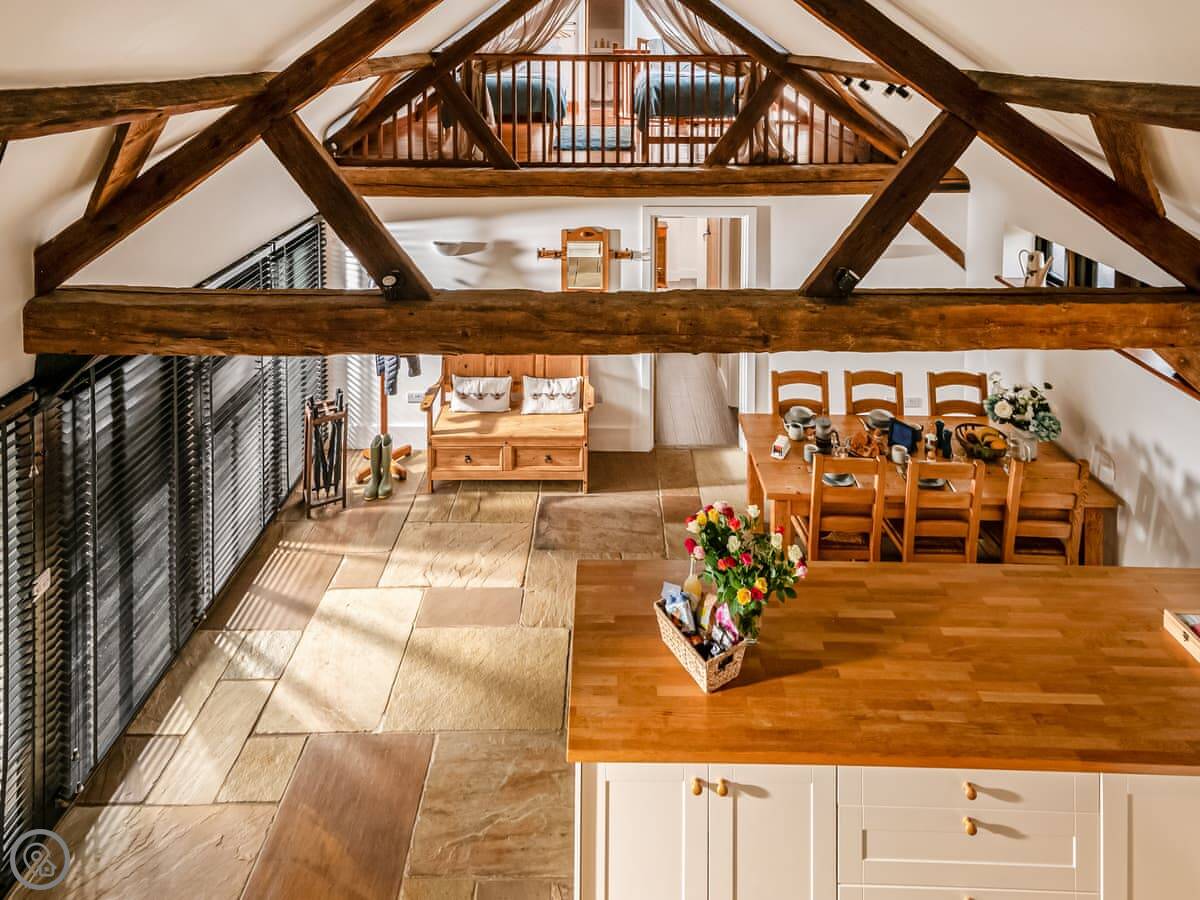 The place sleeps six. There are three bedrooms and two bathrooms. Two bedrooms are on the ground floor. One is a kingsize with its en-suite. The third bedroom is upstairs on a mezzanine looking over the kitchen. That one has its own toilet. There's another mezzanine area at the other end that's a snug with a view.