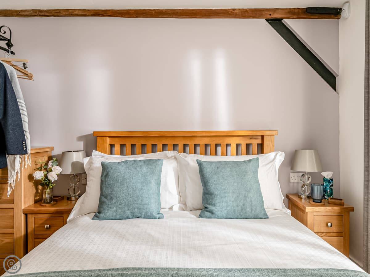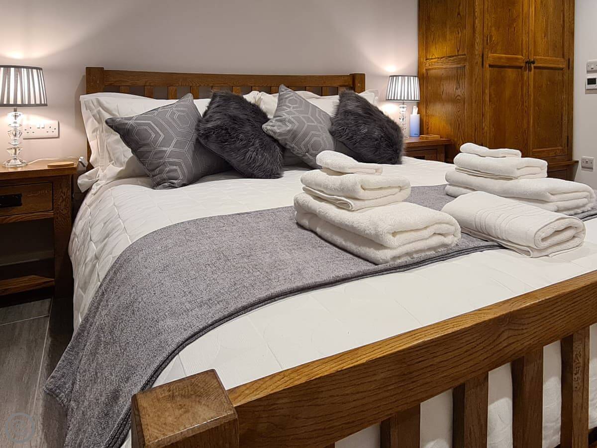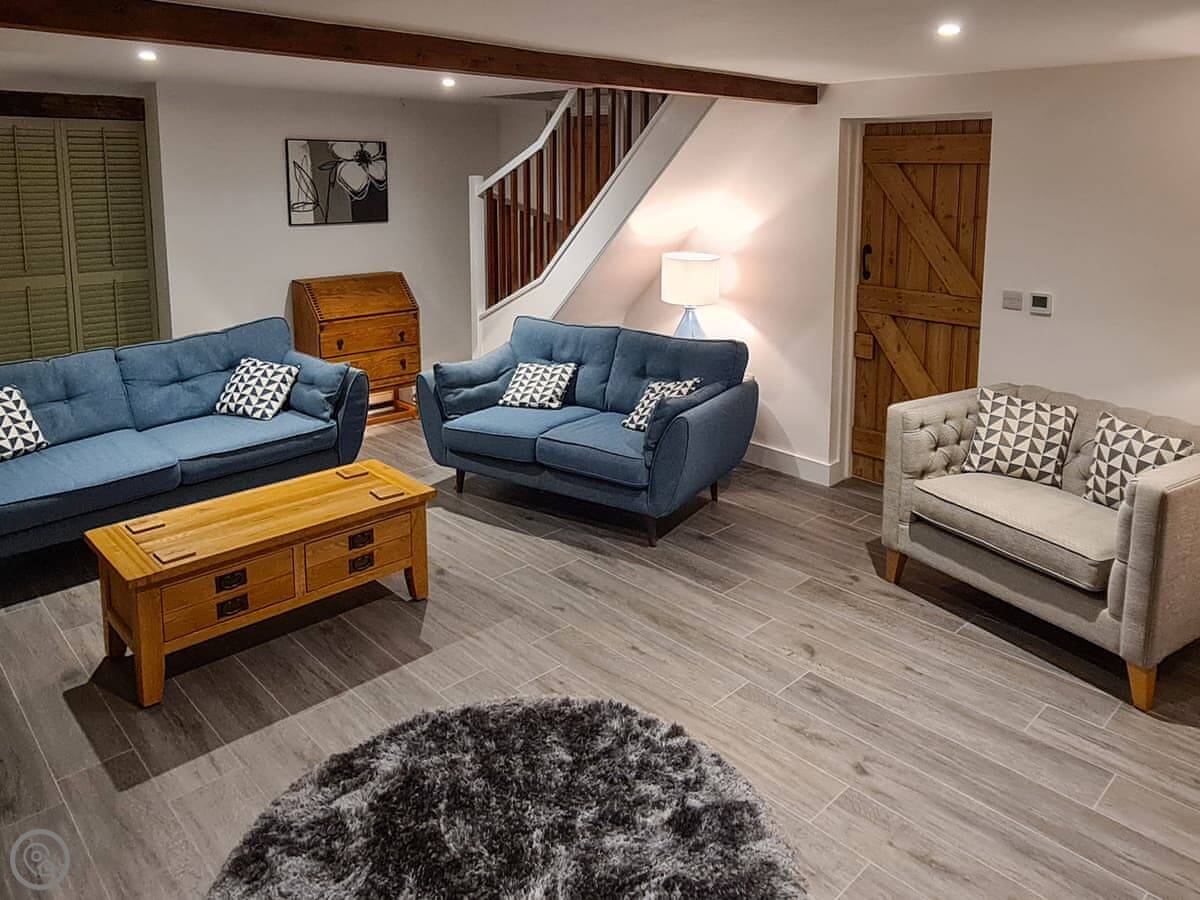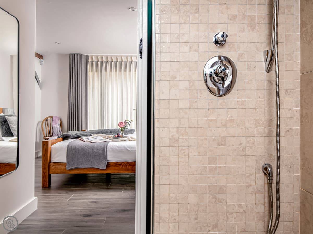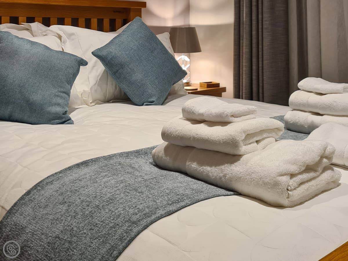 The place sleeps six. There are three bedrooms and two bathrooms. Two bedrooms are on the ground floor. One is a kingsize with its en-suite. The third bedroom is upstairs on a mezzanine looking over the kitchen. That one has its own toilet. There's another mezzanine area at the other end that's a snug with a view.