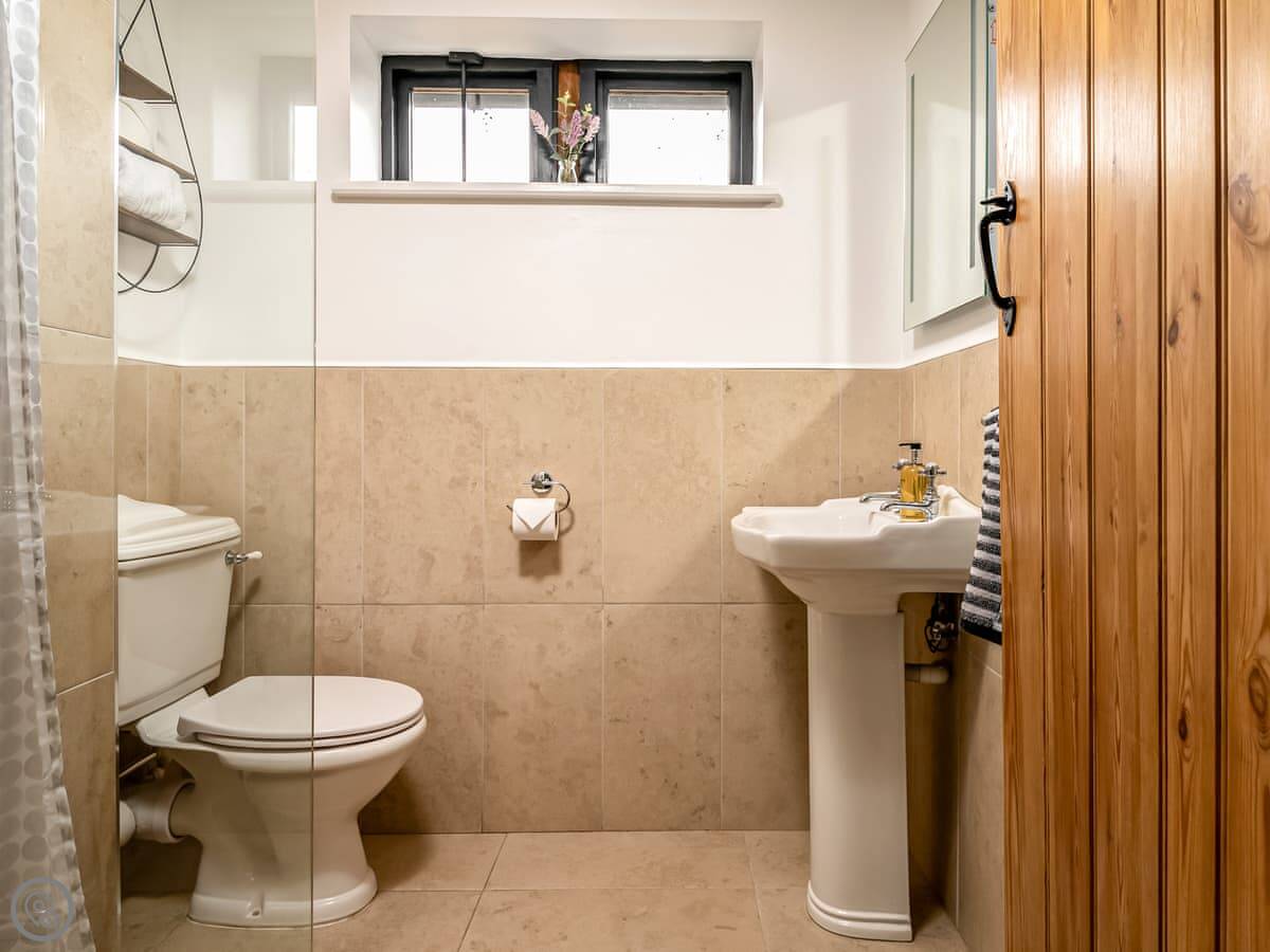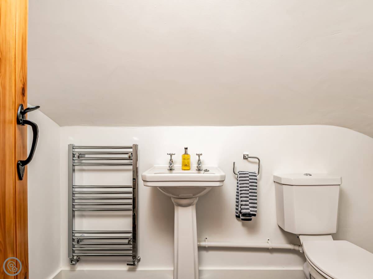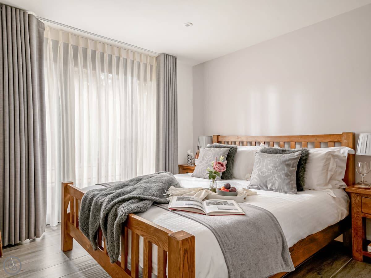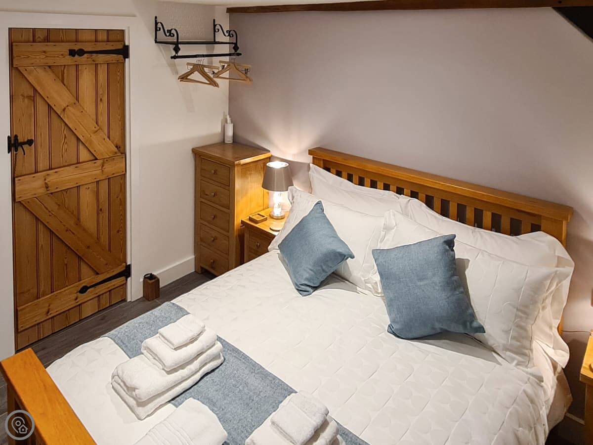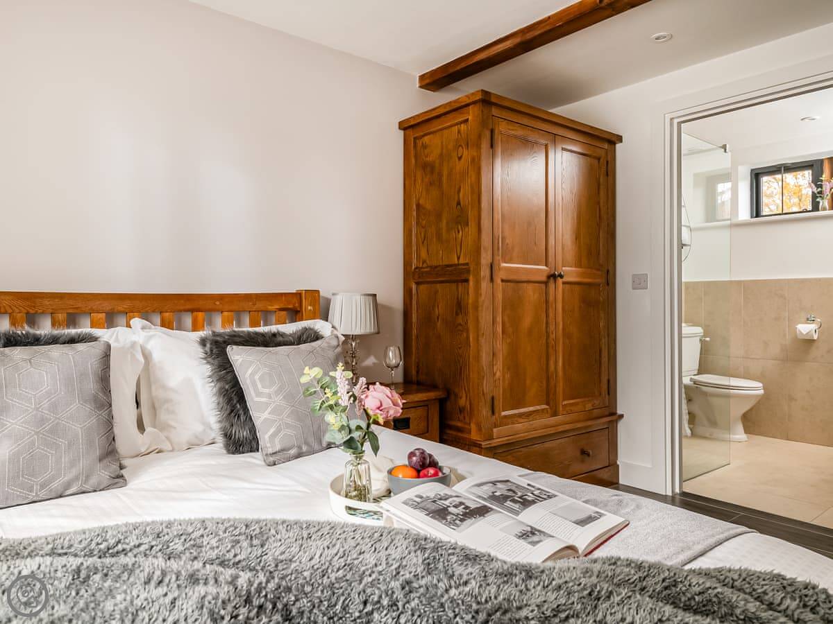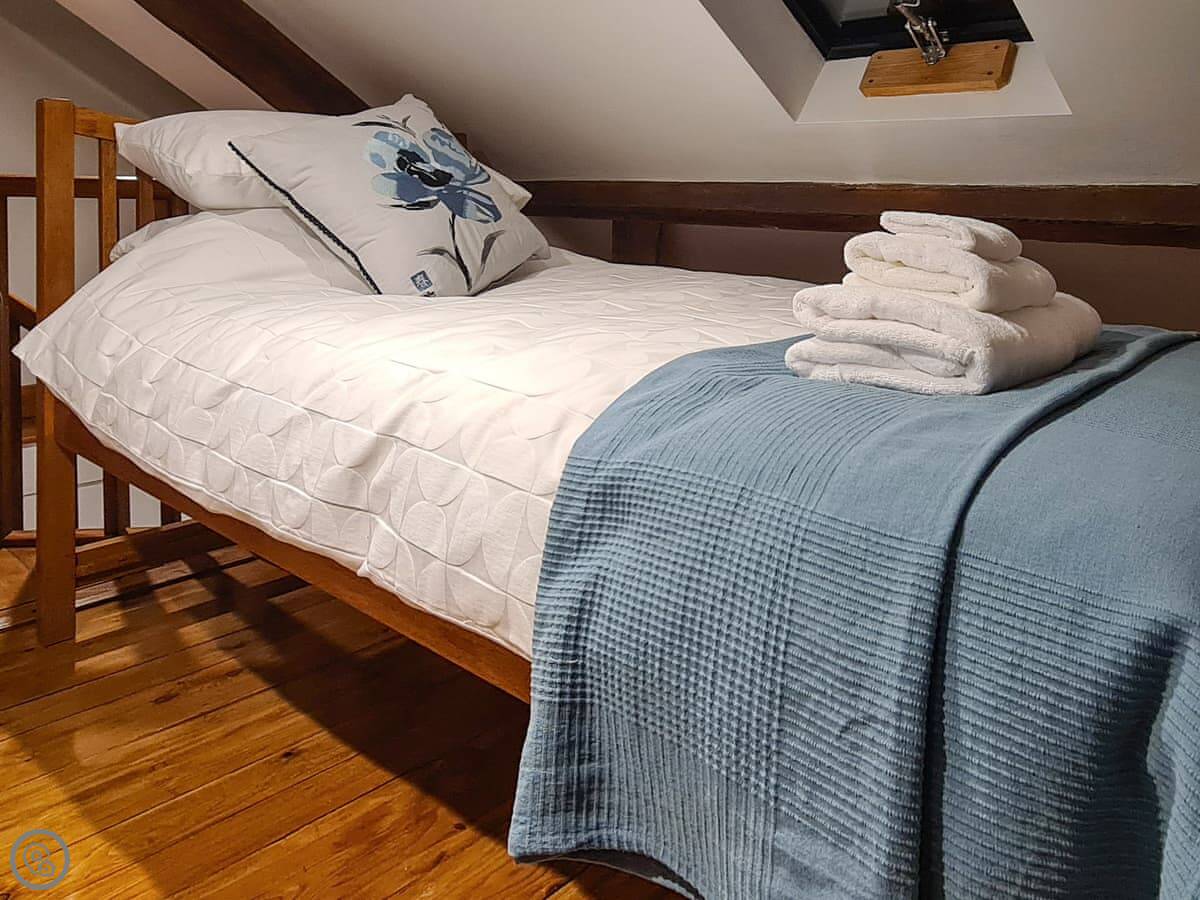 The place sleeps six. There are three bedrooms and two bathrooms. Two bedrooms are on the ground floor. One is a kingsize with its en-suite. The third bedroom is upstairs on a mezzanine looking over the kitchen. That one has its own toilet. There's another mezzanine area at the other end that's a snug with a view.