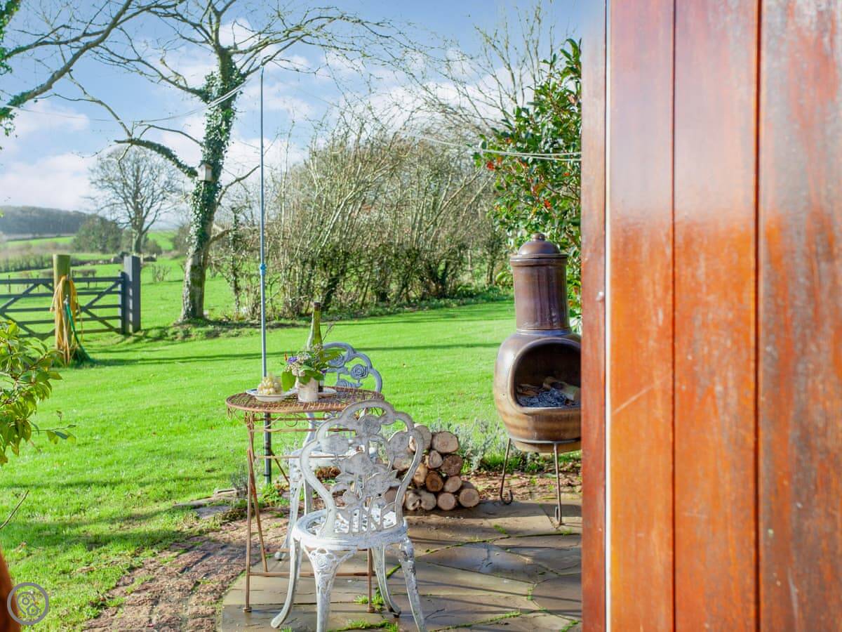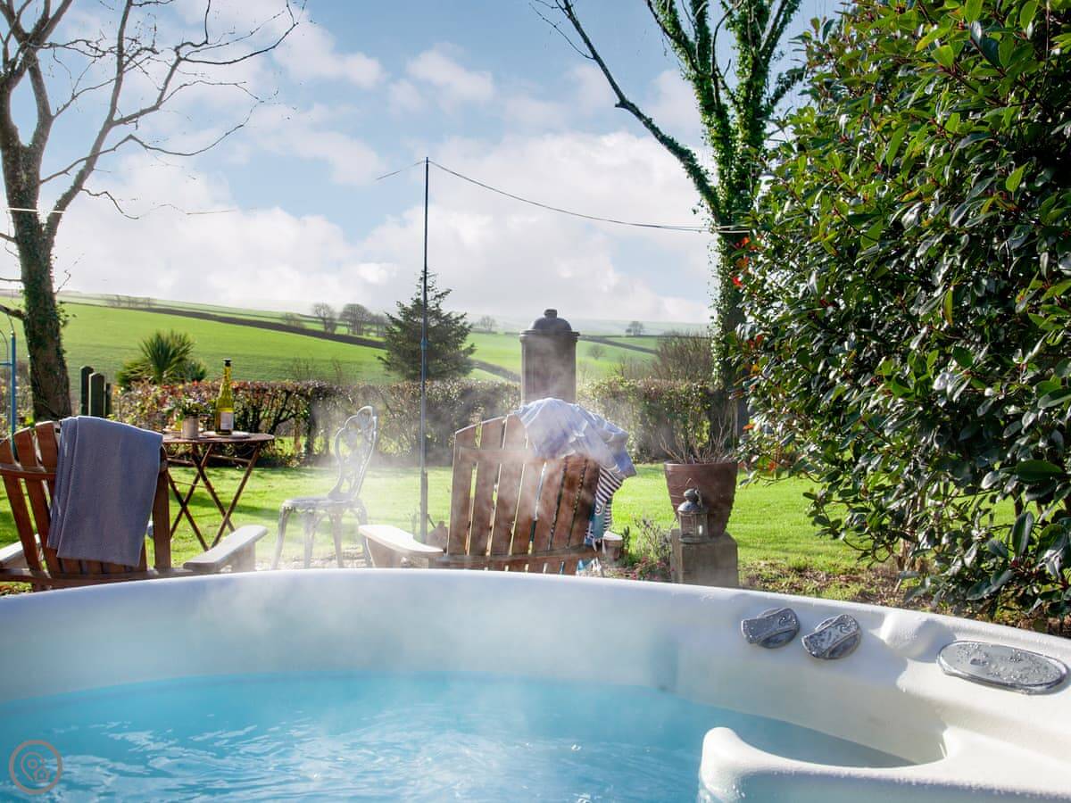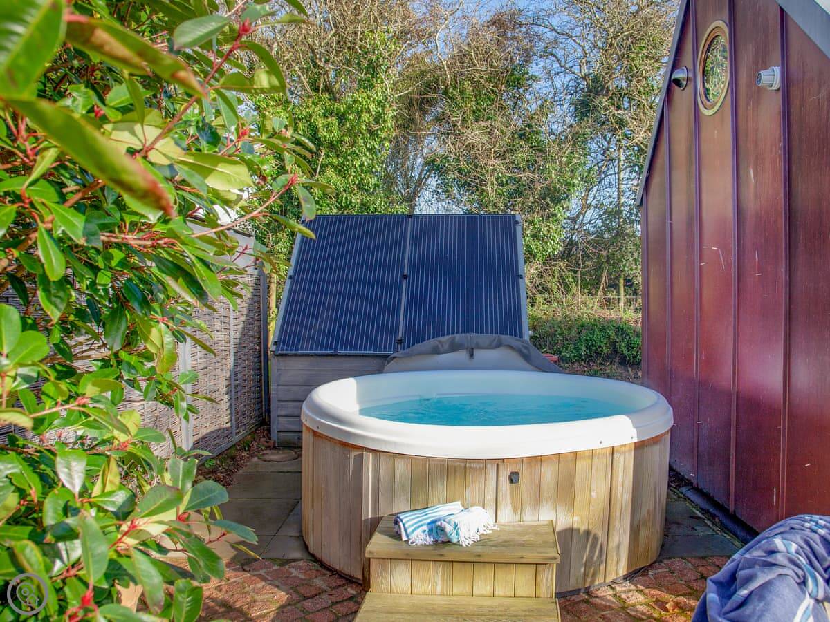 Outside, there’s a private patio area with views over the valley. It has a cedar wood hot tub.
