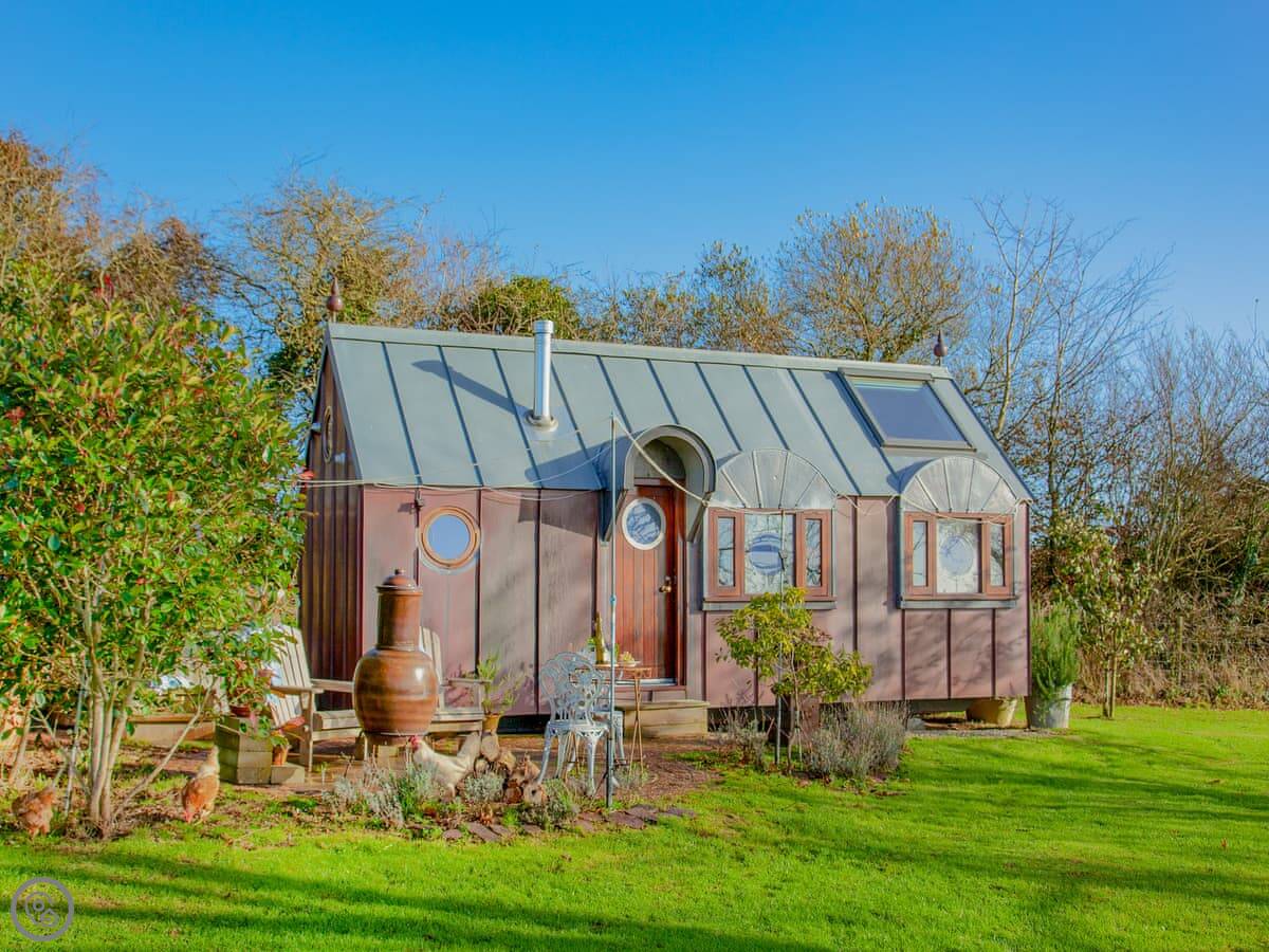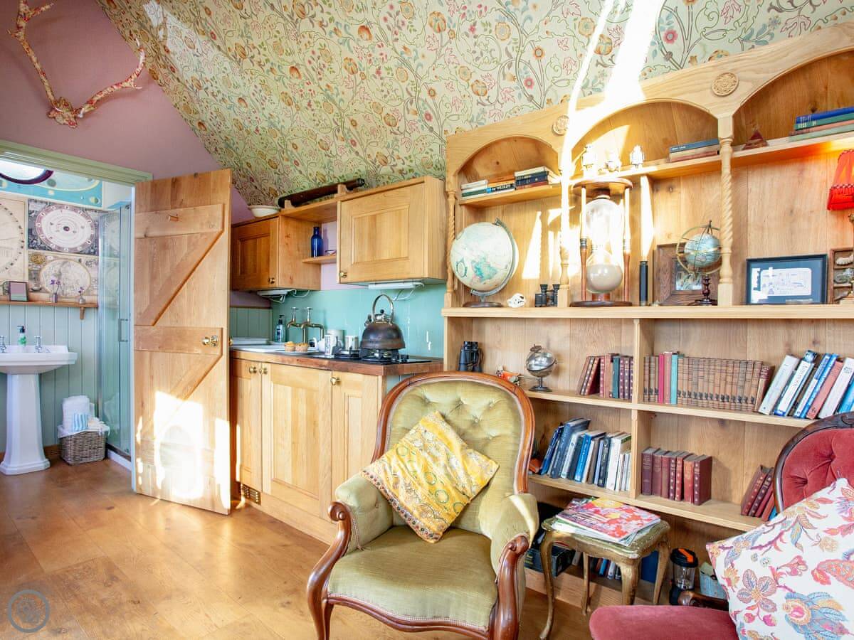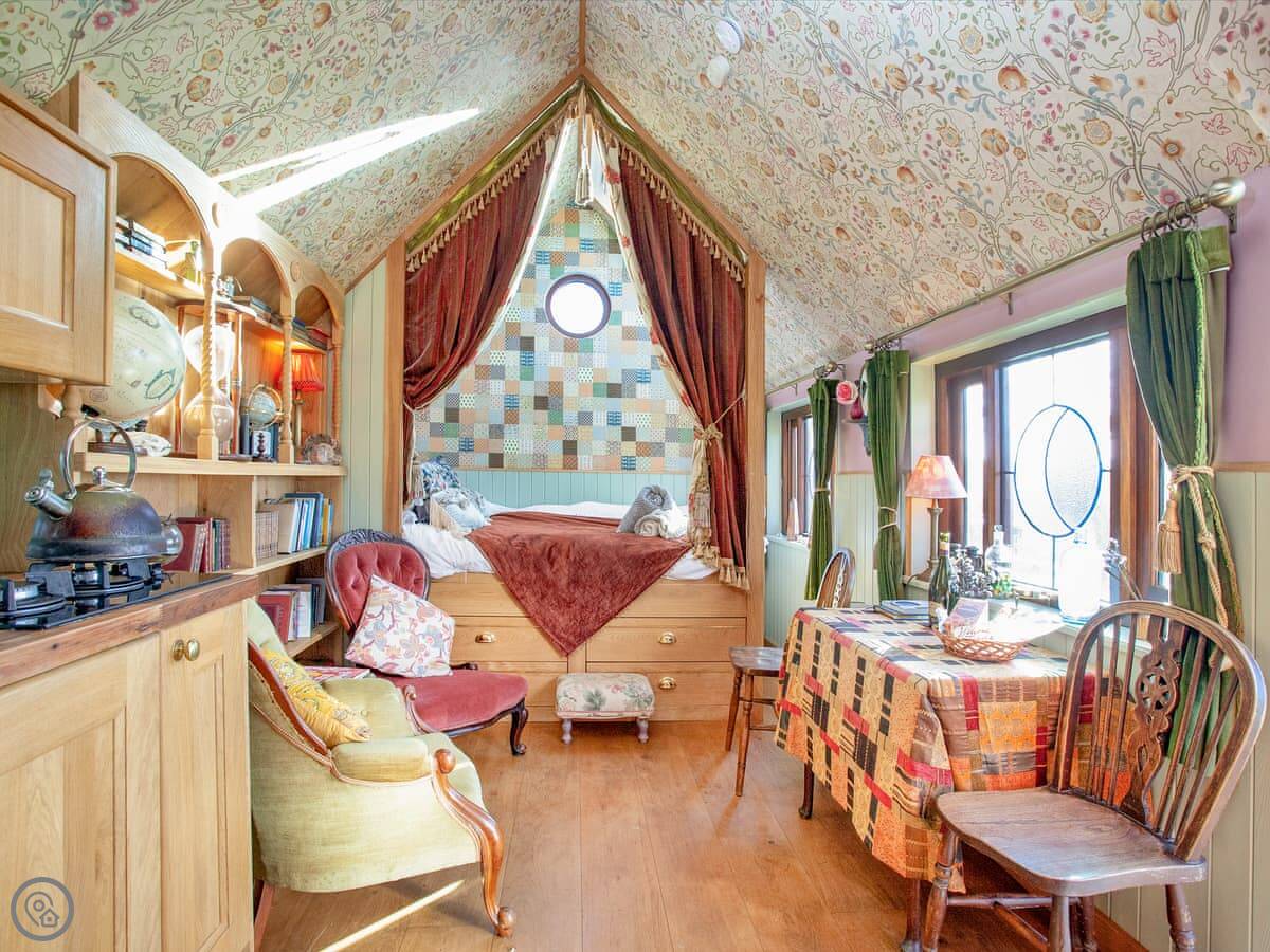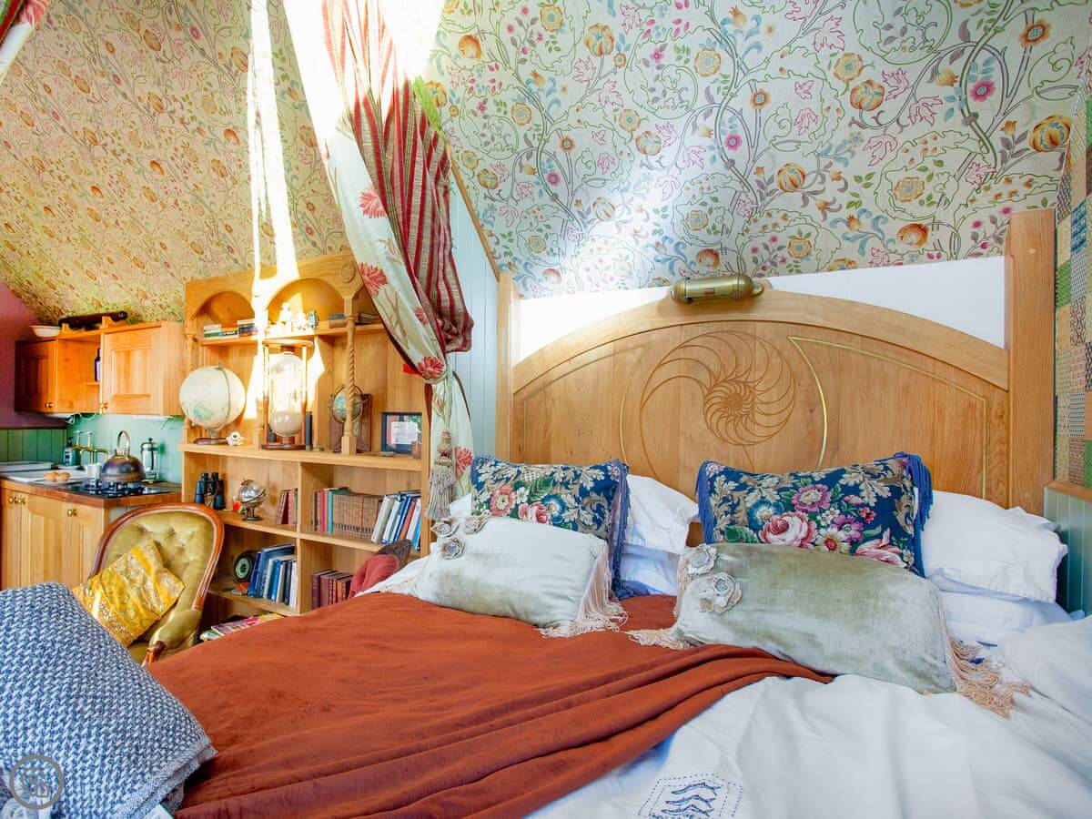The building is unusual. It’s made of copper and zinc, with coloured glass portholes. The main room is open plan. There’s a wood burner for colder nights. The bed is under a skylight, so you can look straight up at the sky from it. That’s where the name comes from.