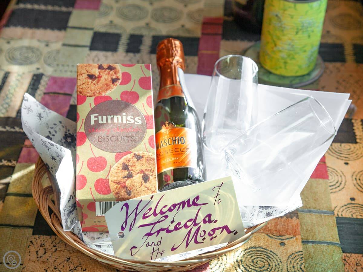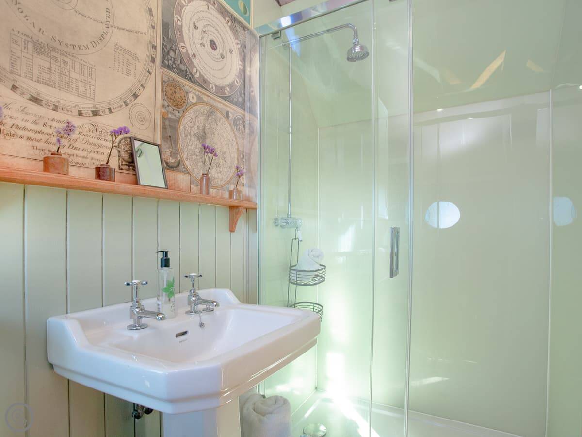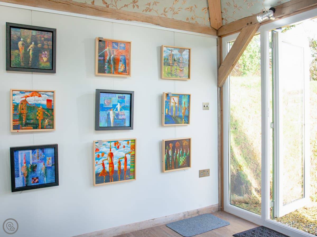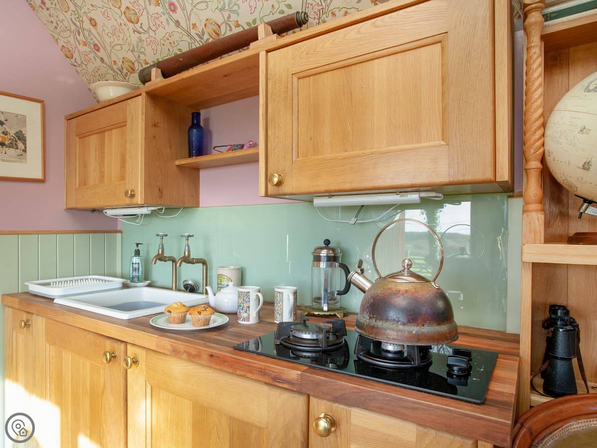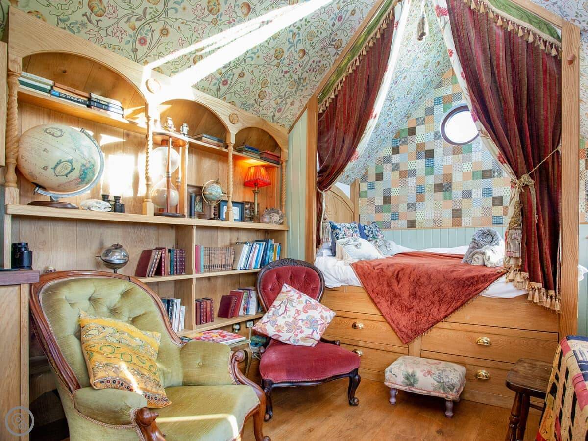 The building is unusual. It’s made of copper and zinc, with coloured glass portholes. The main room is open plan. There’s a wood burner for colder nights. The bed is under a skylight, so you can look straight up at the sky from it. That’s where the name comes from.