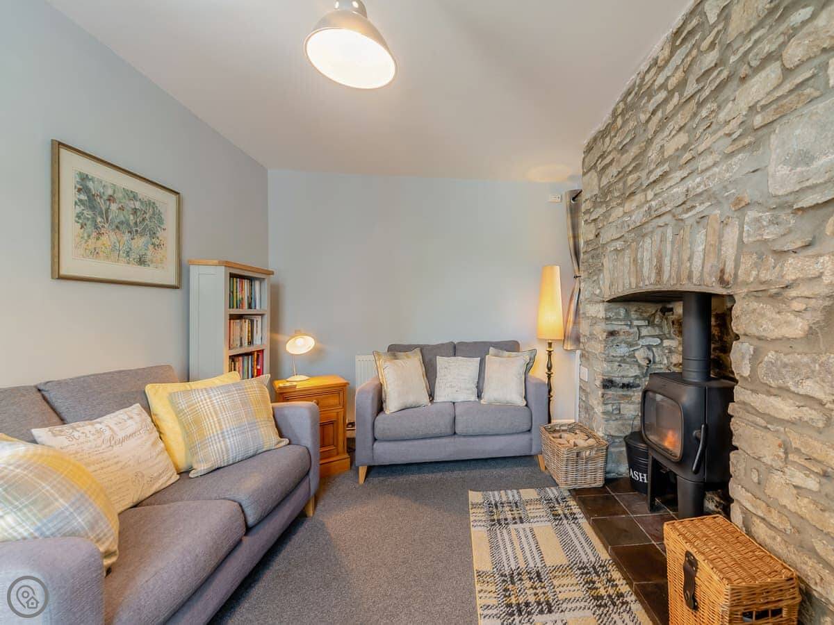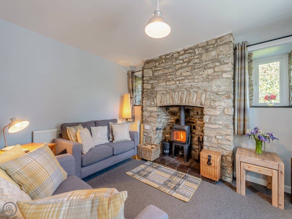 Downstairs is an open plan kitchen, dining area, and living room. There’s a woodburning stove, which is nice in the cooler months. Outside, there’s a lawned garden area. It’s a good size, but it’s not fully fenced in, so you’d need to keep an eye on dogs or kids.