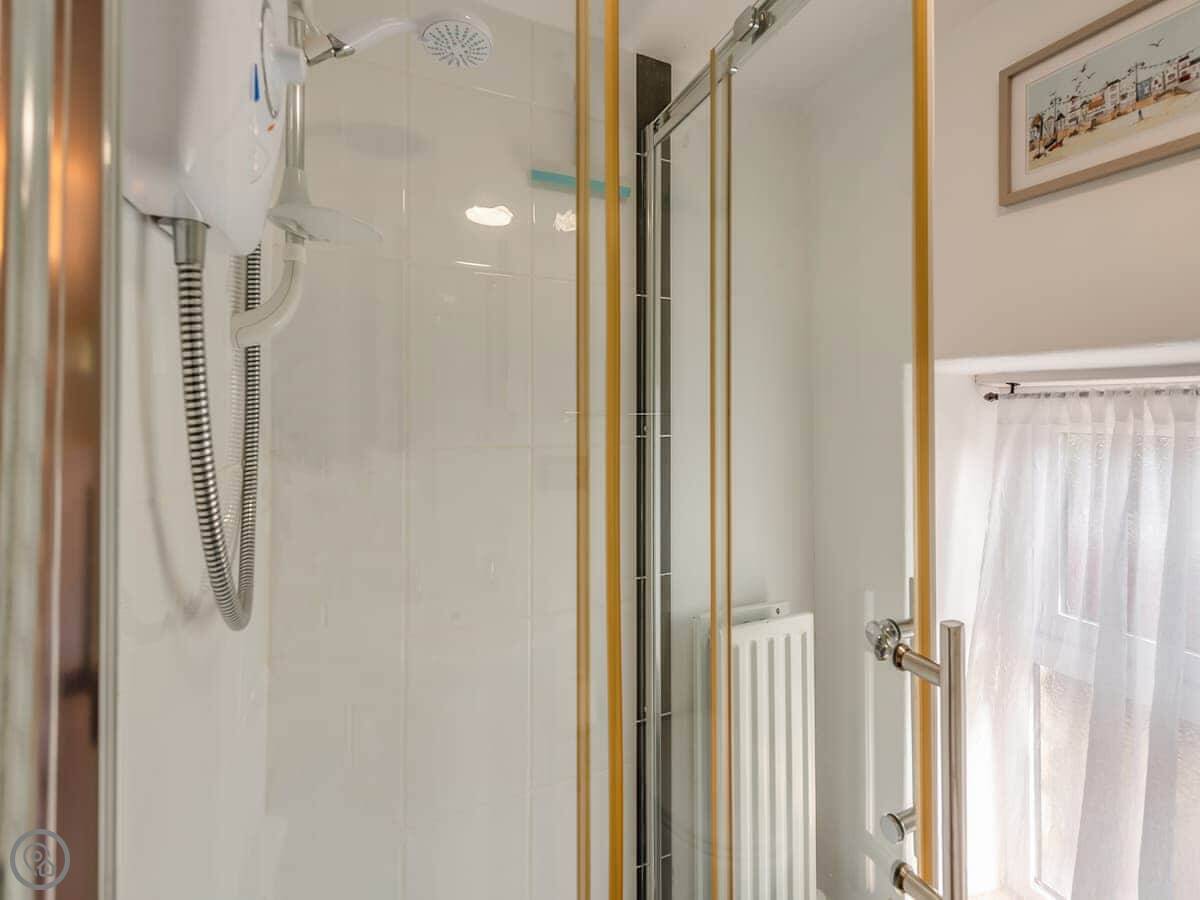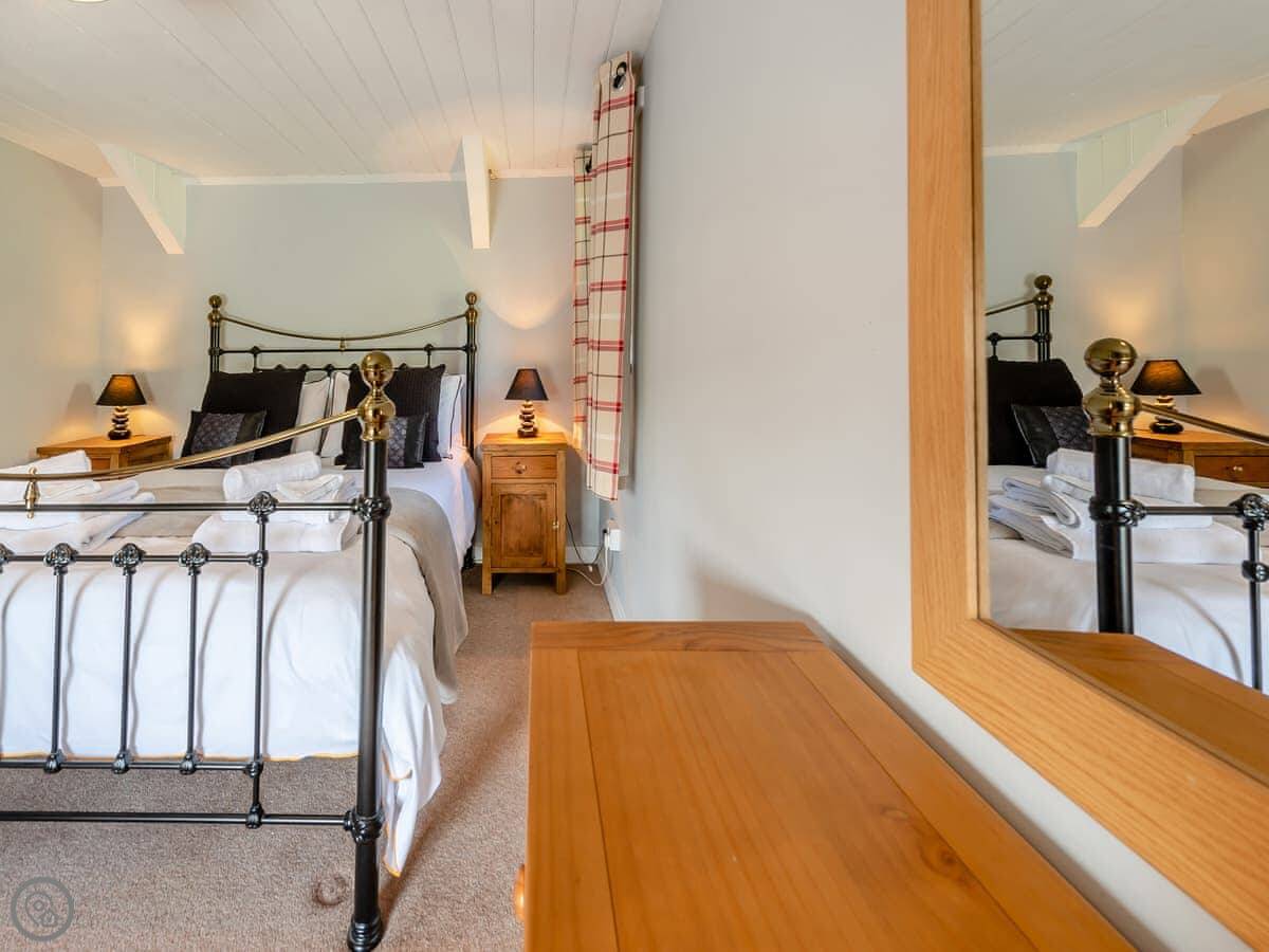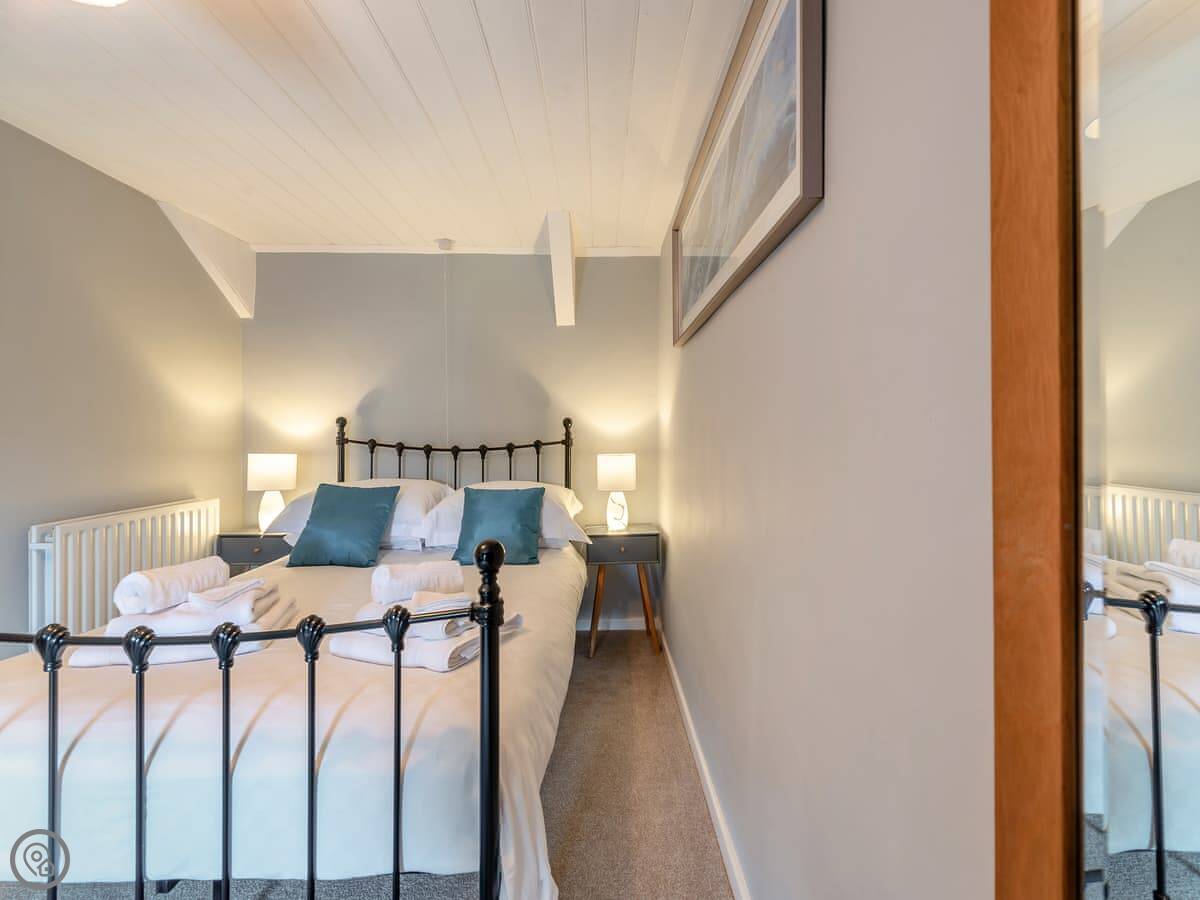It sleeps four. Two bedrooms upstairs. One is a double, the other has a super kingsize bed that can be split into two singles. There’s one shower room. It’s a 4 Star place, which means it’s been done up nicely.