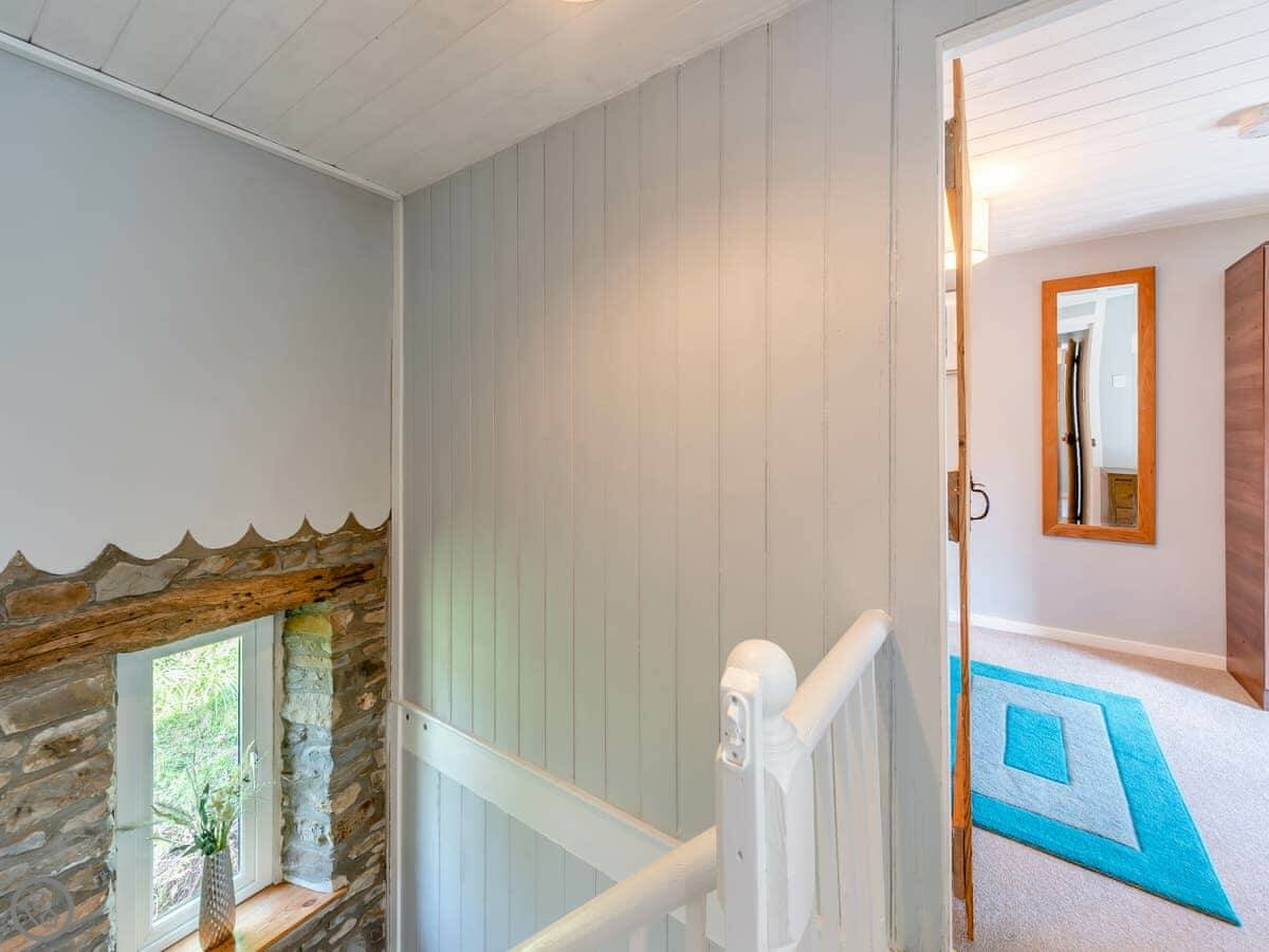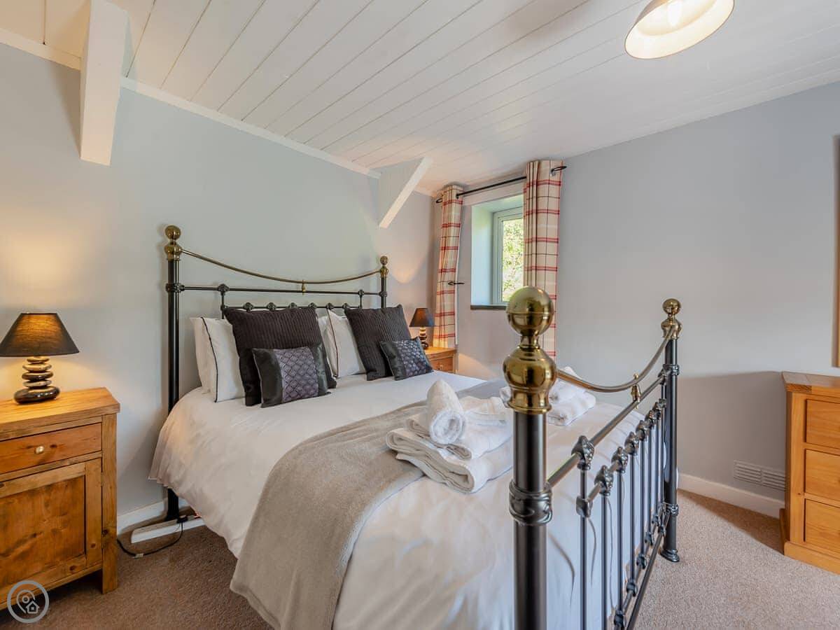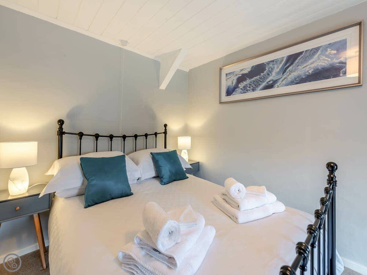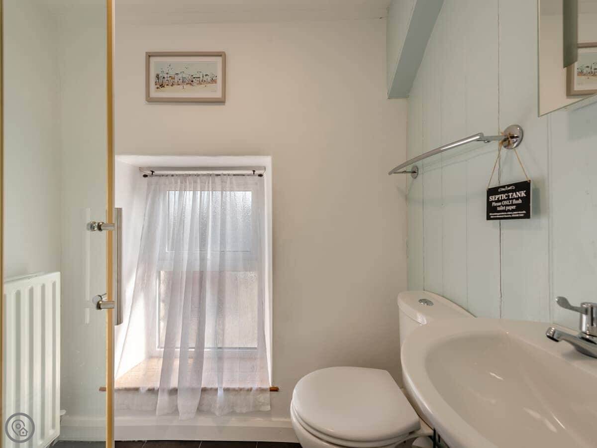 It sleeps four. Two bedrooms upstairs. One is a double, the other has a super kingsize bed that can be split into two singles. There’s one shower room. It’s a 4 Star place, which means it’s been done up nicely.