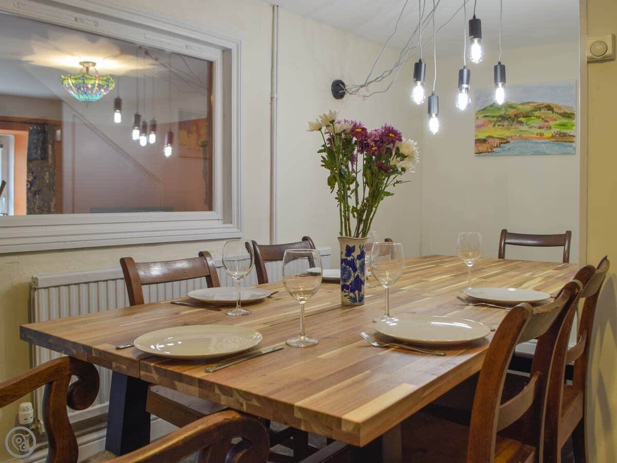 The place has got slate floors, old beams, and stone walls. There's a wood burner in the front room. The kitchen is decent, with a dishwasher and washing machine. There's a separate dining room and a small games room upstairs with books and board games. The main bathroom is downstairs.