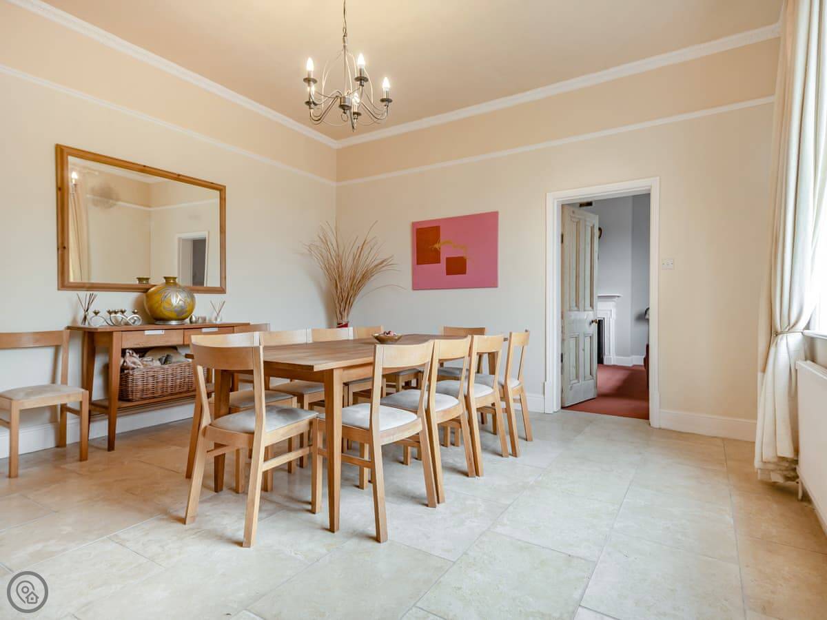 The place is large. There's a formal dining room, a big sitting room, and a smaller snug where the TV is. The owners used to live here, so it's set up for real life, not just for show. The rating is 4 Star. It's comfortable.