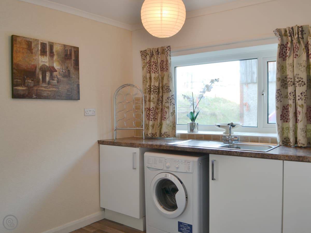 Inside, there's a kitchen with a table, a living room, and a utility room with the washing machine. We've also put a desk in the small back room if anyone needs to work. The wifi handles video calls.