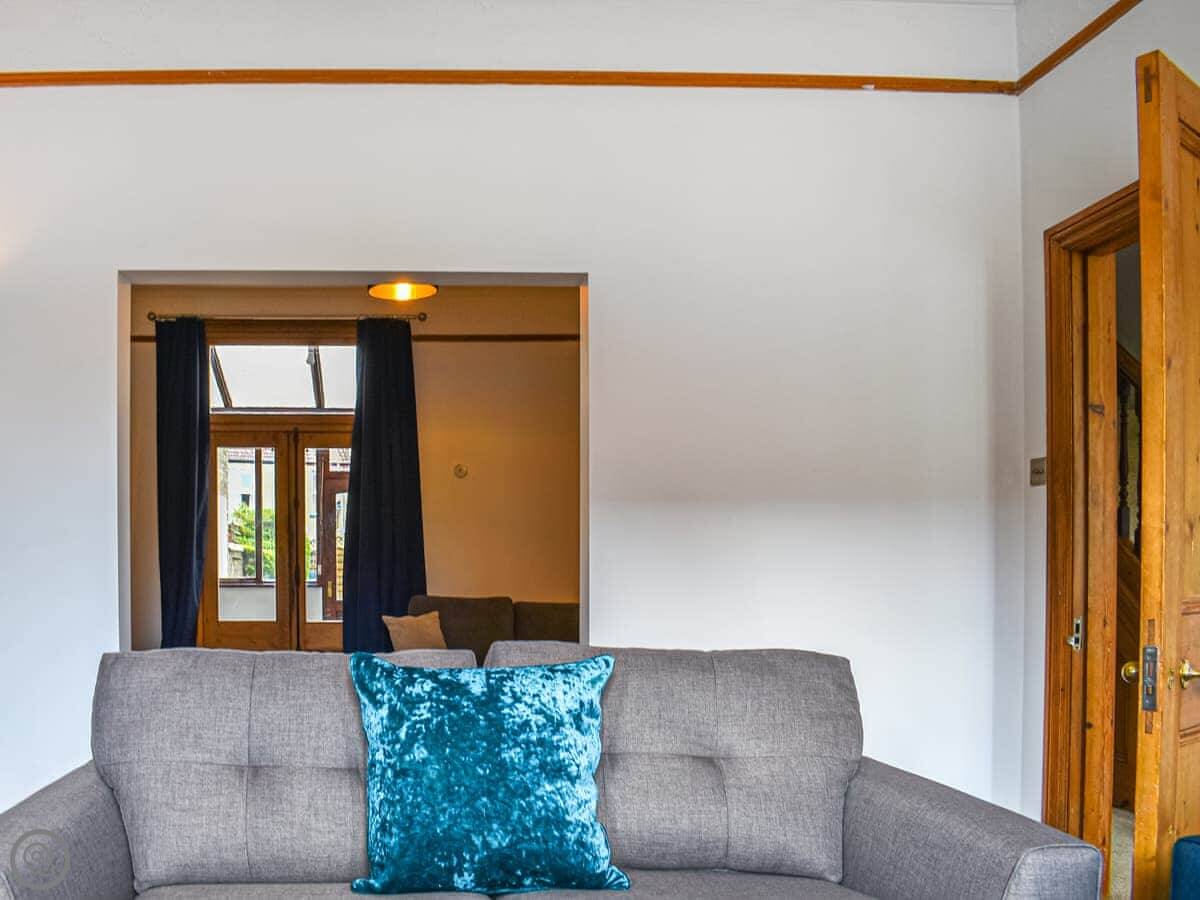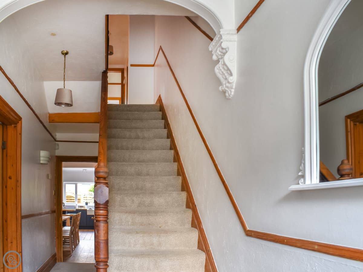 Inside, there's an entrance hall for coats, a dining room, and two separate living rooms. One is more of a sitting room. The stairs are normal house stairs.