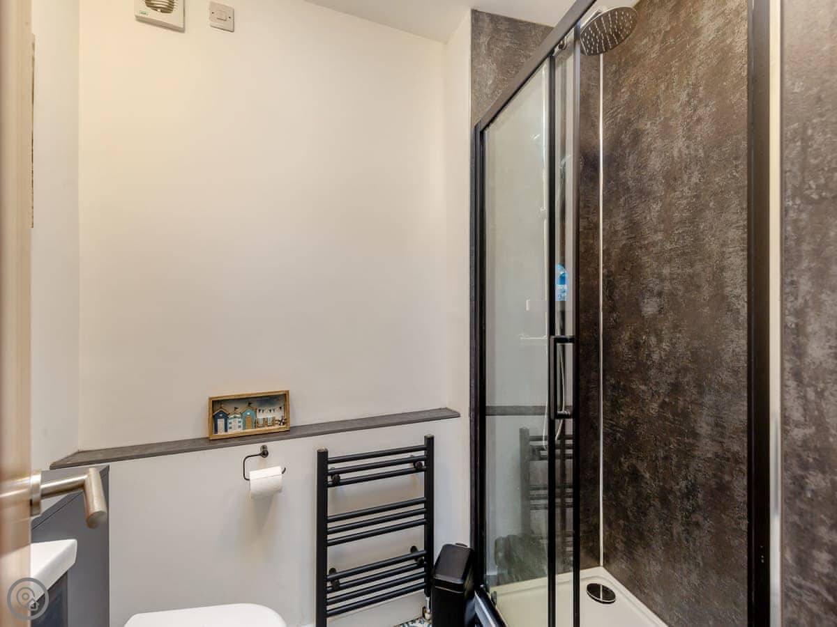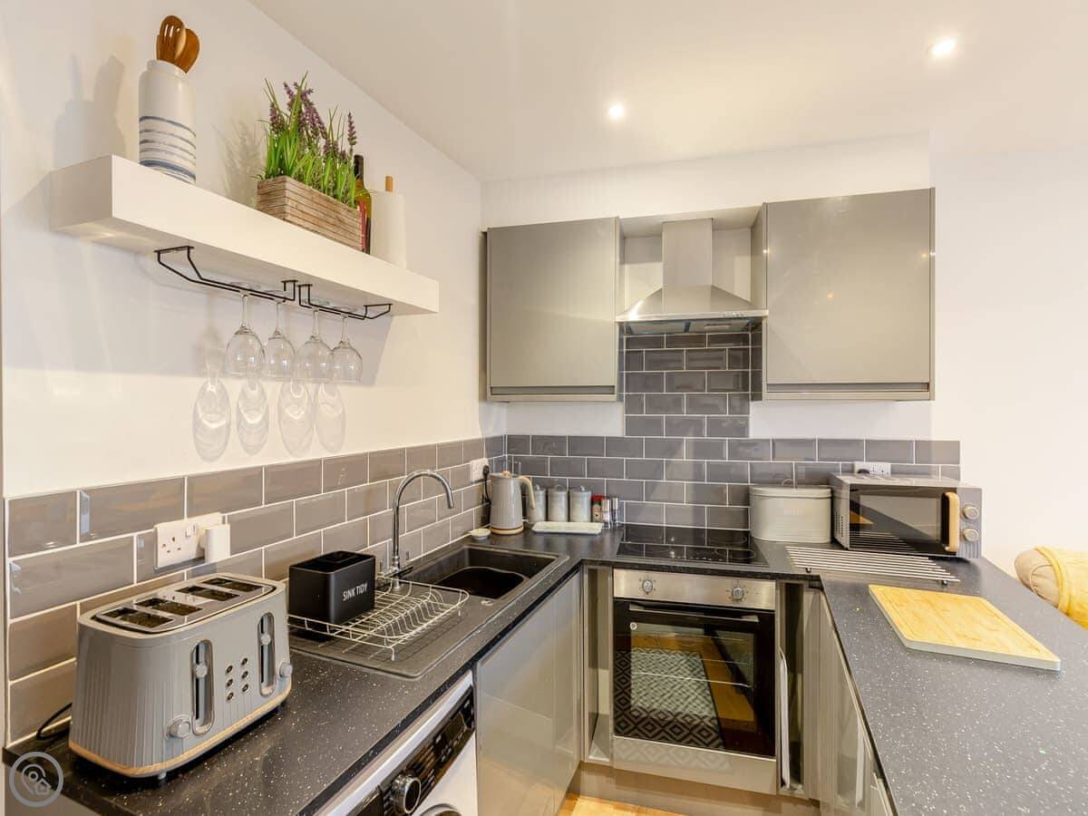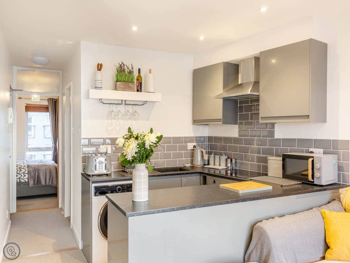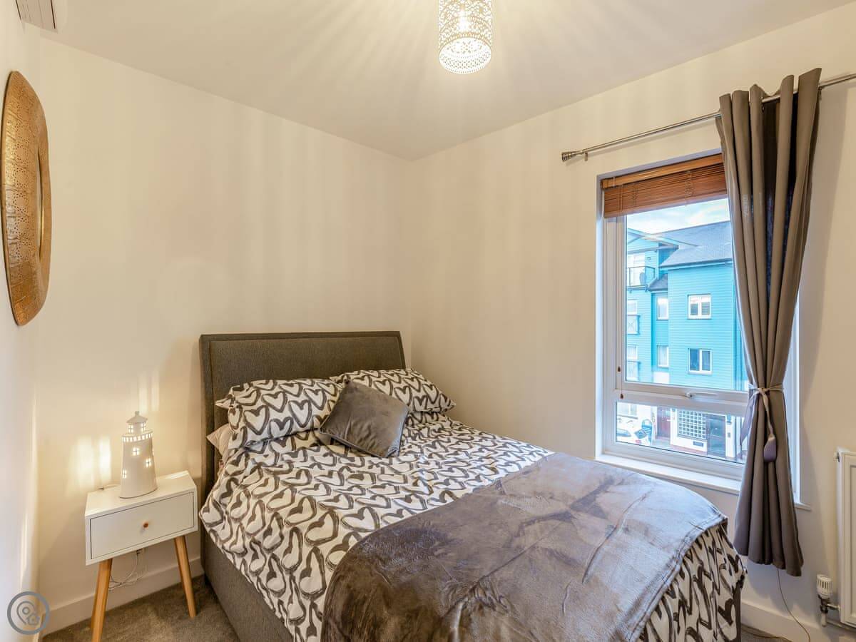 It sleeps two. One bedroom, one shower room. It's a 4 Star place, so it's been done up well. It feels clean and modern. The main room has sliding doors out to a small balcony. You can sit out there. It catches the sun in the morning.