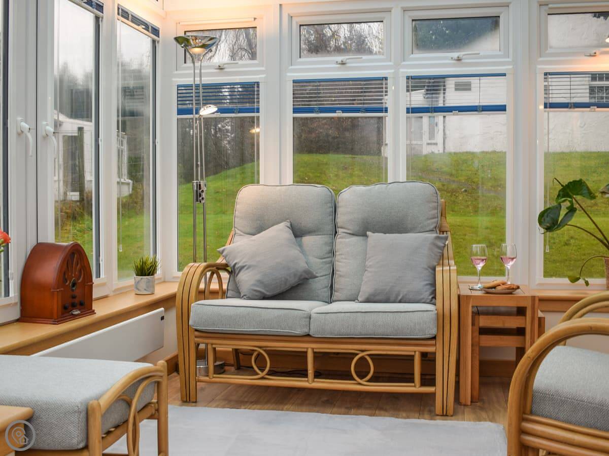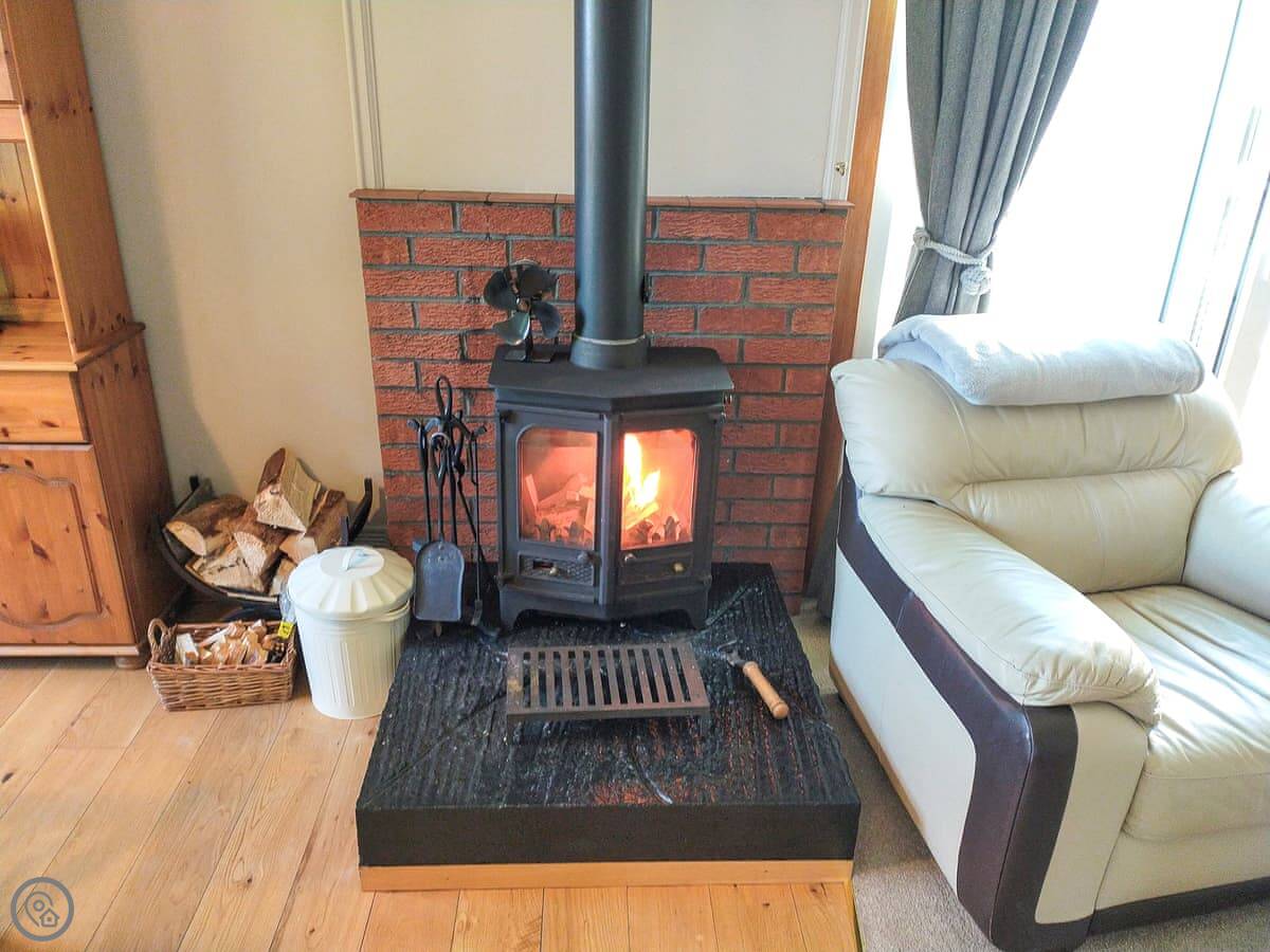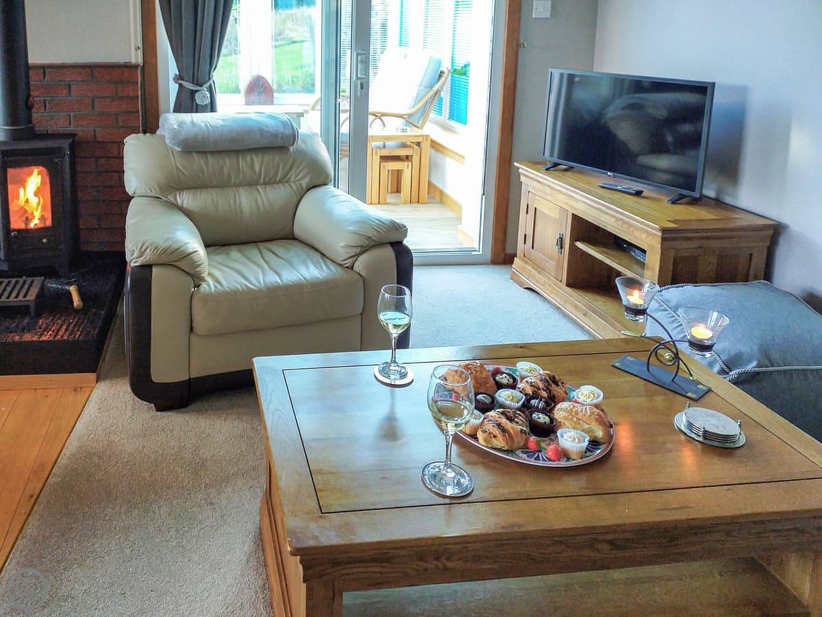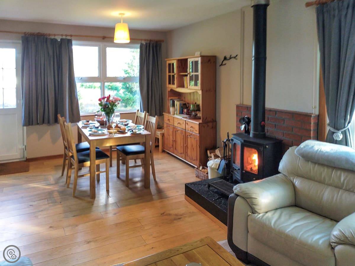 The main room is open plan, with the living area, dining space, and a small kitchen off to the side. The kitchen has what you need. There's a wood burner in the living room. That leads into a conservatory. It's a good spot to sit and look out at the pine trees. You see deer and squirrels sometimes.