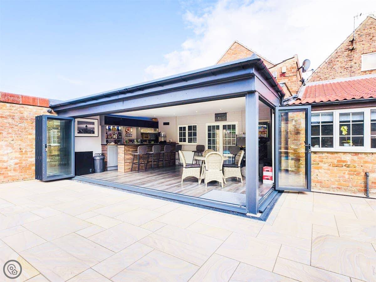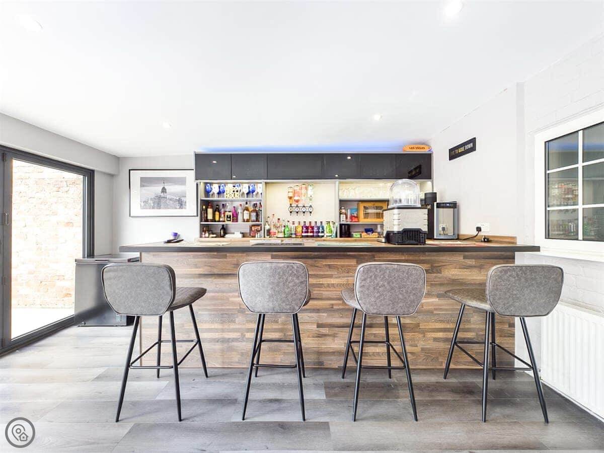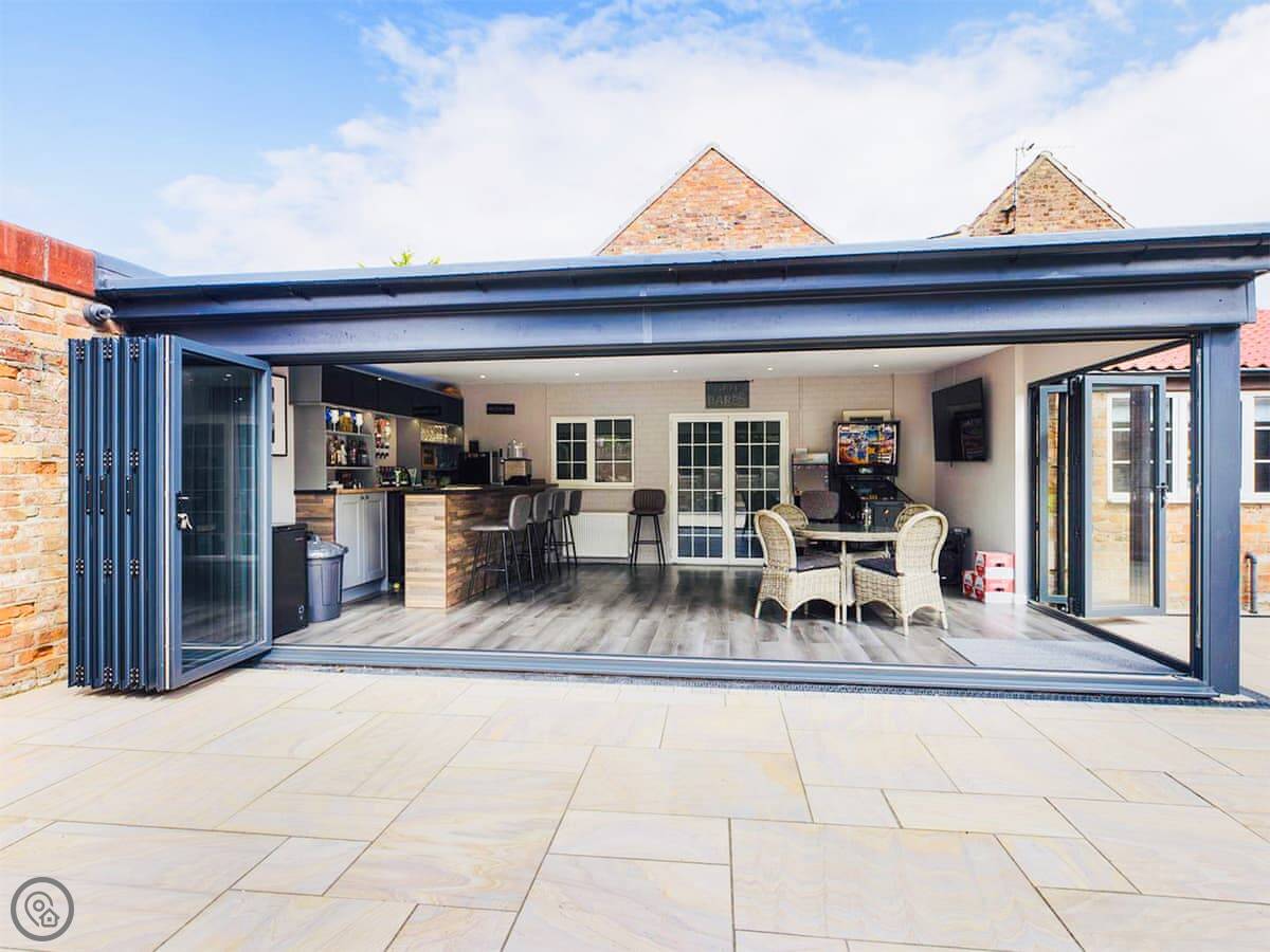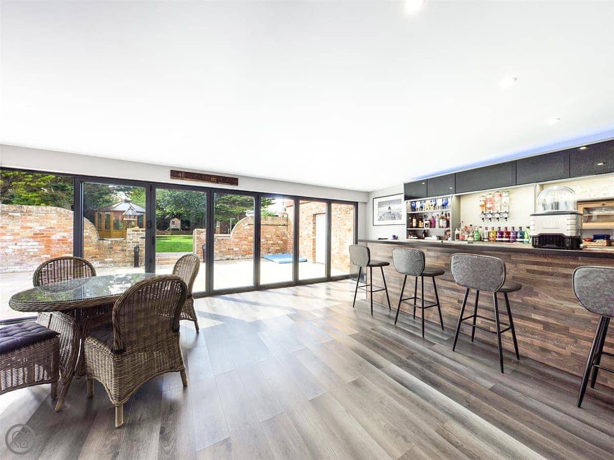The pool is indoors, private, and leads off the kitchen. There's a shower right there for before you swim. The sun room has bifold doors out to the garden, a bar with optics, and another TV. It's a good space.