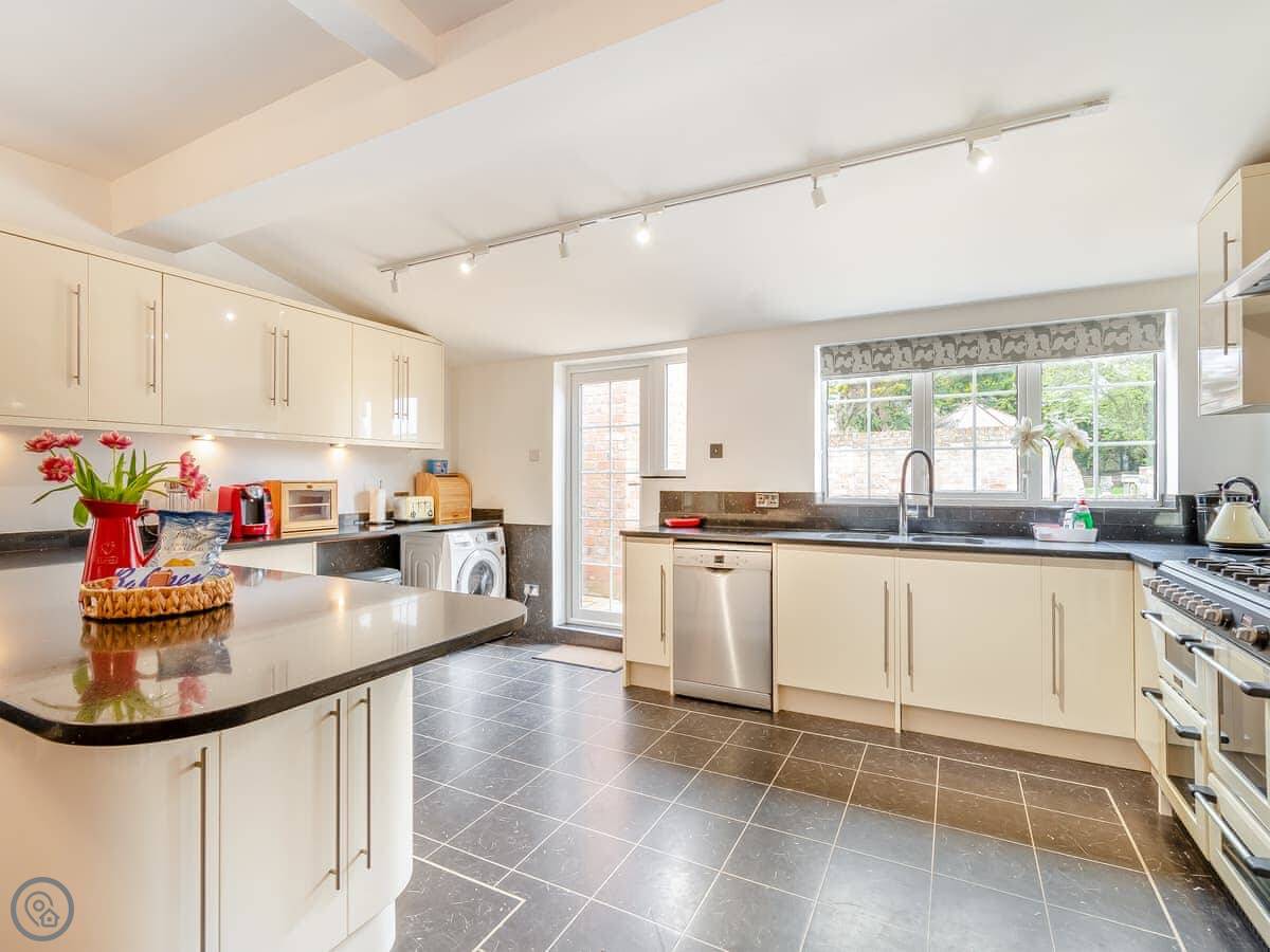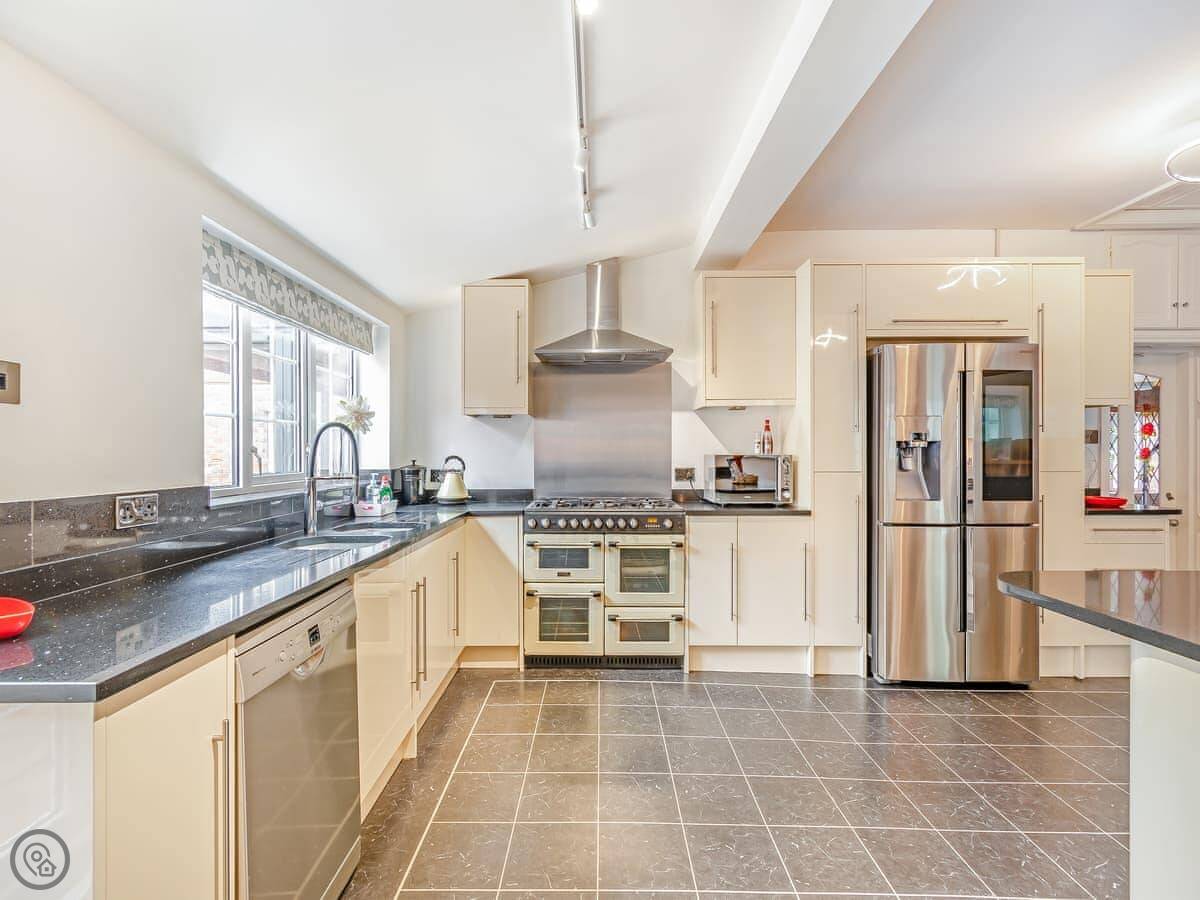 Inside, the kitchen is big with a range cooker and a Belfast sink. There's a breakfast bar and a seating area. The dining room has exposed beams. The main living room has a Smart TV with Netflix and Disney Plus.