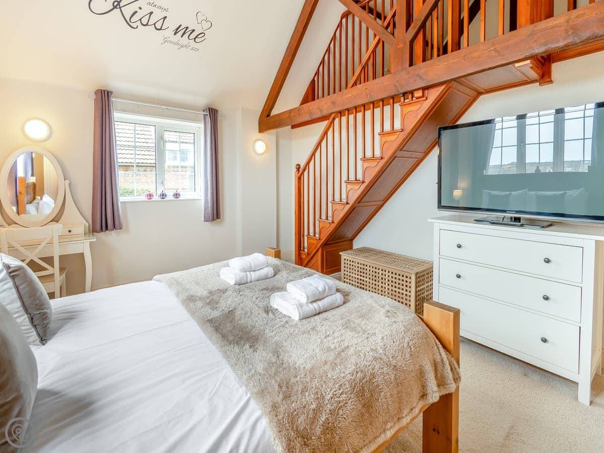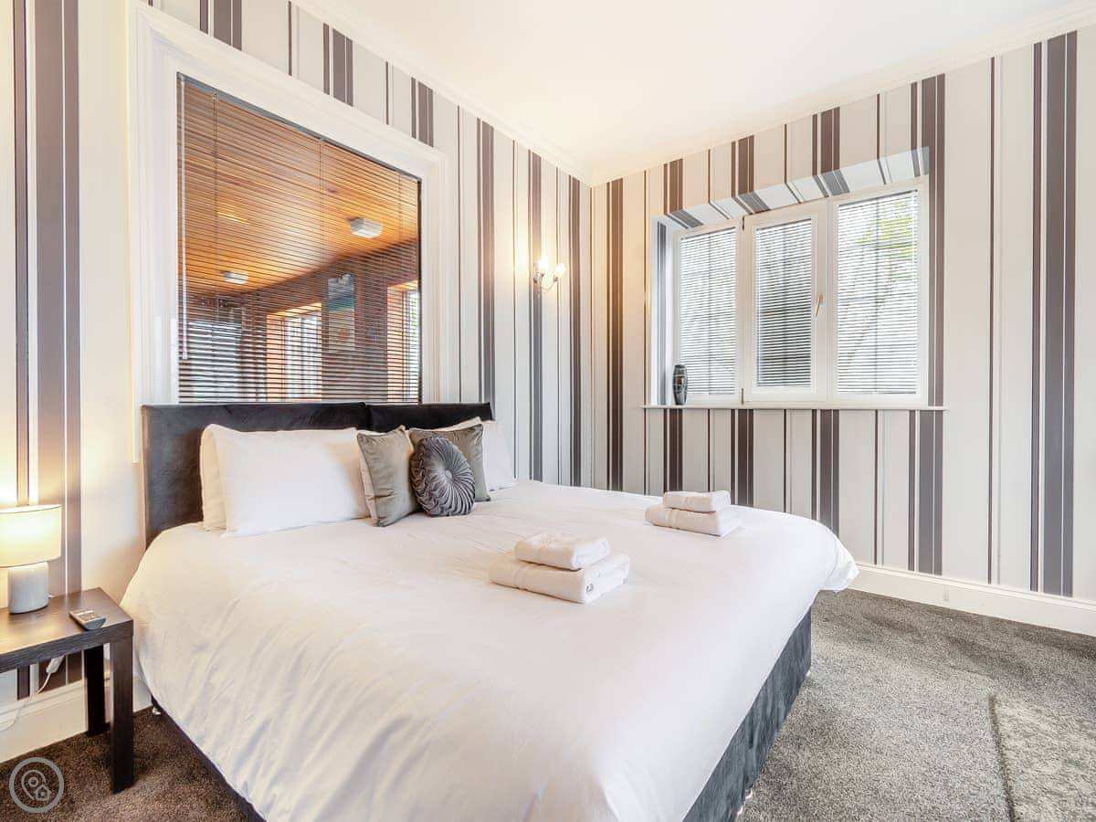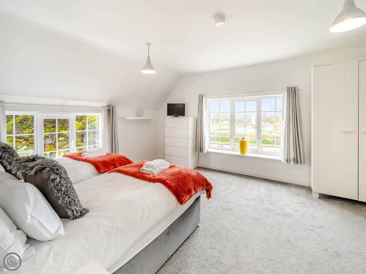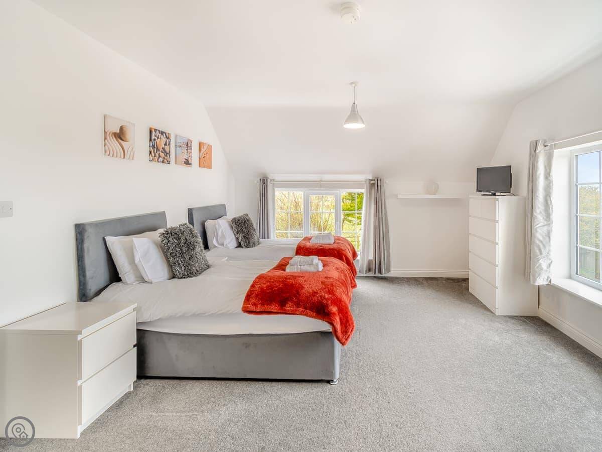 There's a ground floor bedroom with a super king-size bed that can be split into twins. That's useful if stairs are a problem. That room has its own wet room shower.