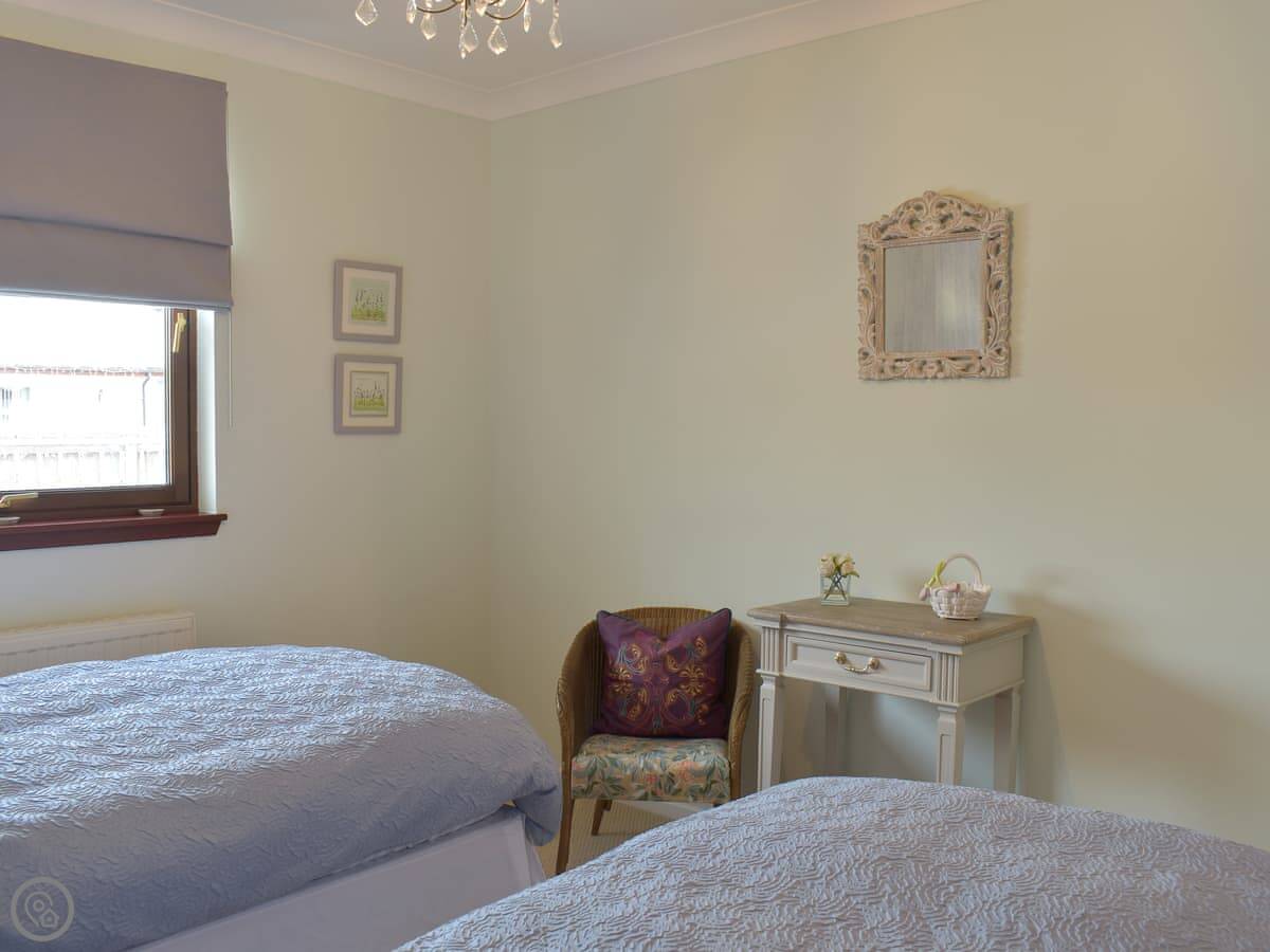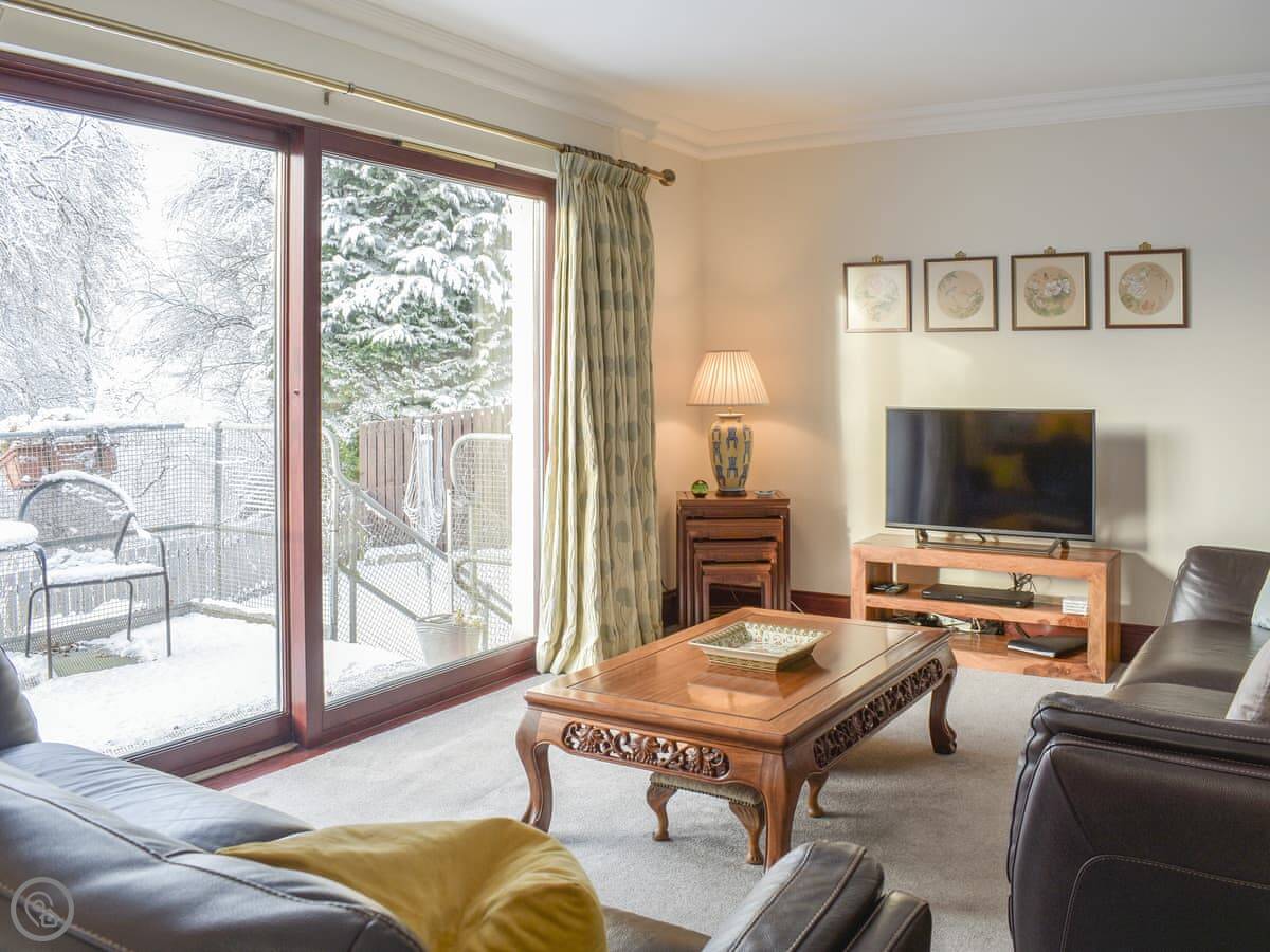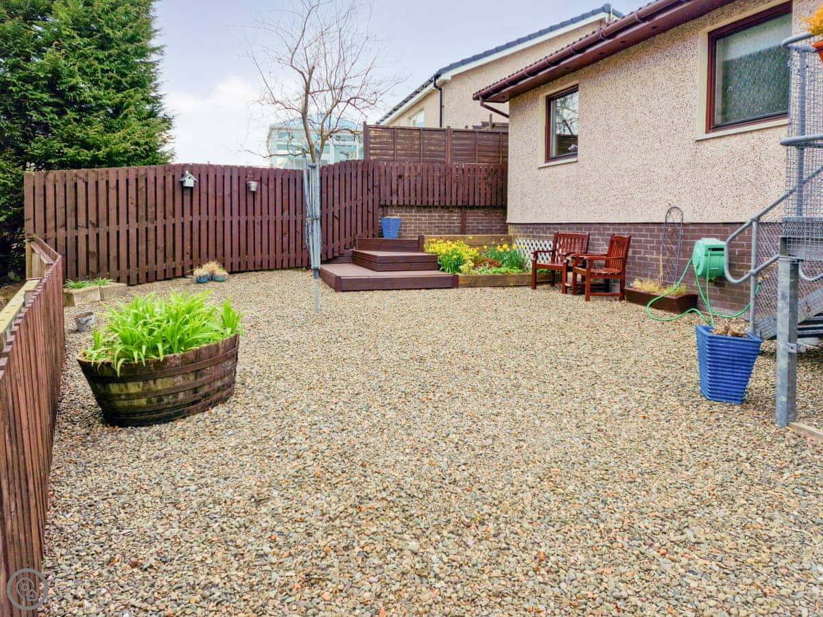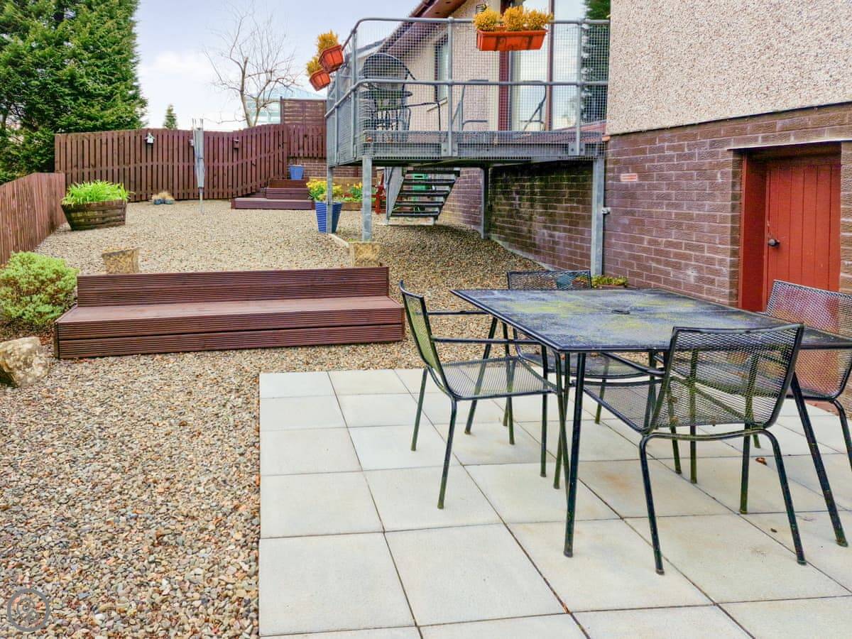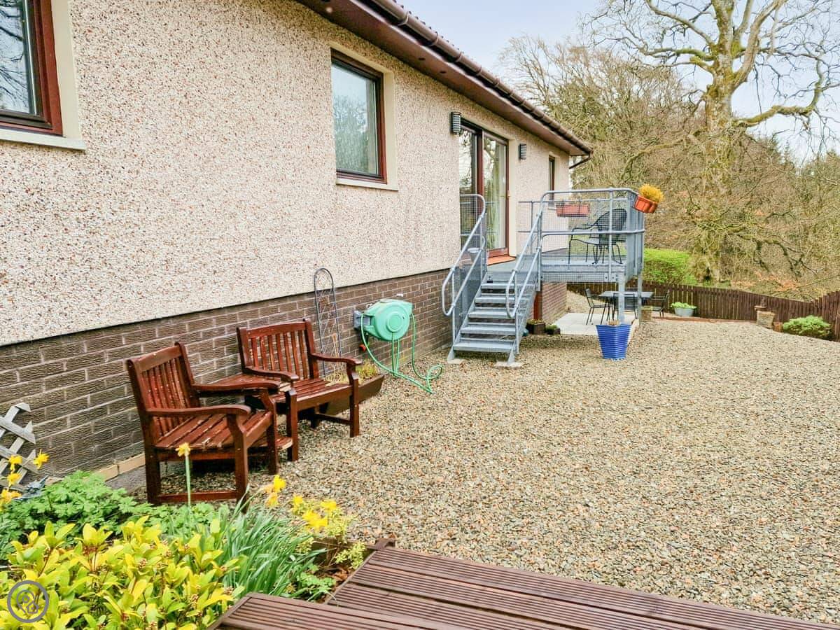 The accommodation is all on the ground floor albeit accessed by three steps from the front and then three steps down from the metal balcony in the rear garden. The property sleeps four in the two bedrooms, the larger being fitted as a double with a super kingsize bed and the second with twin beds. The kitchen has a dining table and the spacious sitting room also has a dining area as well as views across the garden to the trees as the ground slopes down to the Mousewater Burn. Patio doors open onto a metal balcony which leads down to a garden and patio area.