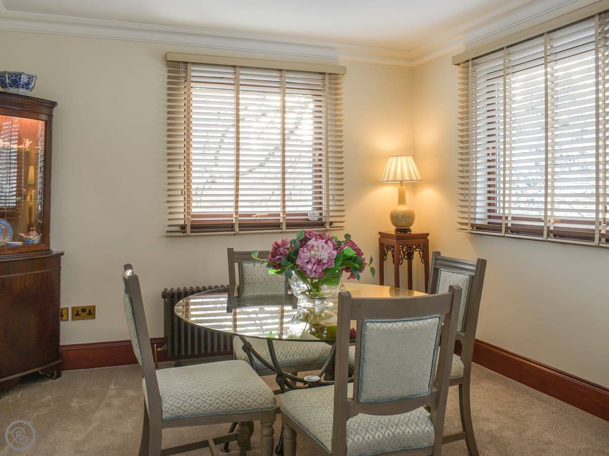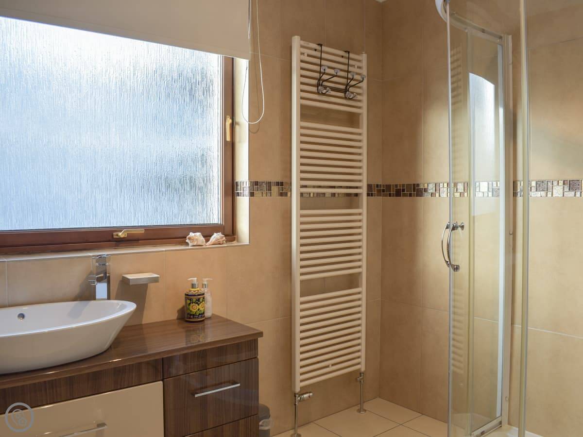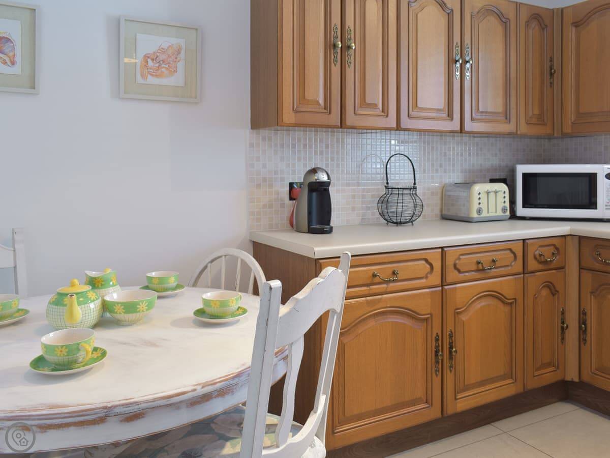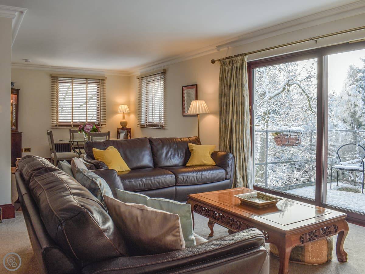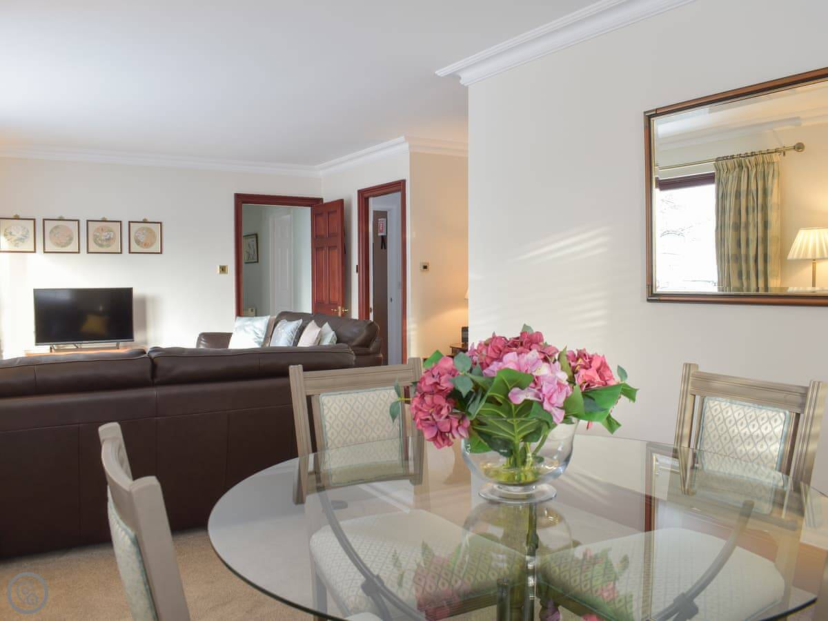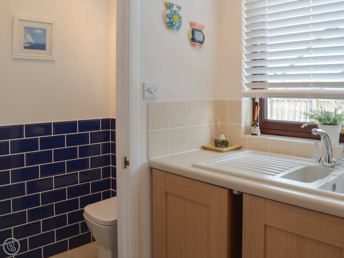 The accommodation is all on the ground floor albeit accessed by three steps from the front and then three steps down from the metal balcony in the rear garden. The property sleeps four in the two bedrooms, the larger being fitted as a double with a super kingsize bed and the second with twin beds. The kitchen has a dining table and the spacious sitting room also has a dining area as well as views across the garden to the trees as the ground slopes down to the Mousewater Burn. Patio doors open onto a metal balcony which leads down to a garden and patio area.
