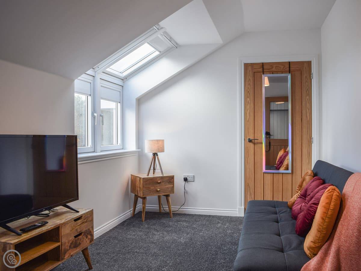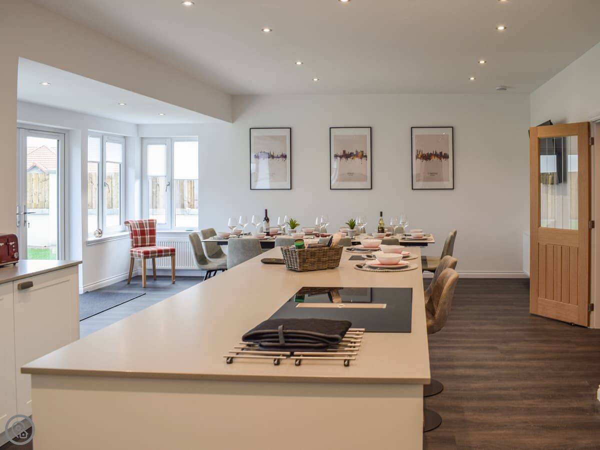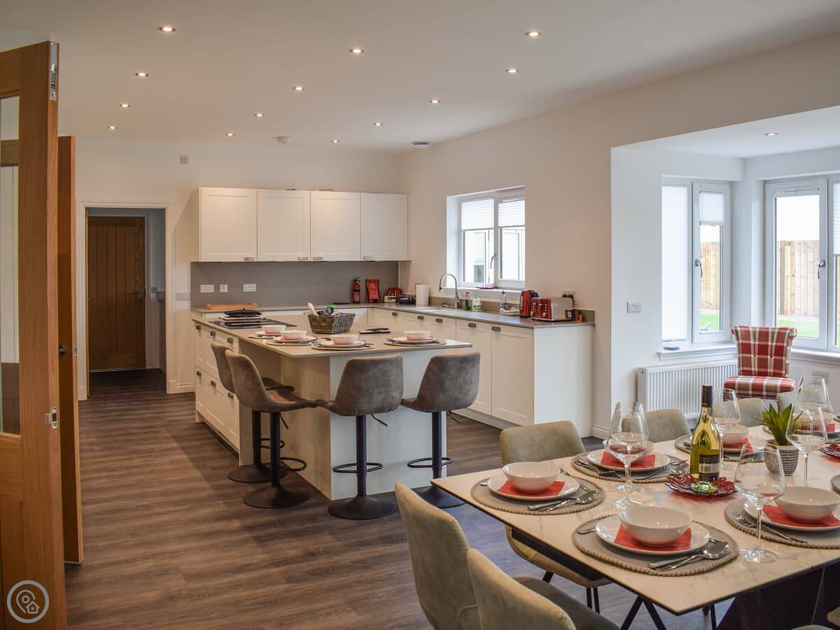 There's a large living room with a big TV. The kitchen has a central island with stools. Upstairs, there's a second TV room with a sofa bed and a Playstation. There's a utility room with a washing machine. Bedding and towels are included. We provide a cot and a highchair.