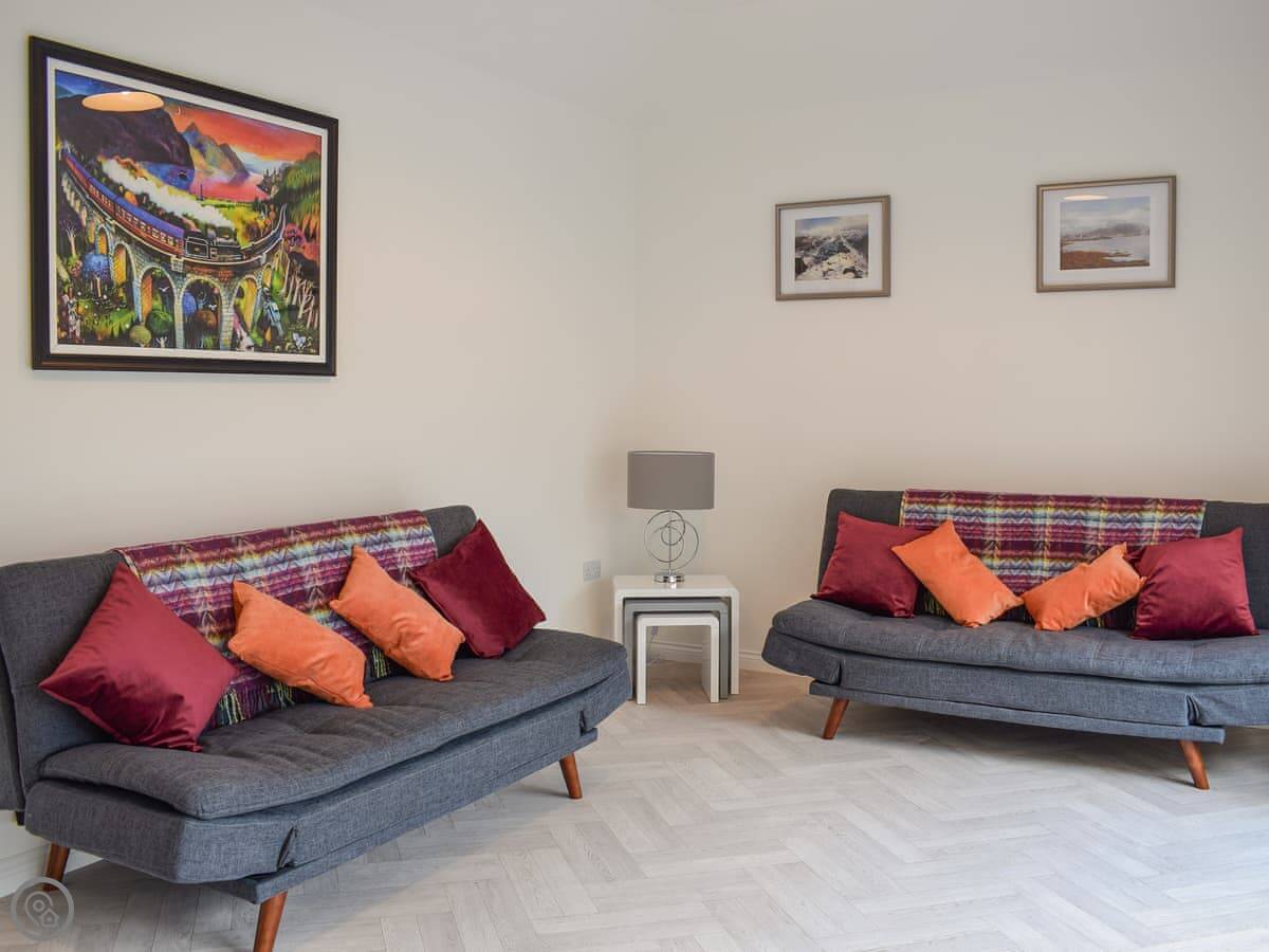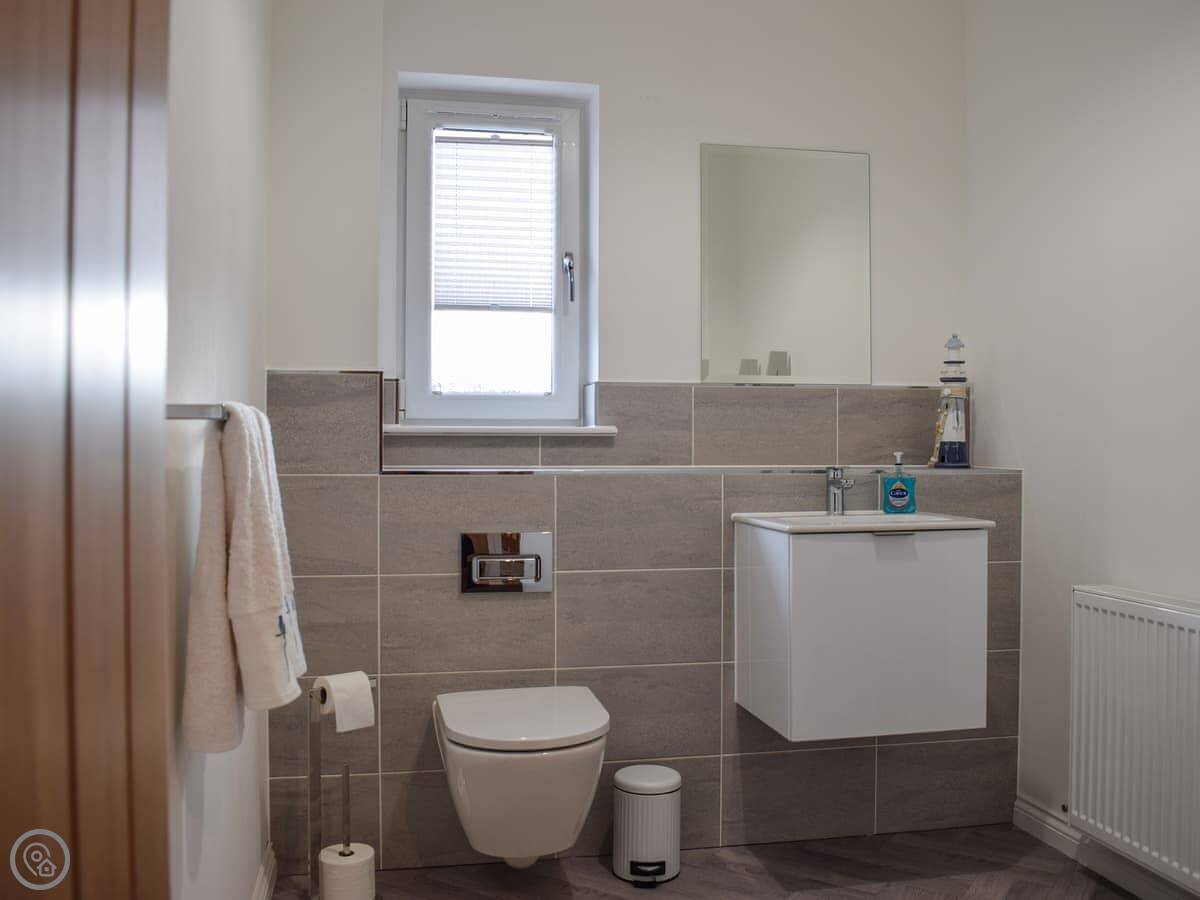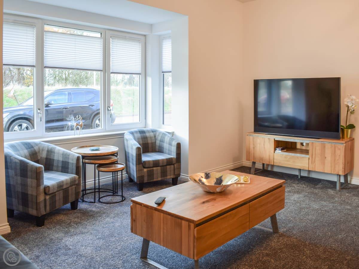 There's a large living room with a big TV. The kitchen has a central island with stools. Upstairs, there's a second TV room with a sofa bed and a Playstation. There's a utility room with a washing machine. Bedding and towels are included. We provide a cot and a highchair.