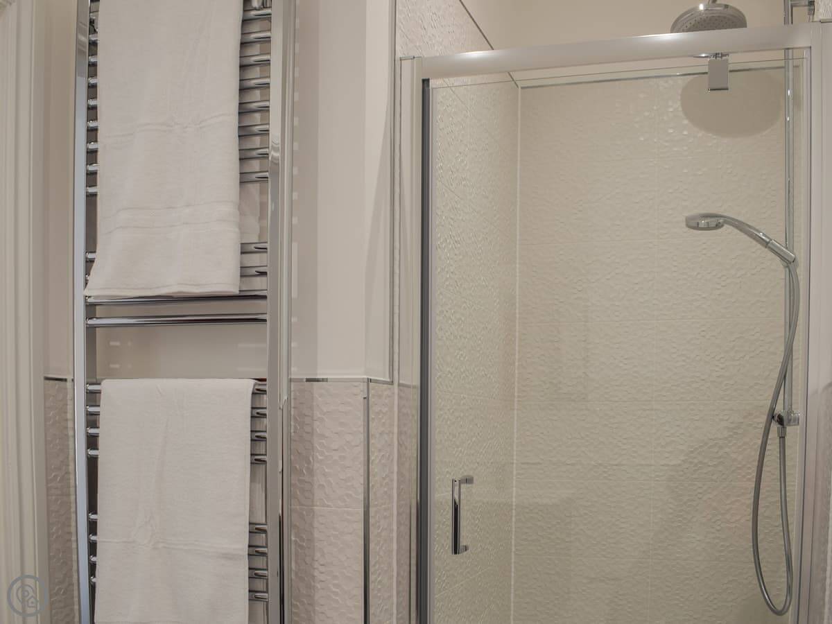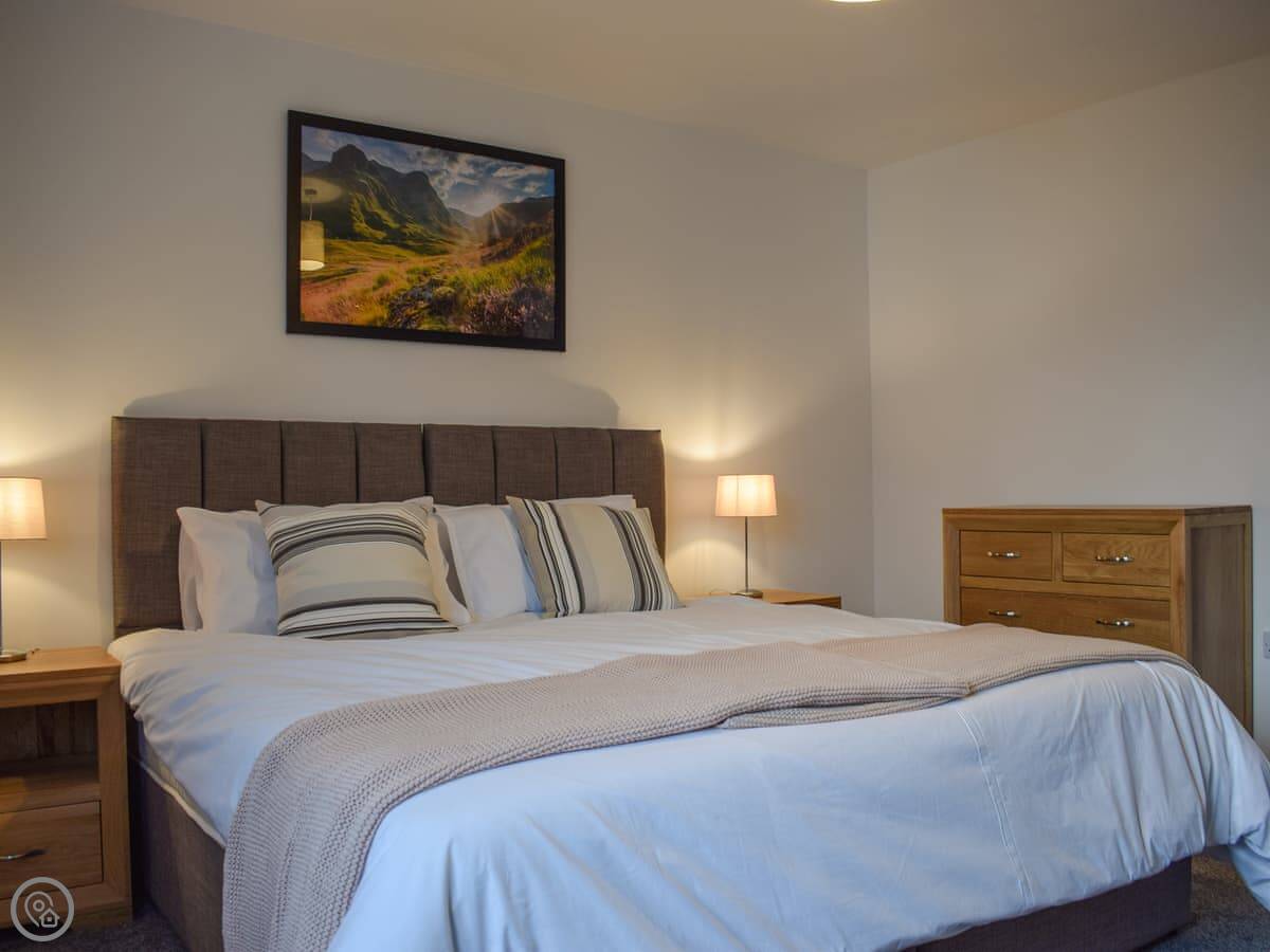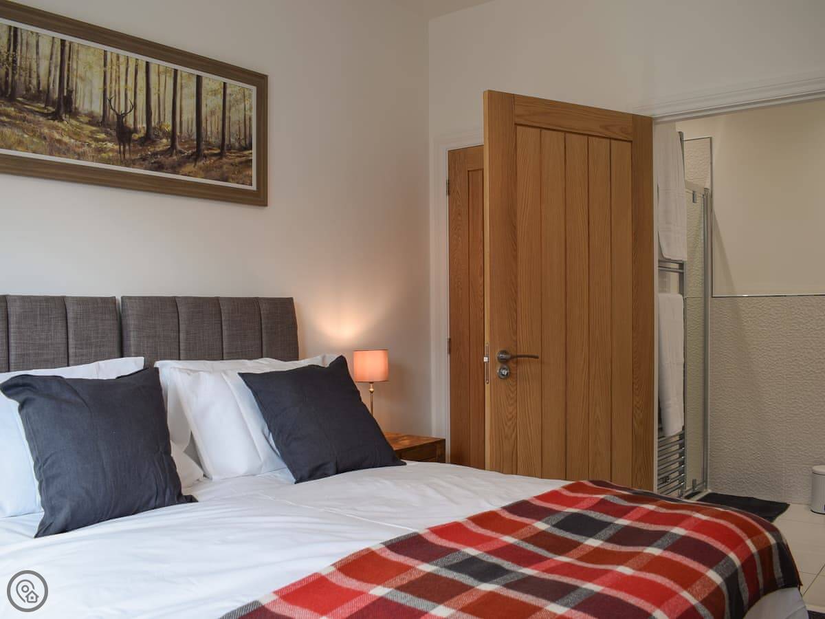 It sleeps ten. Five bedrooms, four bathrooms. It's a 4 Star place, which means it's well-finished and comfortable. Three bedrooms are en-suite. Two have walk-in dressing rooms. One of the kingsize bedrooms is downstairs. The other four are upstairs. All the kingsize beds can be split into twins if you need that.