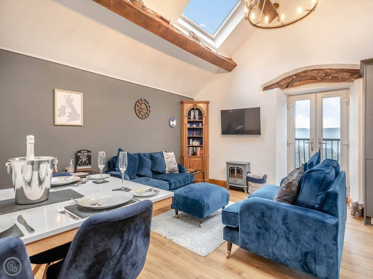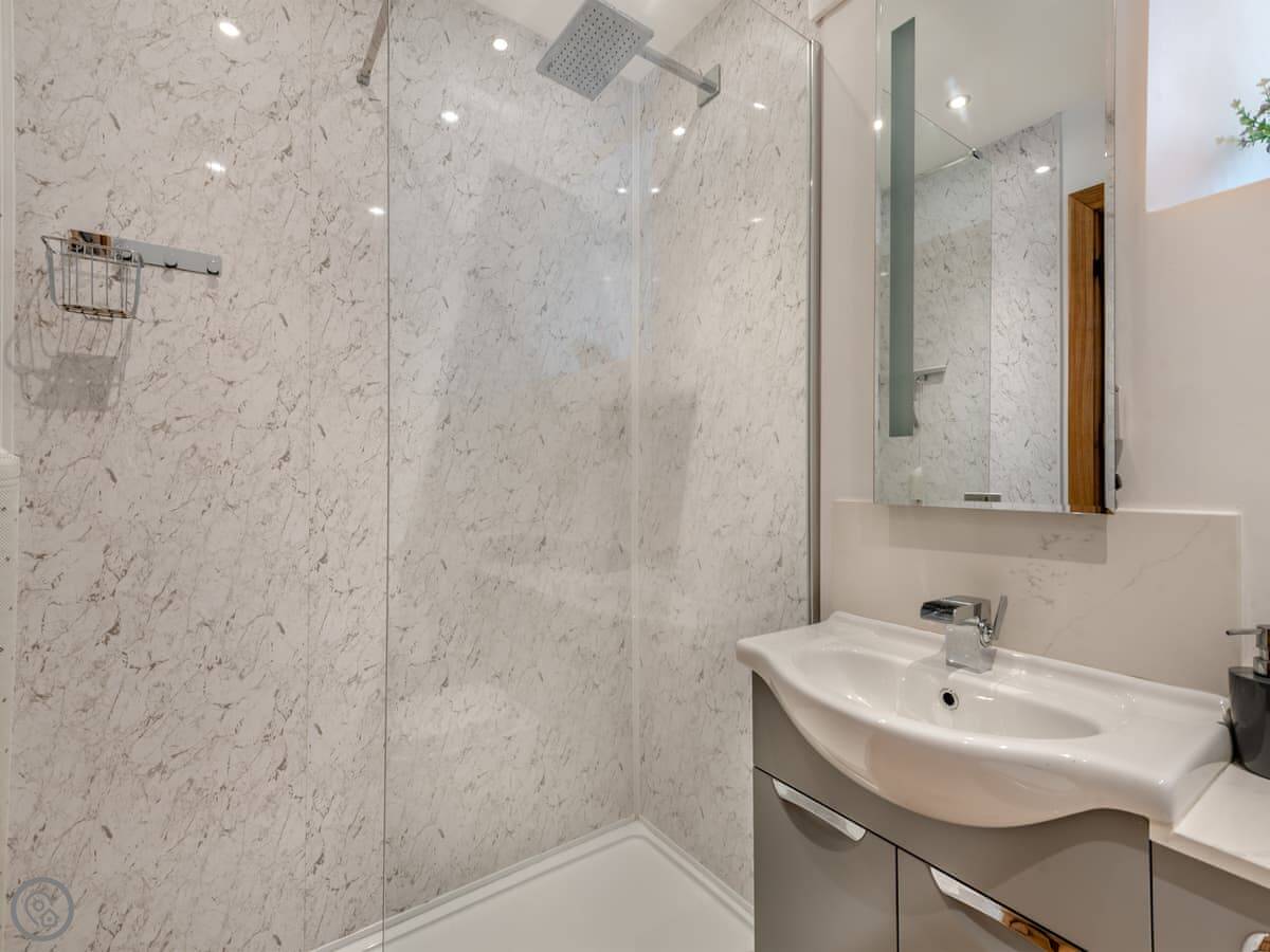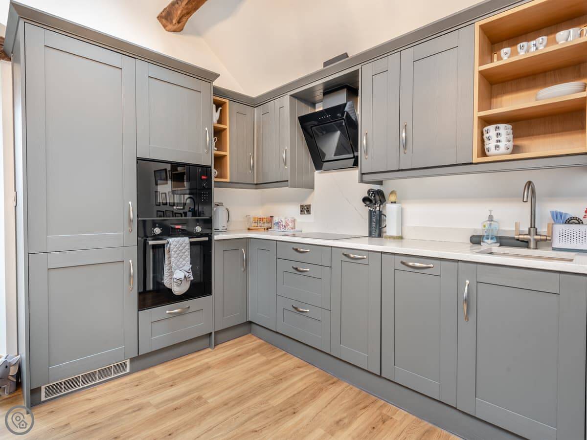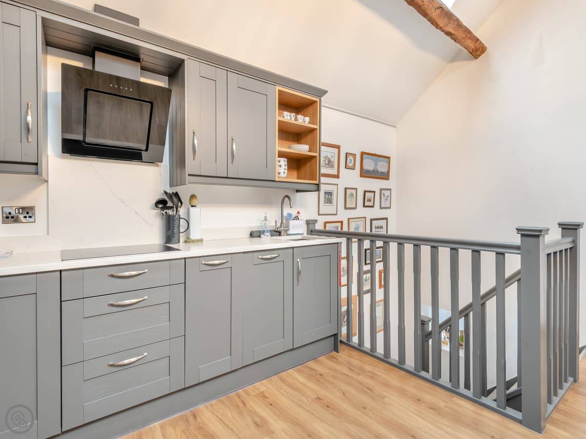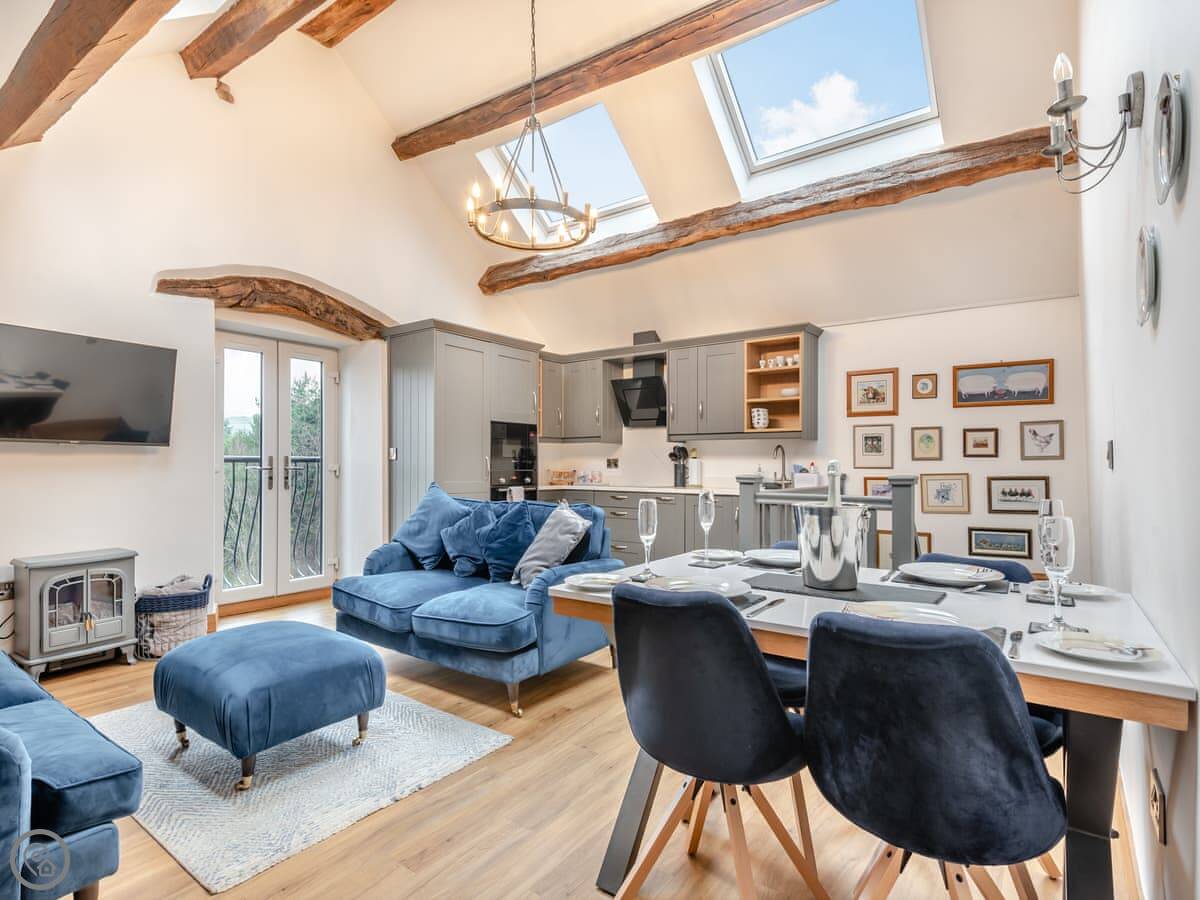 Naze View Barn is located on the owner’s working farm, a unique location within the Peak District on an alpaca farm sharing the land with horses, alpacas and the owner’s friendly cocker spaniels. The barn offers beautiful accommodation for up to four guests. On the ground floor there are two kingsize bedrooms, one of these can be made into a twin if requested, plus a modern shower room. On the first floor is an open plan living space with fully equipped kitchen with dining table and chairs, a cosy living area with a Juliet balcony. The barn has high ceilings and has been finished to a high and modern standard, keeping the accommodation light throughout with tasteful pops of colour. Outside there is an enclosed garden with patio area, plus a hot tub to be enjoyed at your leisure. There is also private parking available. The owner does offer an alpaca experience for an extra charge and you can walk them around the farm, this is to be organised directly with the owners.