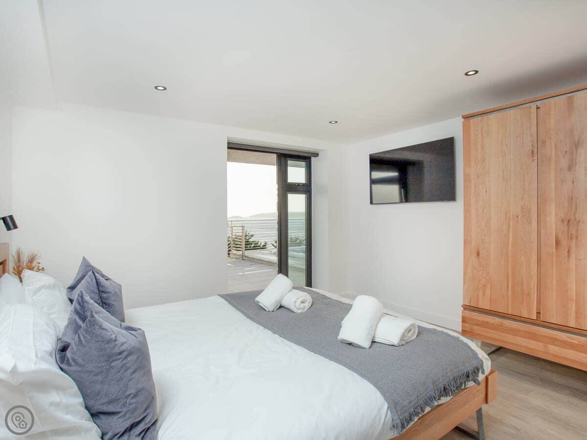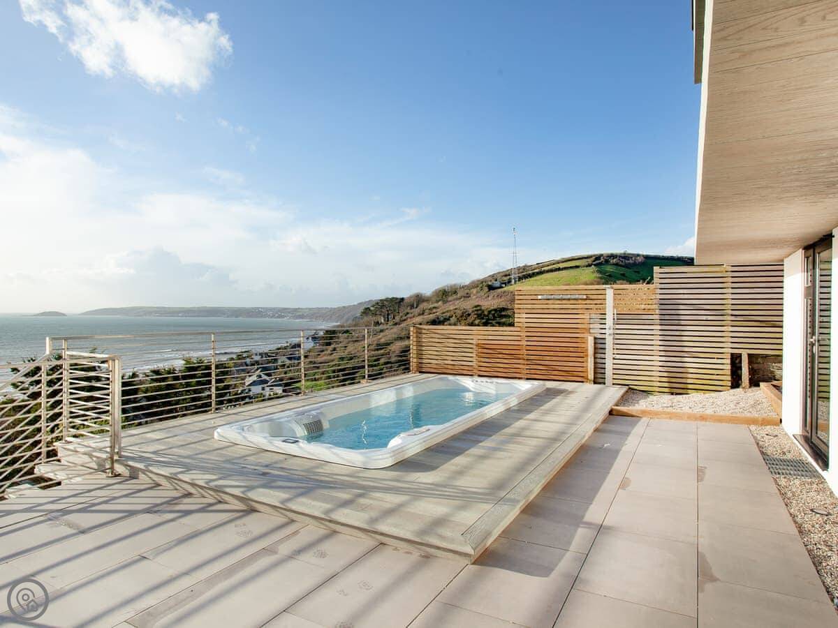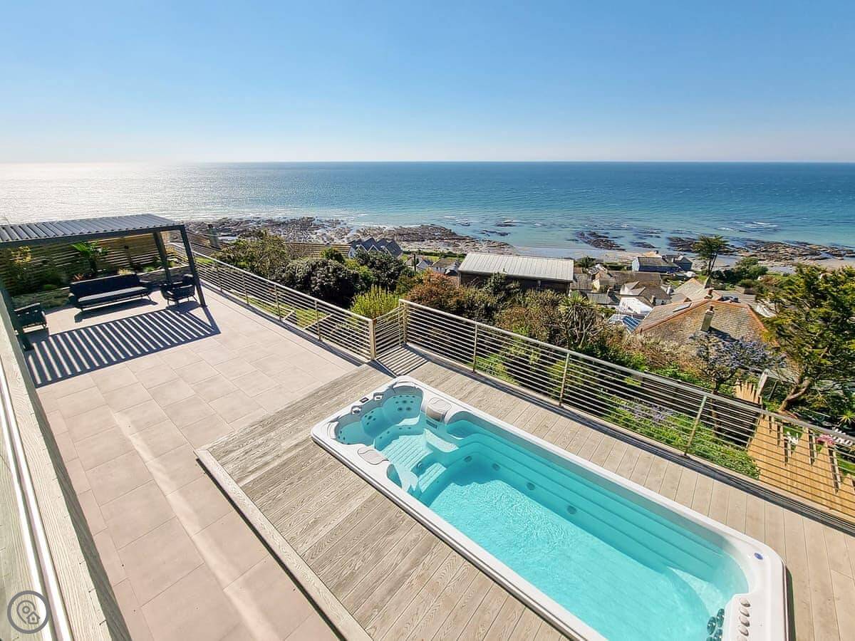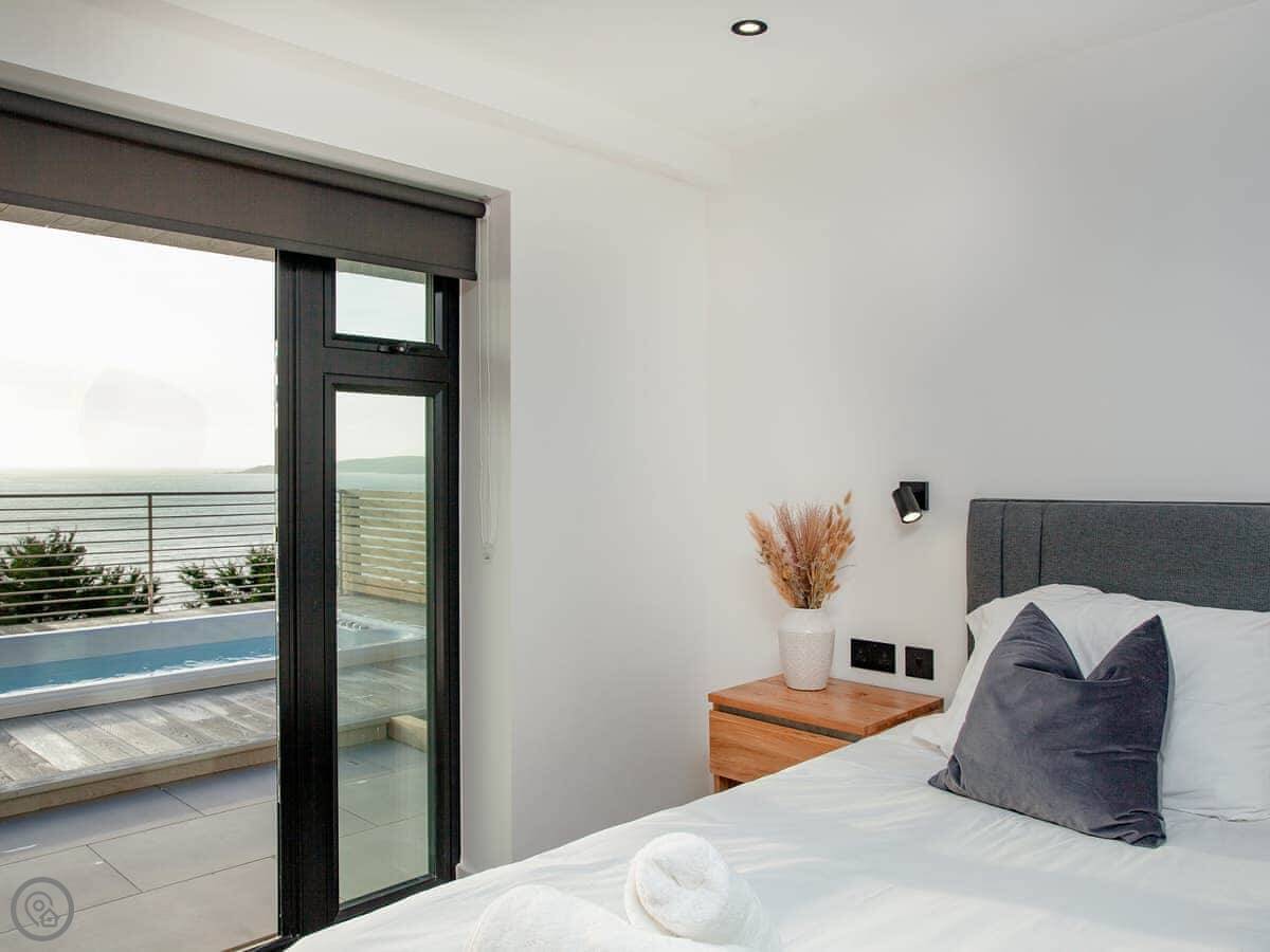 You enter into a spacious hall with the first of many sea views to give you a taste of what is to come! The open plan kitchen/dining room has a beautiful wooden table, looking out through the impressive wall-to-wall sliding glass doors on to the balcony and to sea. There is a secluded living room, with large Smart TV, corner sofa and wide chair, so watching a movie or simply to quietly read the latest novel, this a lovely area to retire to. Stairs lead down to three gorgeous bedrooms, the first with sea views, zip and link feature, built in storage and door to the patio area and large 6m long swim spa/jacuzzi and outside seating. Bedroom two offers bunk beds with pull-out lower section and door to the patio and sea views. Bedroom three has a stunning kingsize bed, superb en-suite shower room, wall-mounted Smart TV and door to the patio with sea views. The top floor boasts a fabulous kingsize bed, with private outdoor balcony area with glass front offering sea views. The en-suite bathroom is two steps down and has large double shower with rainfall feature and superb natural lighting. The outdoor space is a sheer delight. A seating area complete with barbecue is at one end with spectacular Jacuzzi pool at the other, perfect for lazy days when you just want to relax, take in the views and chill! There is an outdoor shower too. It must be mentioned that the lighting throughout this property is exquisite, especially in the evening when the subtle mood features both inside and out create a rather magical, almost Mediterranean feel and experience. There is private parking to the front of the property with full electric car charging facility provided.