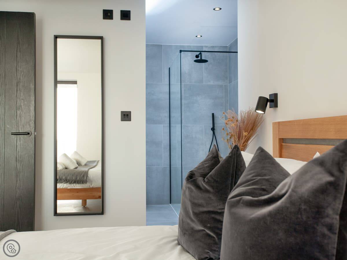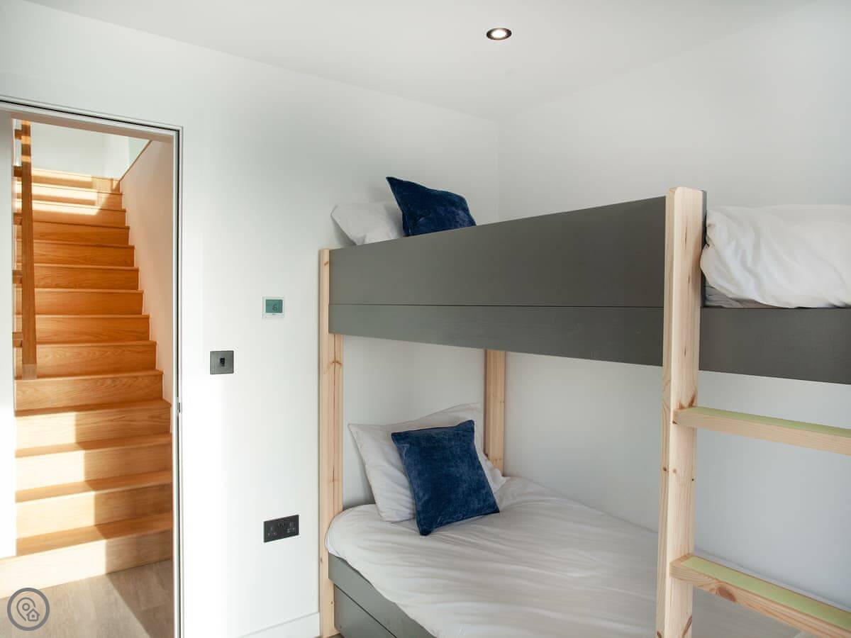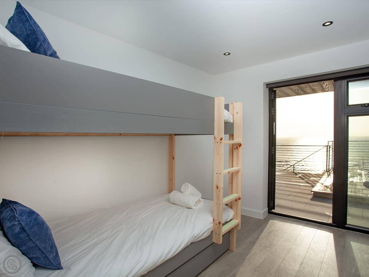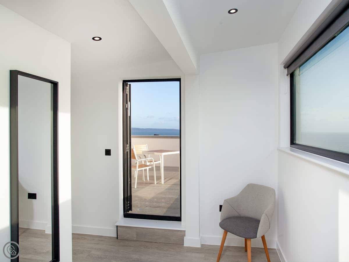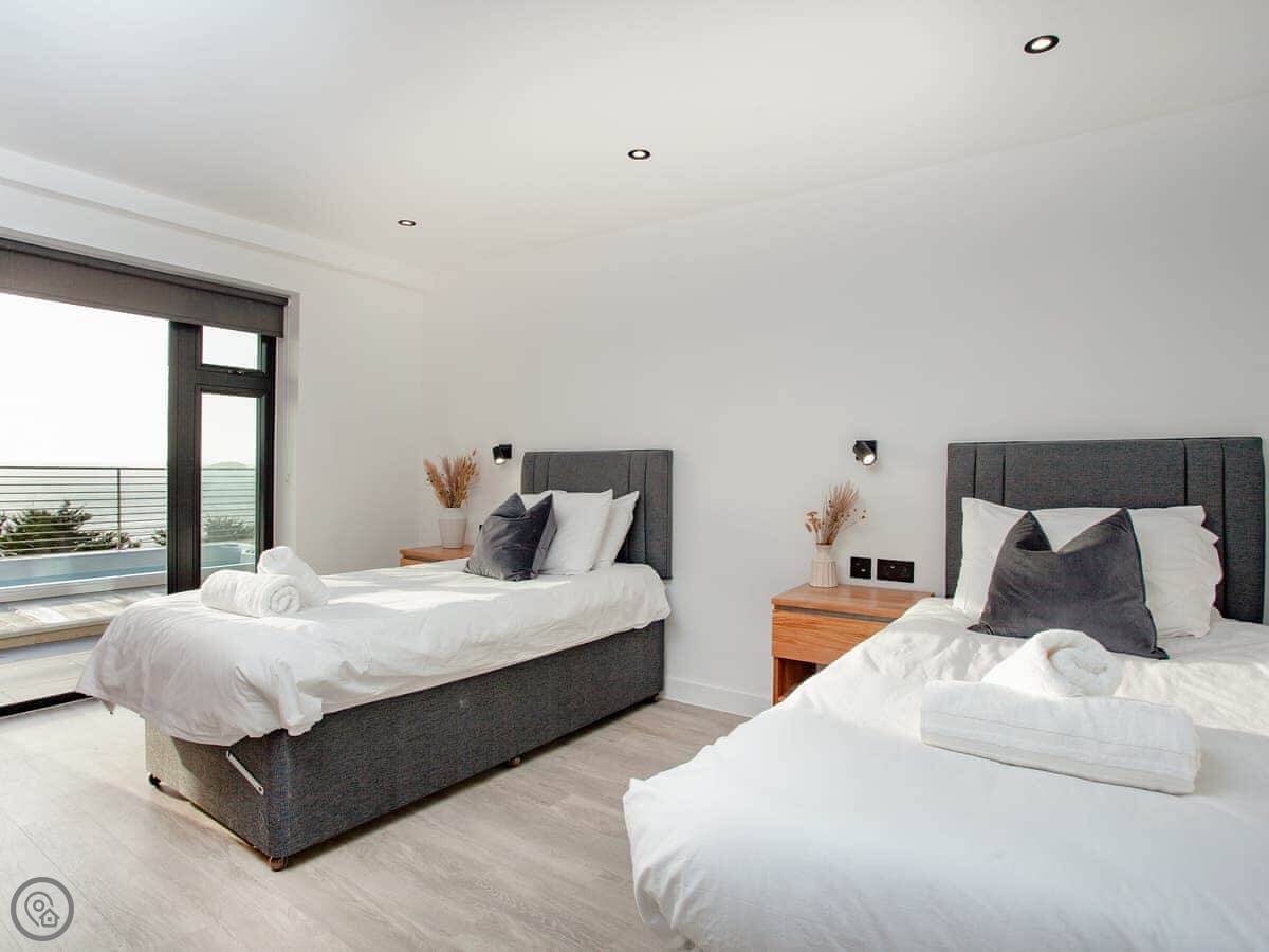 You enter into a spacious hall with the first of many sea views to give you a taste of what is to come! The open plan kitchen/dining room has a beautiful wooden table, looking out through the impressive wall-to-wall sliding glass doors on to the balcony and to sea. There is a secluded living room, with large Smart TV, corner sofa and wide chair, so watching a movie or simply to quietly read the latest novel, this a lovely area to retire to. Stairs lead down to three gorgeous bedrooms, the first with sea views, zip and link feature, built in storage and door to the patio area and large 6m long swim spa/jacuzzi and outside seating. Bedroom two offers bunk beds with pull-out lower section and door to the patio and sea views. Bedroom three has a stunning kingsize bed, superb en-suite shower room, wall-mounted Smart TV and door to the patio with sea views. The top floor boasts a fabulous kingsize bed, with private outdoor balcony area with glass front offering sea views. The en-suite bathroom is two steps down and has large double shower with rainfall feature and superb natural lighting. The outdoor space is a sheer delight. A seating area complete with barbecue is at one end with spectacular Jacuzzi pool at the other, perfect for lazy days when you just want to relax, take in the views and chill! There is an outdoor shower too. It must be mentioned that the lighting throughout this property is exquisite, especially in the evening when the subtle mood features both inside and out create a rather magical, almost Mediterranean feel and experience. There is private parking to the front of the property with full electric car charging facility provided.