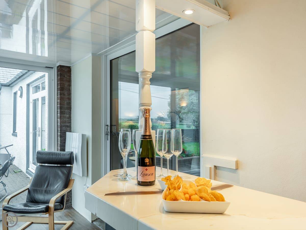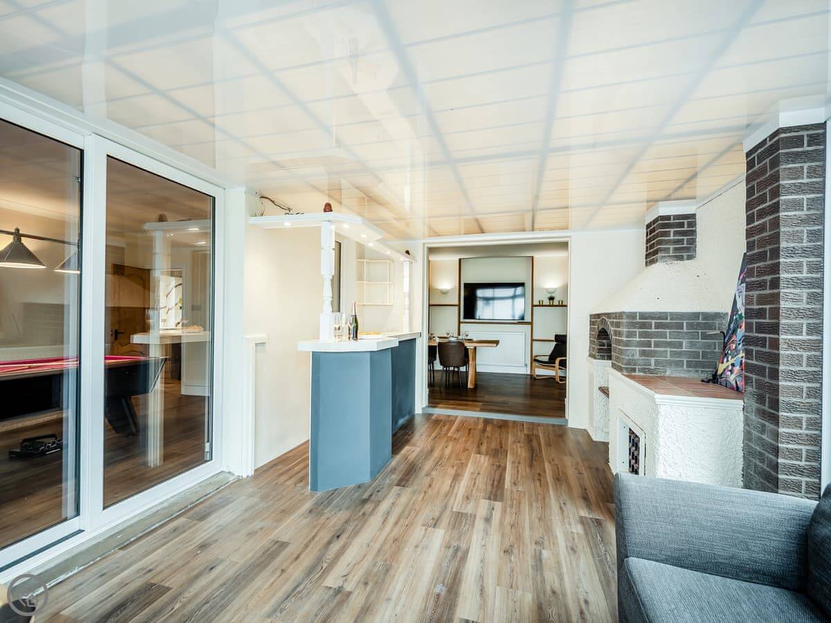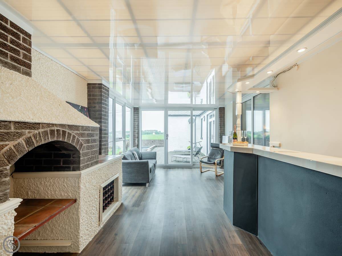 Inside, there's a big living room with full-length windows and doors through to a conservatory. The conservatory has a bar. The kitchen is modern and large, with a big table for everyone.