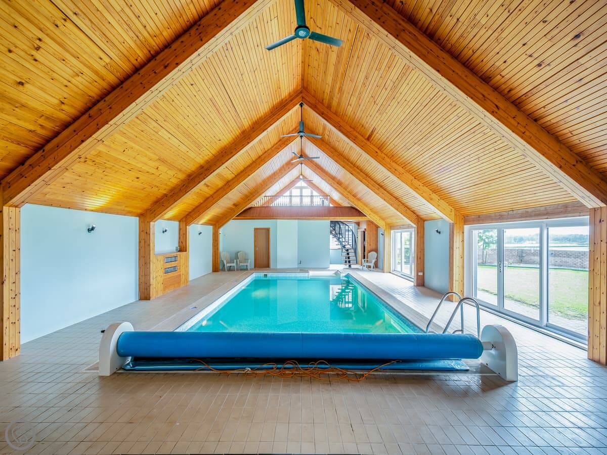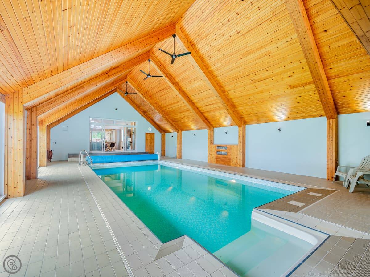 The main thing is the indoor heated swimming pool. It's right off the kitchen through sliding doors. There's a shower room and a sauna there too. The pool area has a mezzanine level above it that leads out to a terrace.