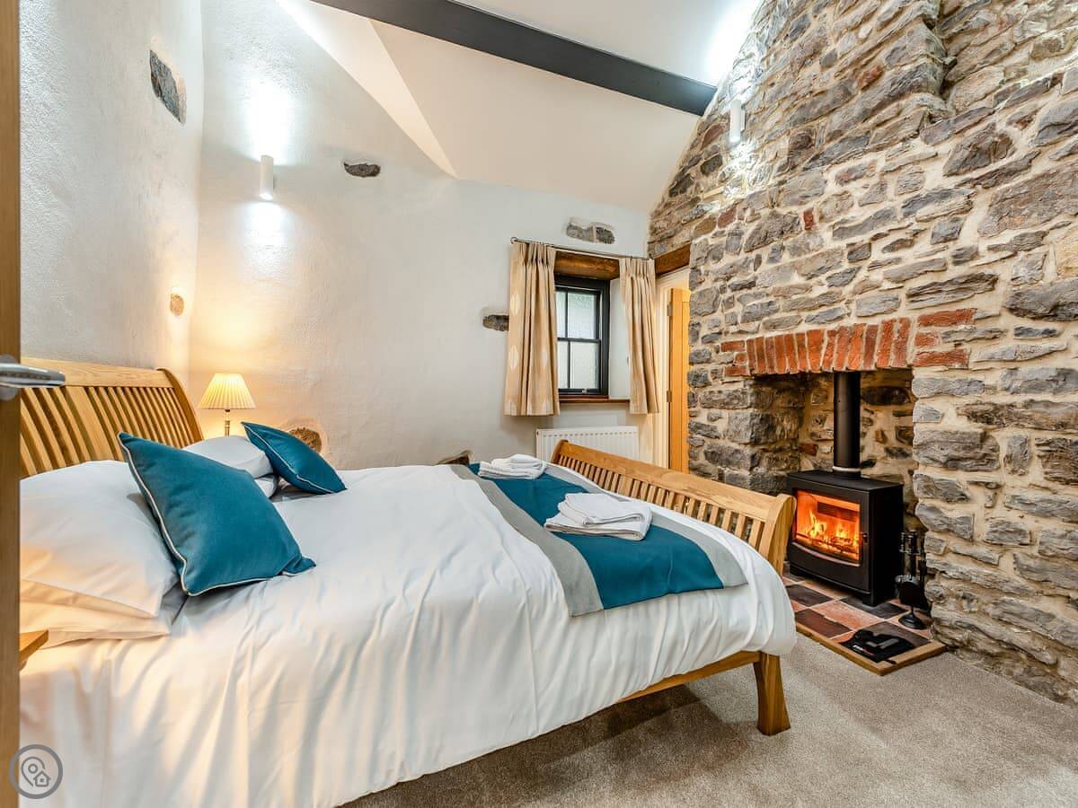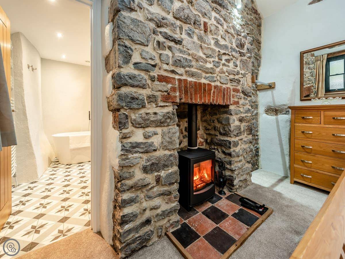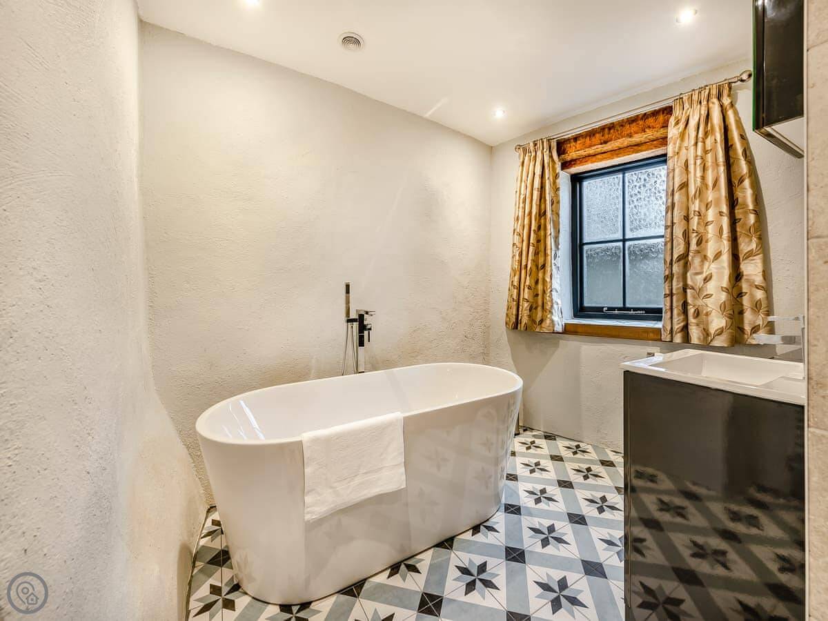 Inside, there's an open plan kitchen and living room with a wood burner. There's also a separate room with a big TV. The main bedroom has a free-standing bath in it.