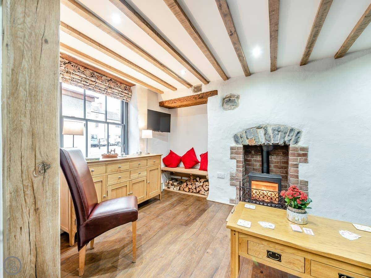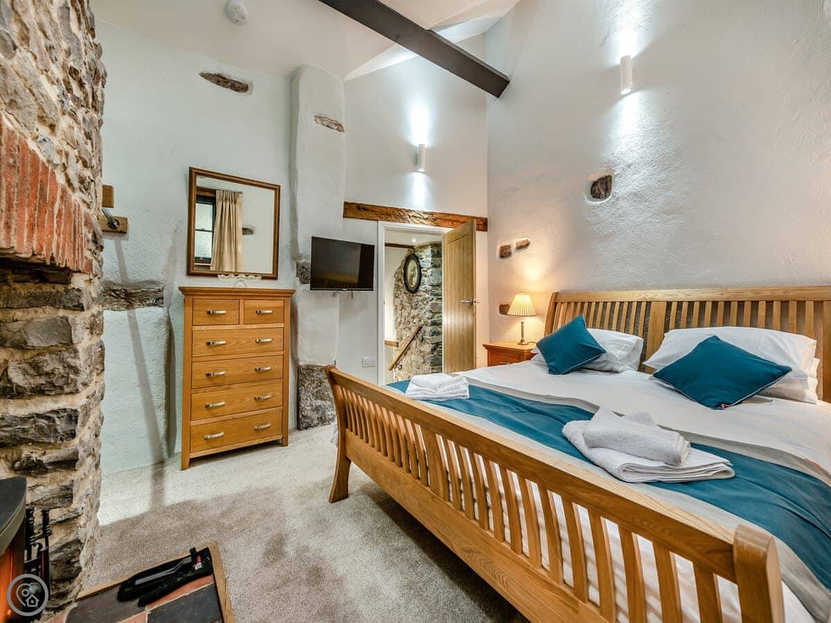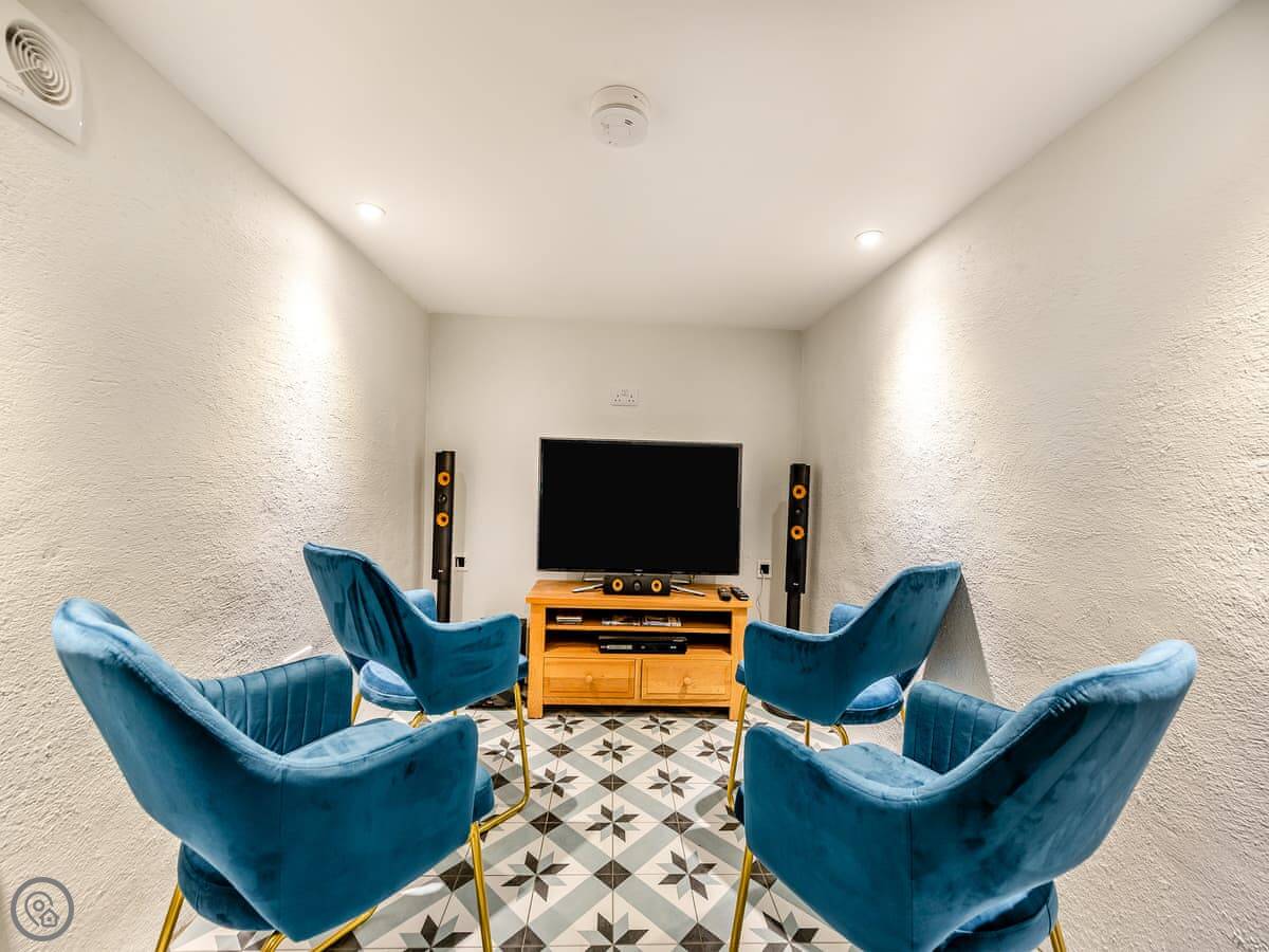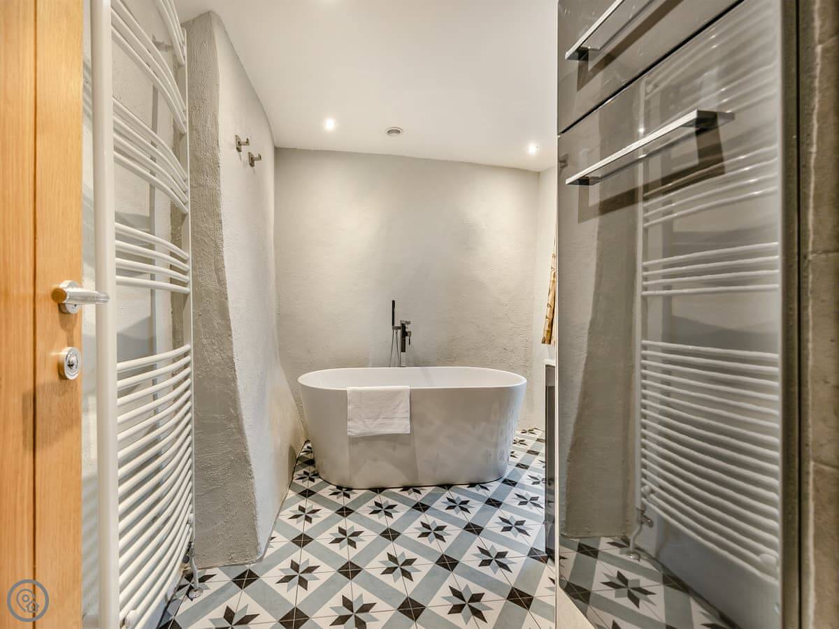 Inside, there's an open plan kitchen and living room with a wood burner. There's also a separate room with a big TV. The main bedroom has a free-standing bath in it.