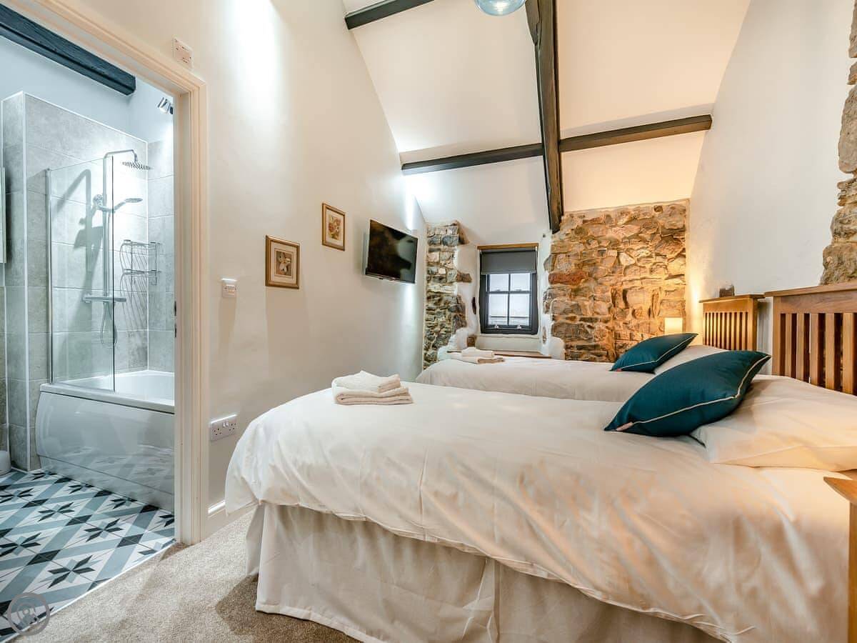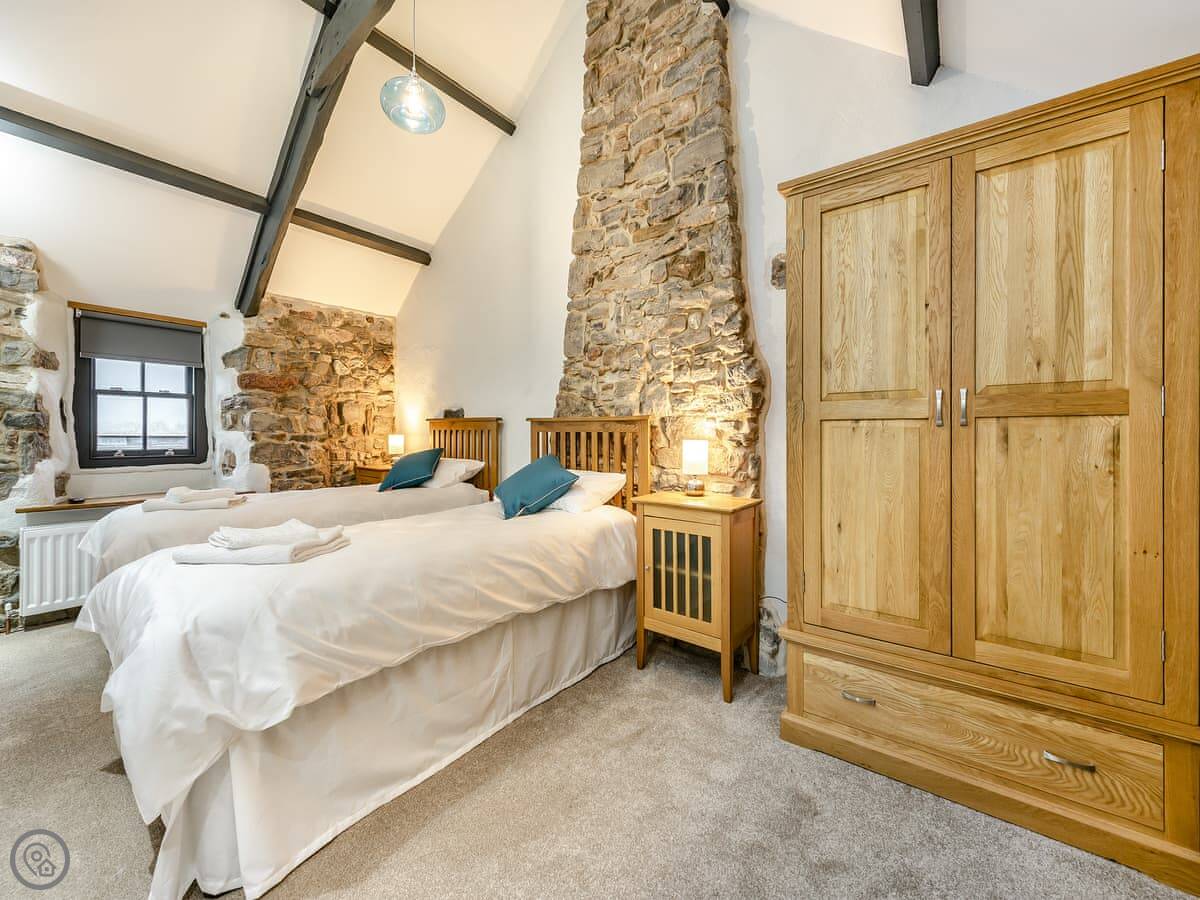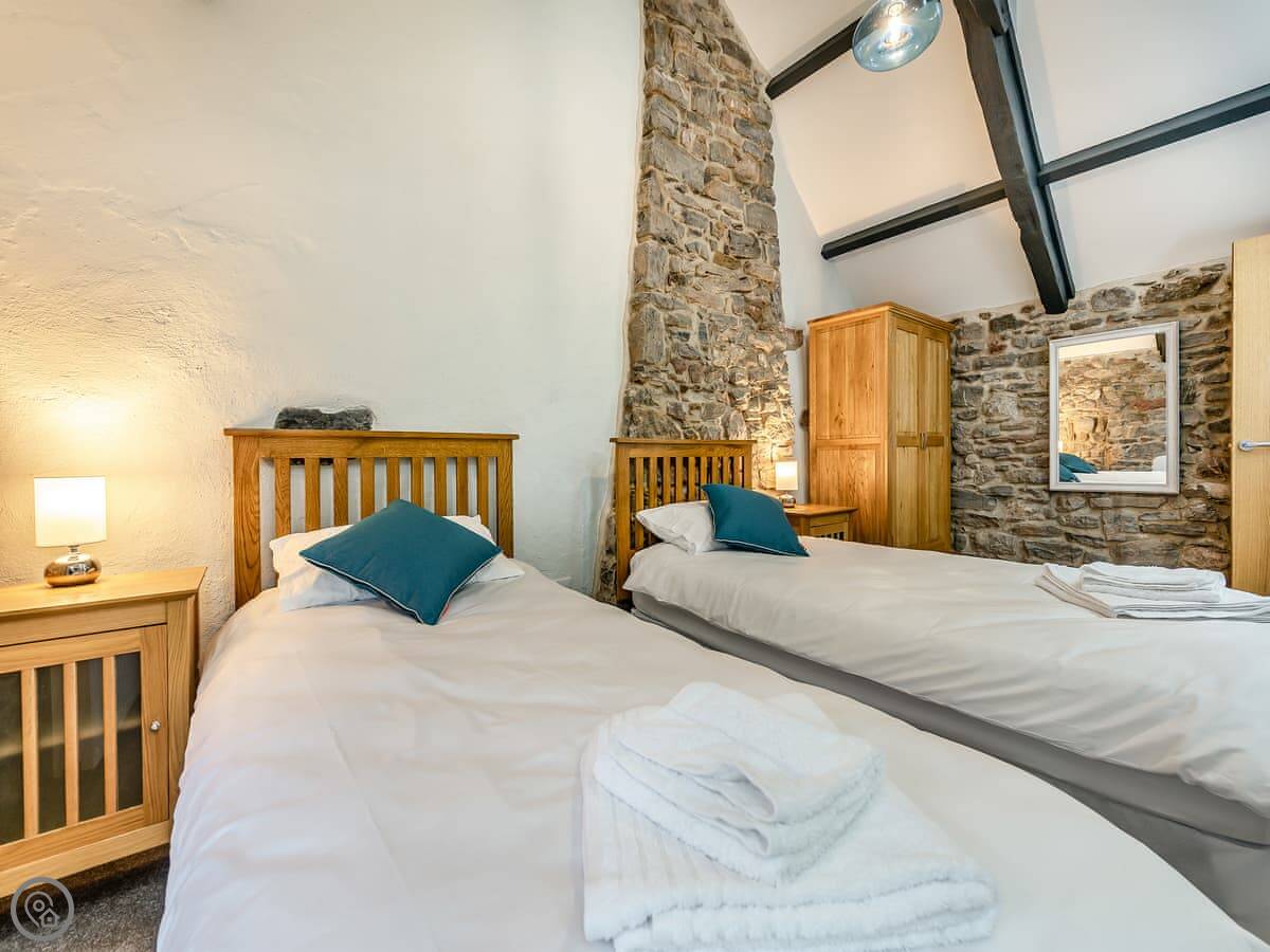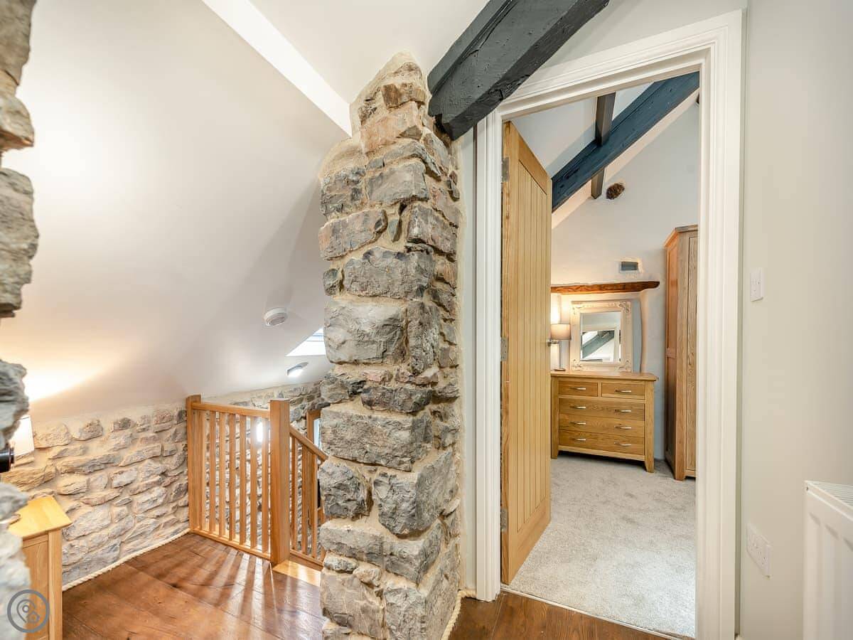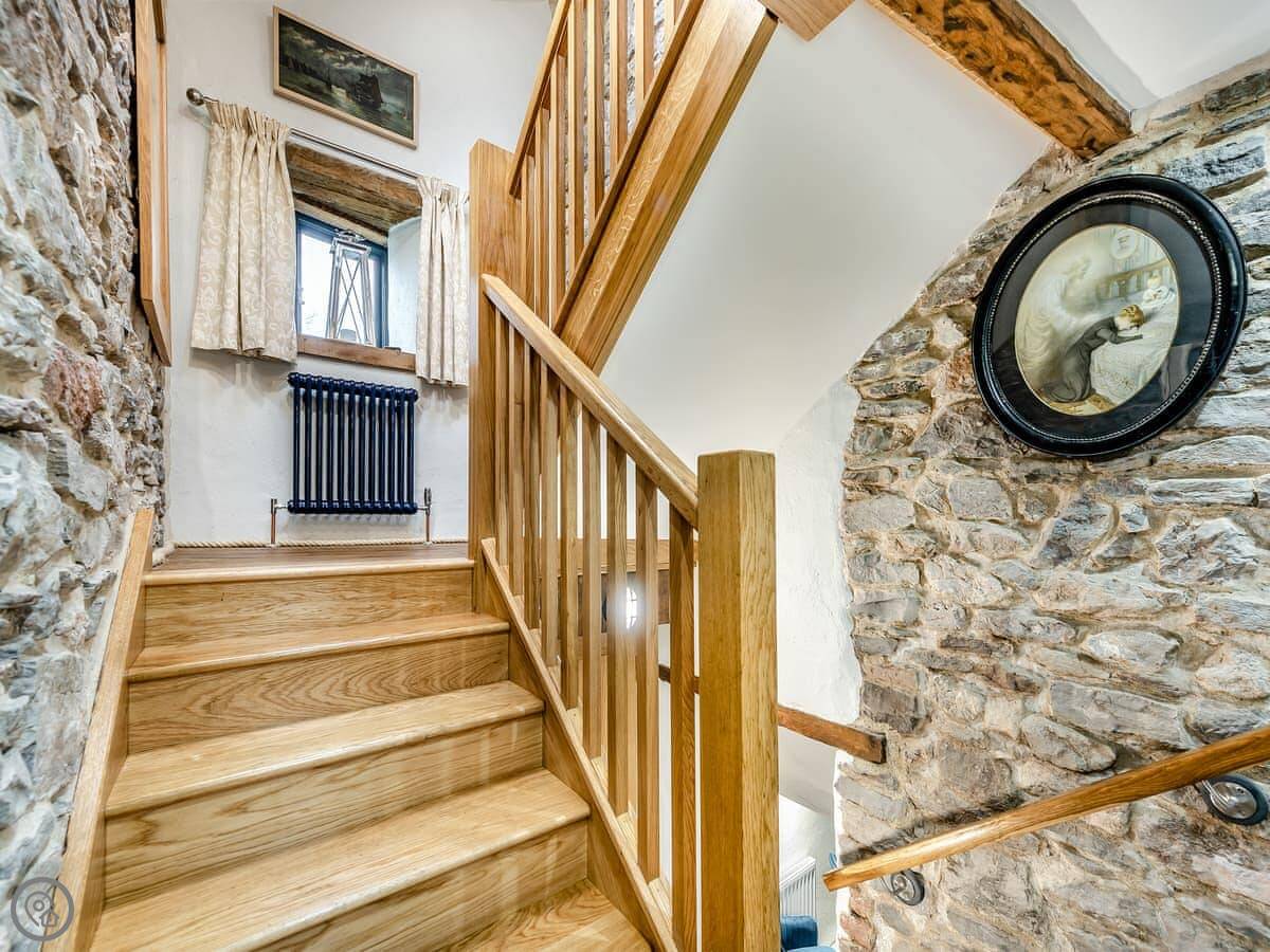 The cottage sleeps six. There are three bedrooms, each with its own bathroom. It's got a 5 Star rating. It's been restored, so it feels quite new inside despite the age. The stairs are steep and narrow. That's just how they are.