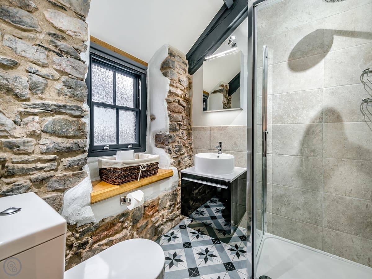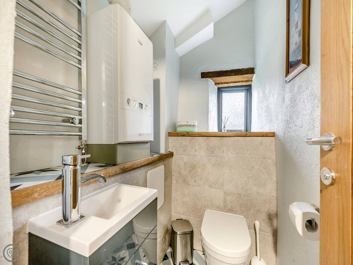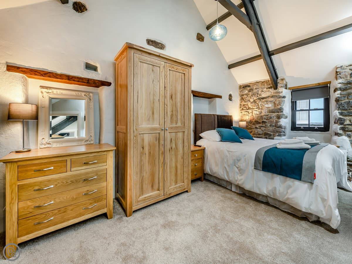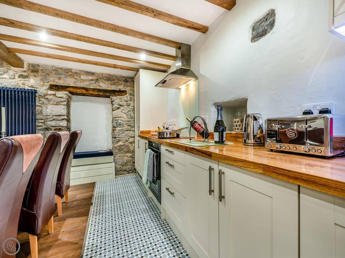The cottage sleeps six. There are three bedrooms, each with its own bathroom. It's got a 5 Star rating. It's been restored, so it feels quite new inside despite the age. The stairs are steep and narrow. That's just how they are.