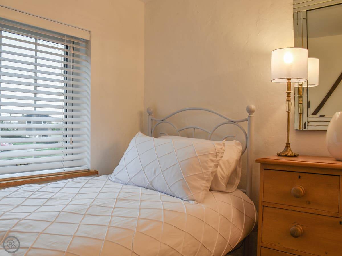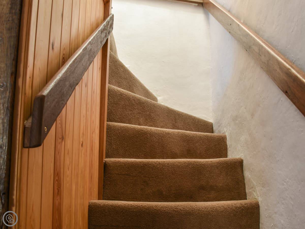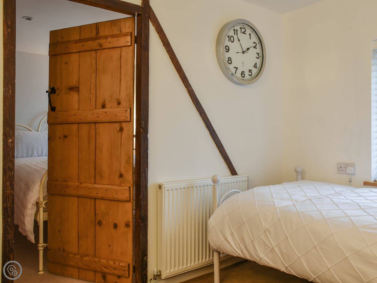 It sleeps three people, with two bedrooms and one bathroom. It's a four-star place, so it's comfortable and everything works. The stairs are narrow, typical for a cottage. To get to the main bedroom you have to walk through the second bedroom. That's just how it's laid out.