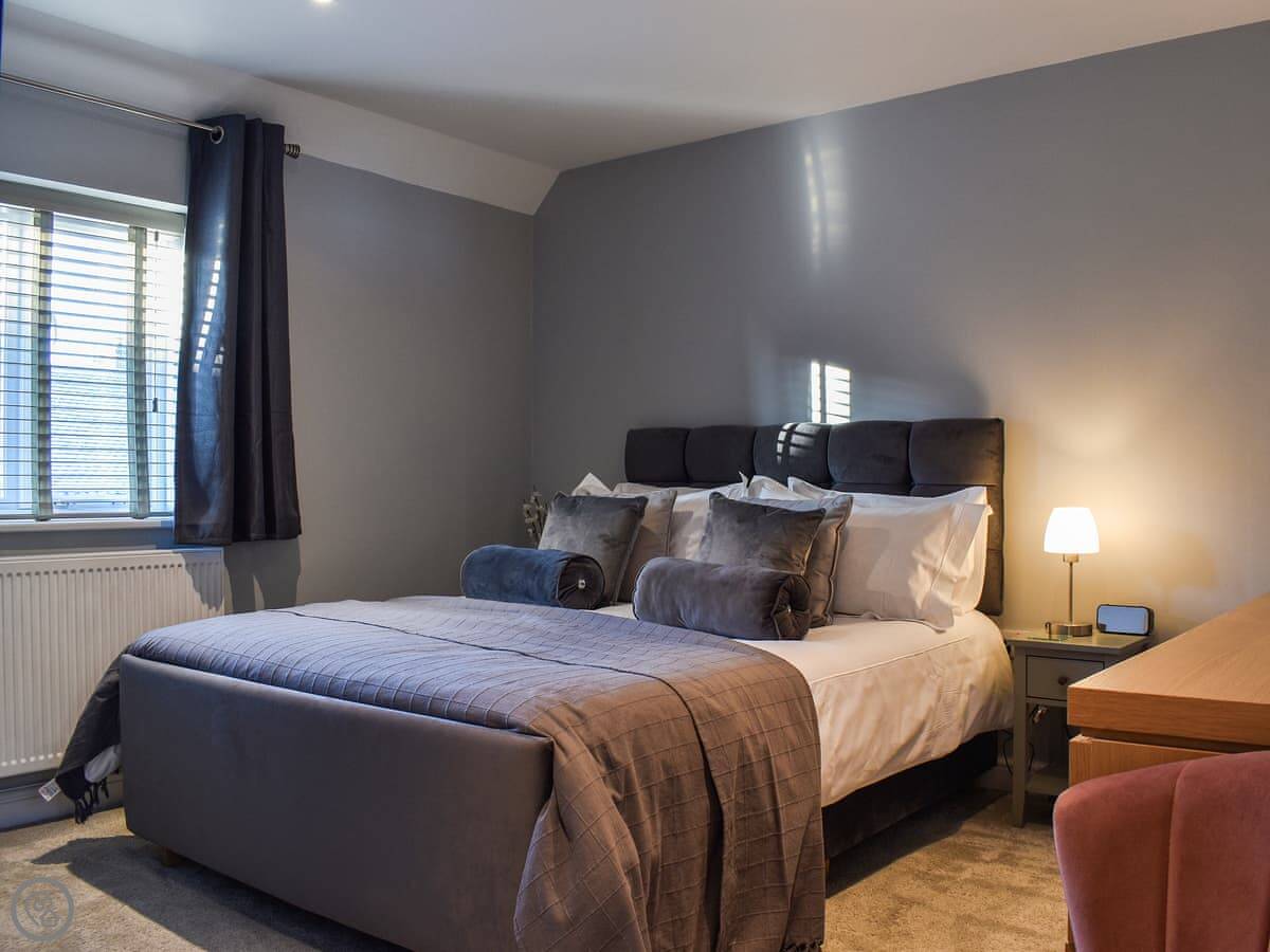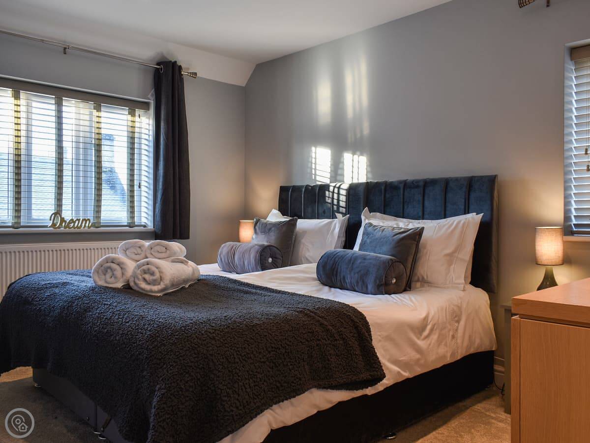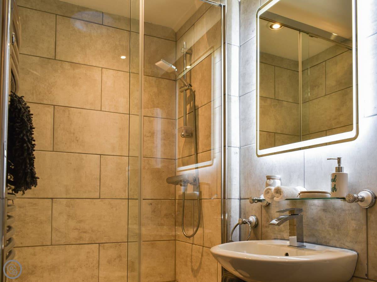 Upstairs are two bedrooms, both en-suite. The first has a kingsize bed with an en-suite bathroom, and the second has twin beds with an en-suite shower room.