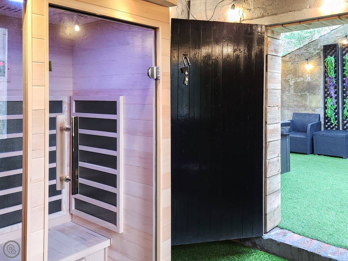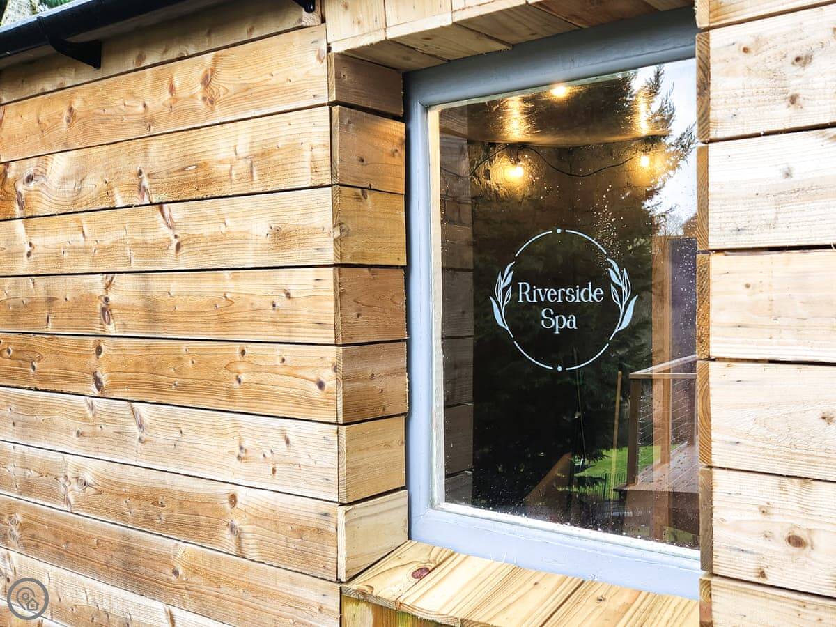 It's a 4 Star place, so it's comfortable and well kept. The living area is open plan, with the kitchen, dining, and sitting room all together. Outside, there's a patio garden with a sauna and a hot tub. You can see the river from the house.