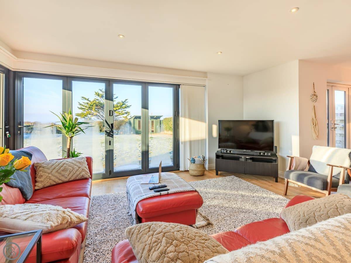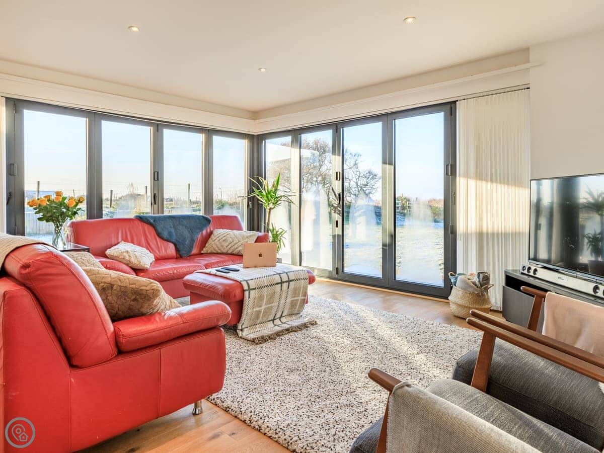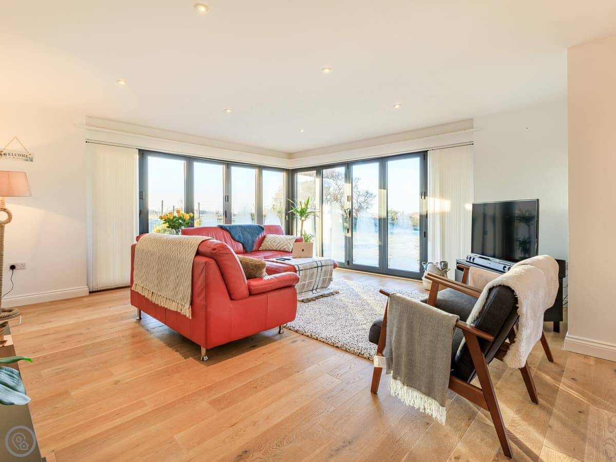 It sleeps seven in four bedrooms. There are three bathrooms. It’s got a 4 Star rating. It’s a modern place. The open plan living area has those bi-fold doors that look down the garden to the water. There’s a lawn and a deck with furniture. We get one well-behaved pet.