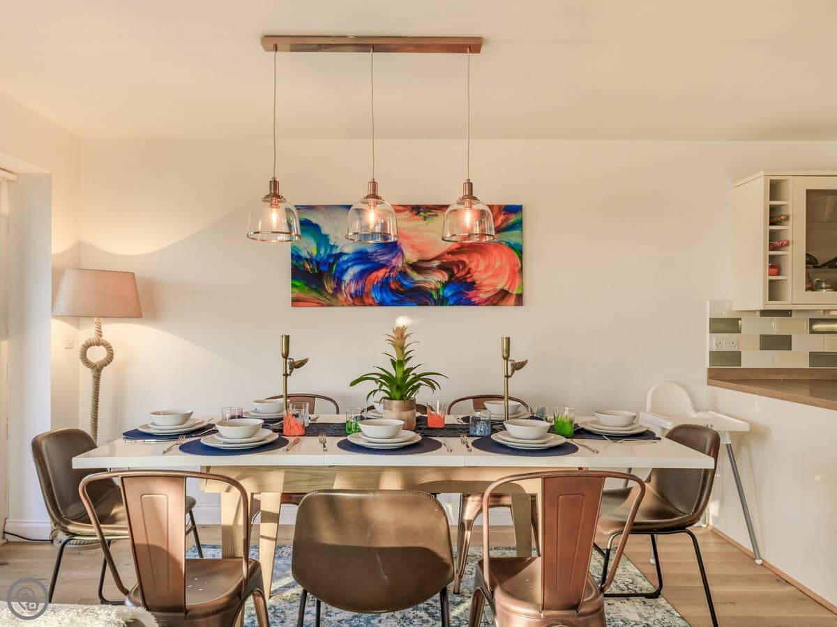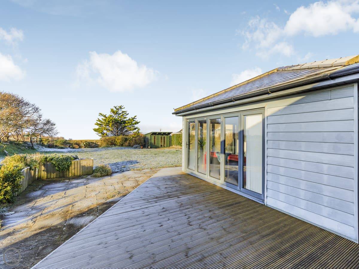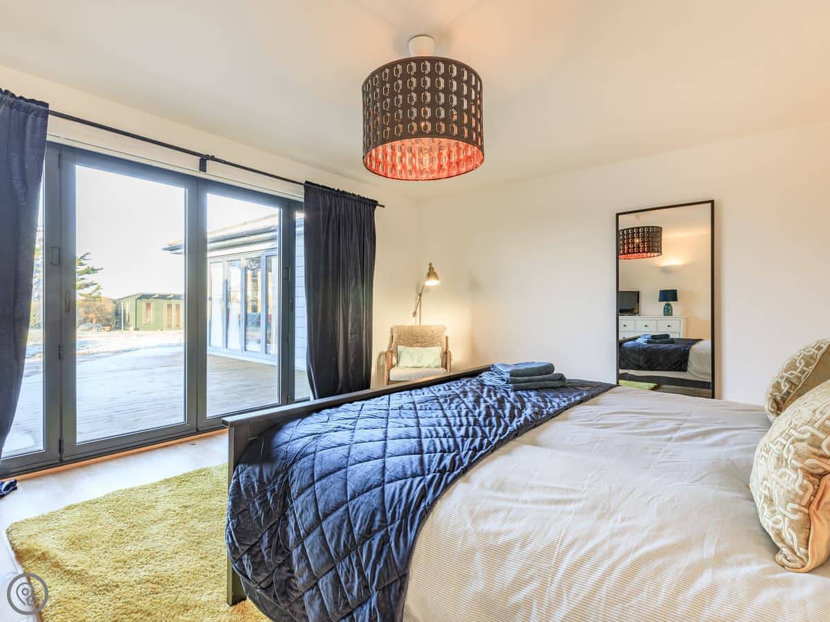 It sleeps seven in four bedrooms. There are three bathrooms. It’s got a 4 Star rating. It’s a modern place. The open plan living area has those bi-fold doors that look down the garden to the water. There’s a lawn and a deck with furniture. We get one well-behaved pet.