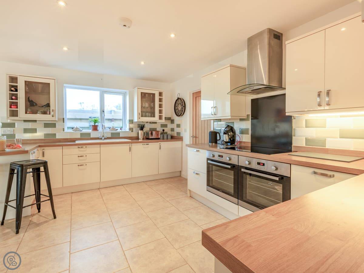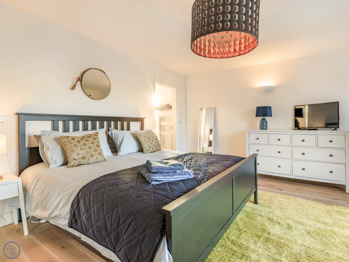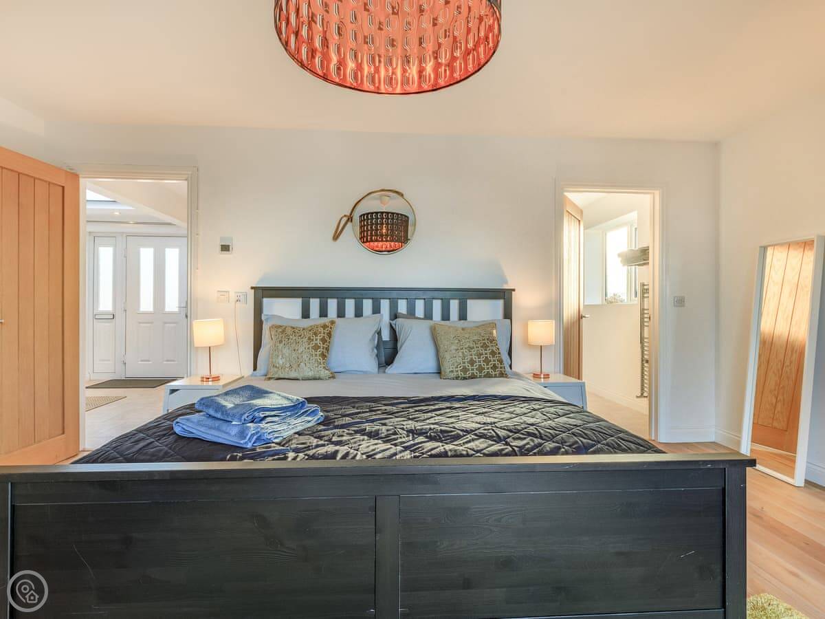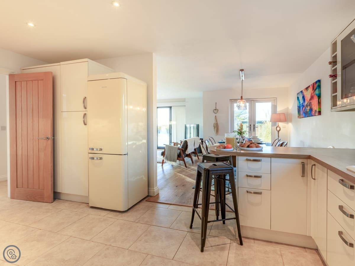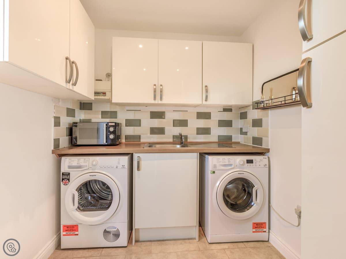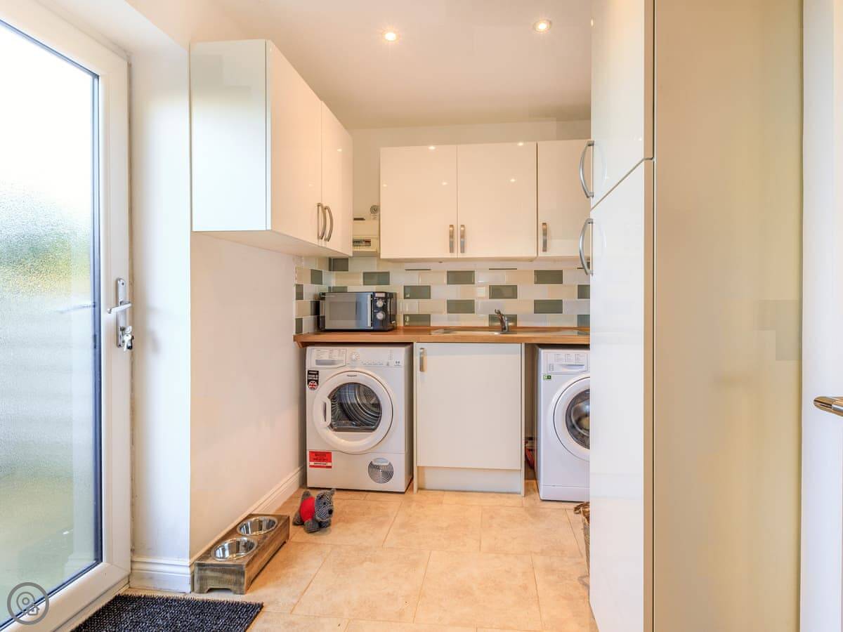 Inside, it’s all on one level. The kitchen is large and has a dishwasher. There’s a separate utility room with a washing machine and tumble dryer. Bedding and towels are included. WiFi is there.