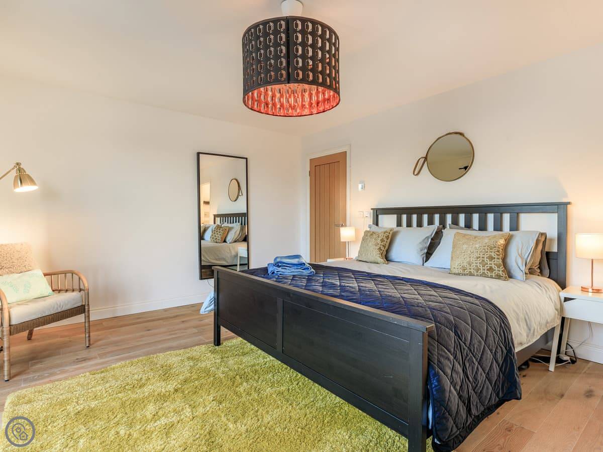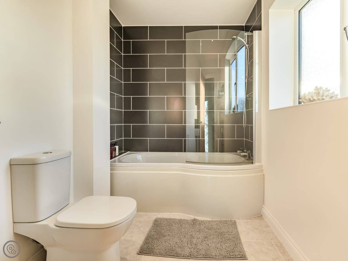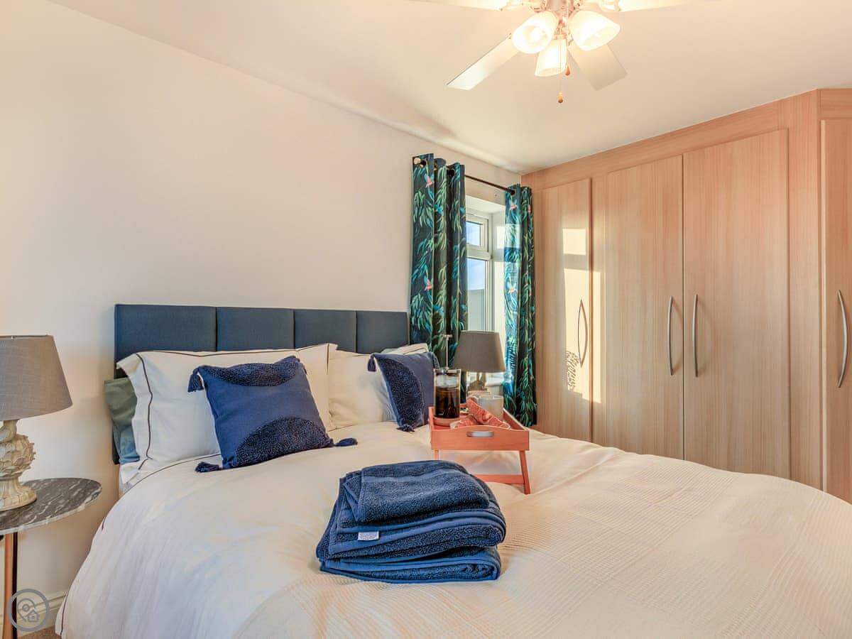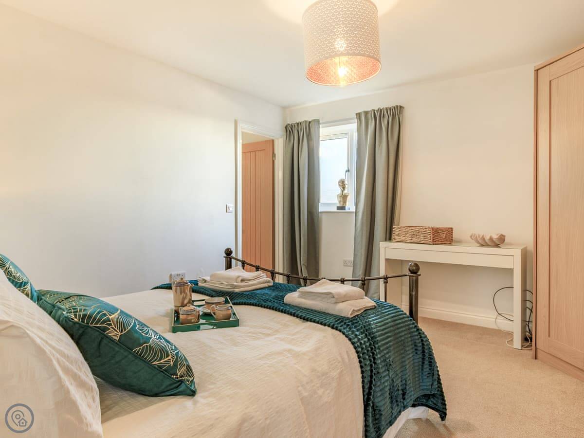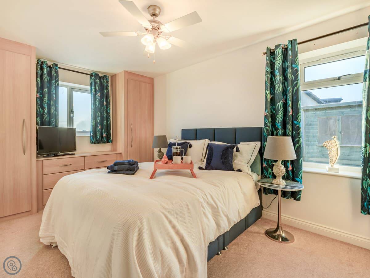 Inside, it’s all on one level. The kitchen is large and has a dishwasher. There’s a separate utility room with a washing machine and tumble dryer. Bedding and towels are included. WiFi is there.