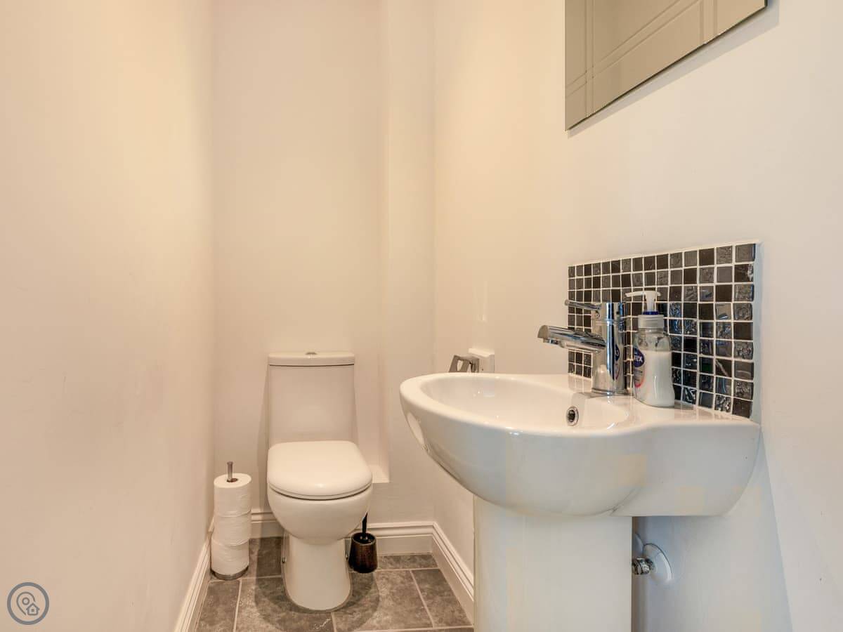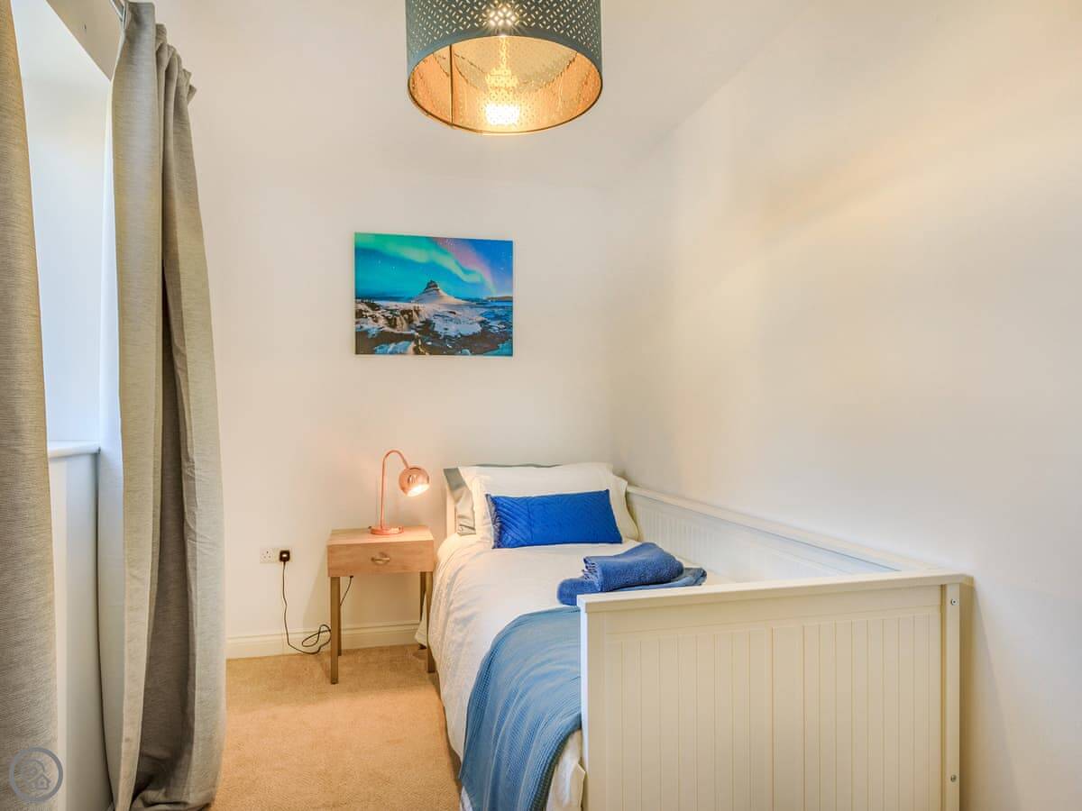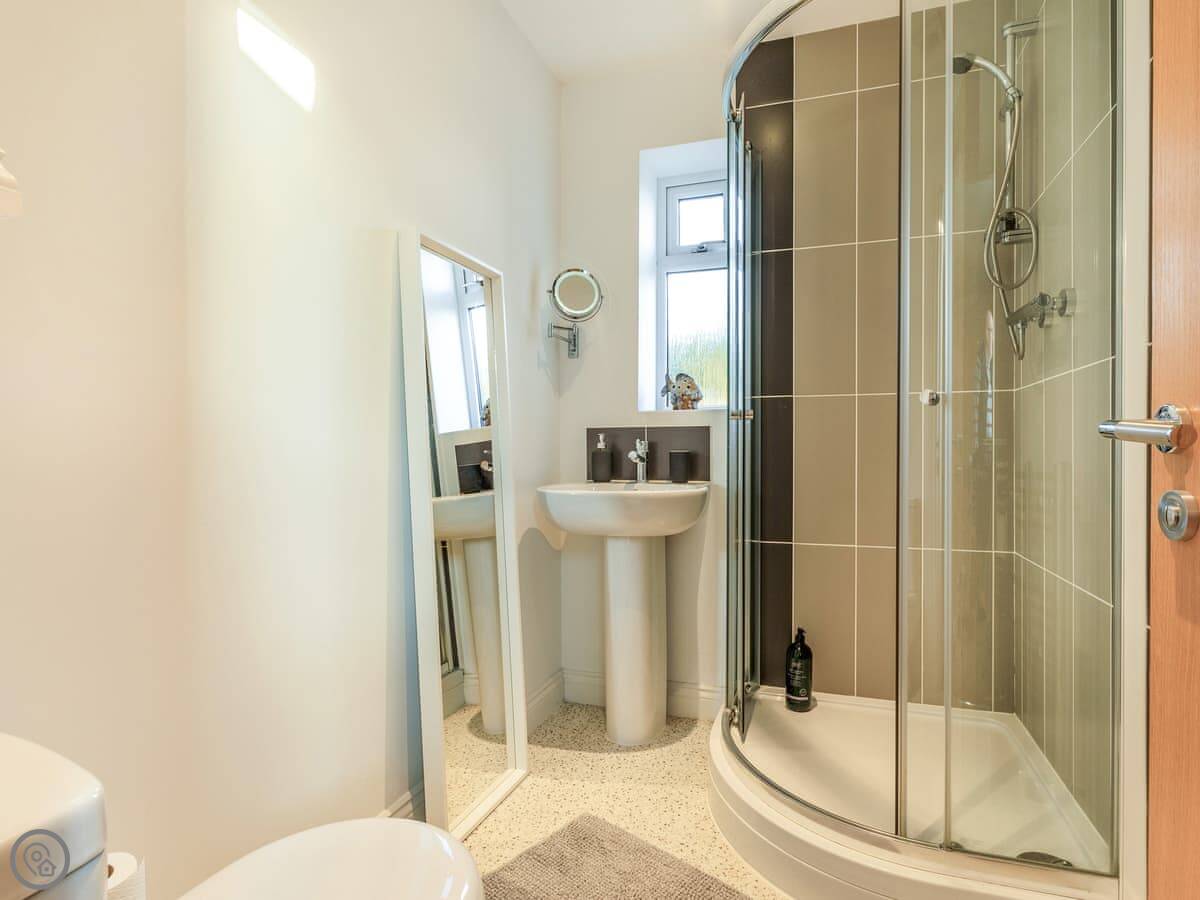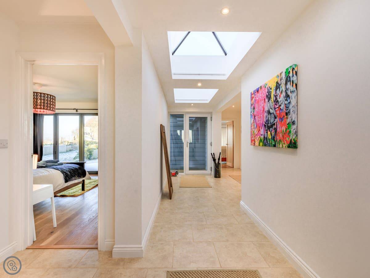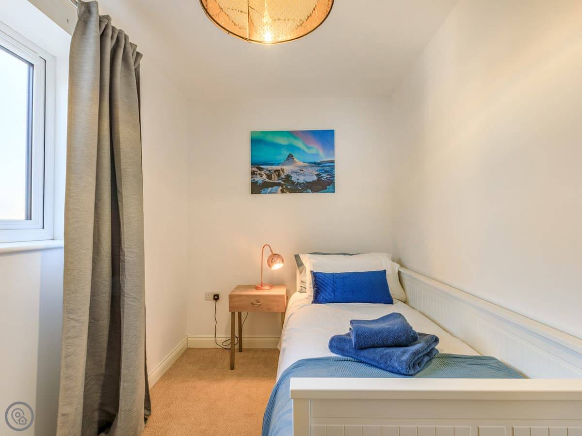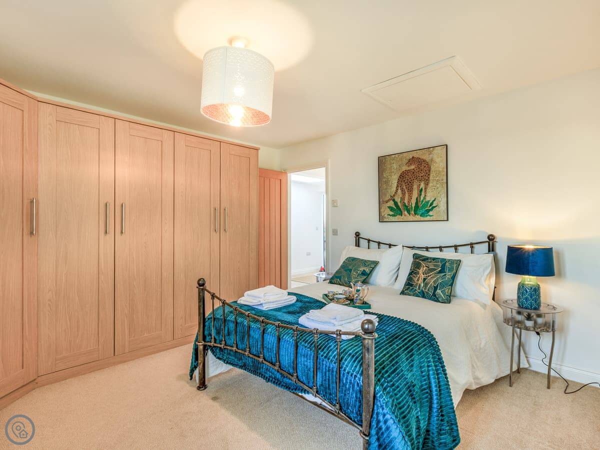 Inside, it’s all on one level. The kitchen is large and has a dishwasher. There’s a separate utility room with a washing machine and tumble dryer. Bedding and towels are included. WiFi is there.