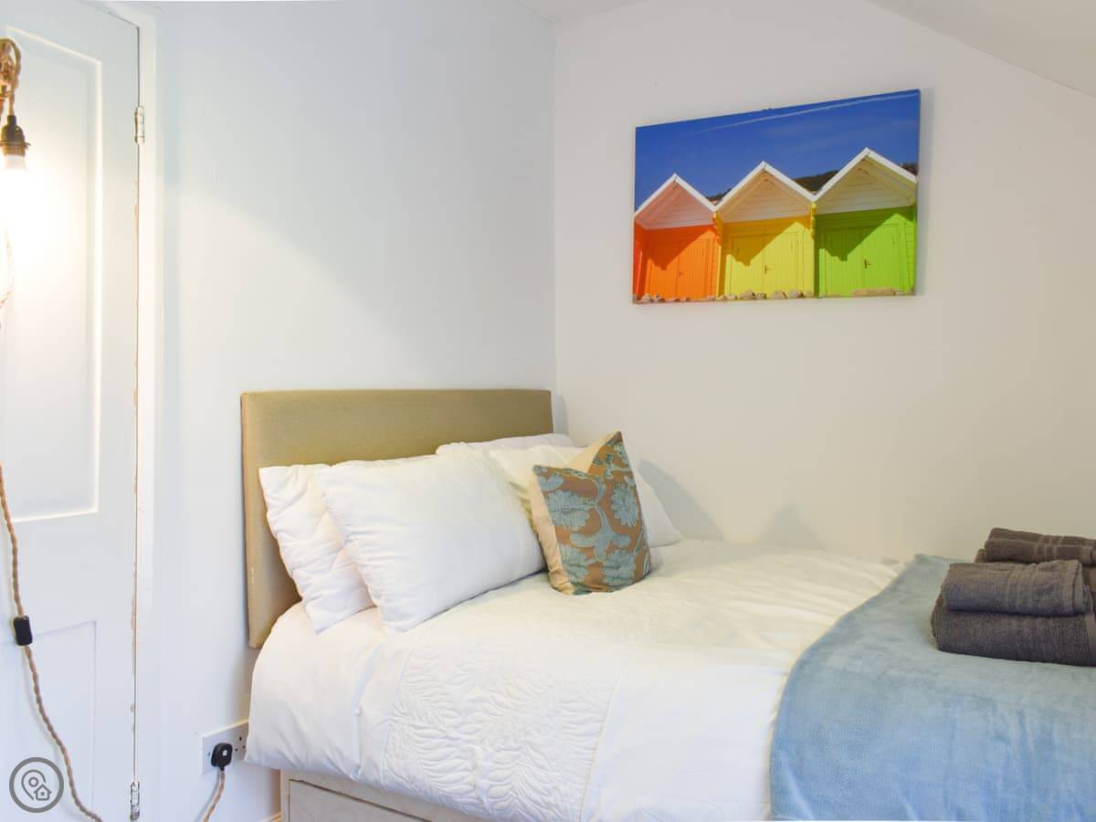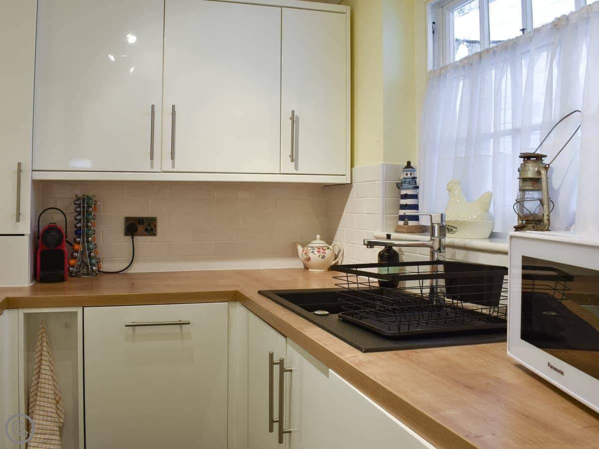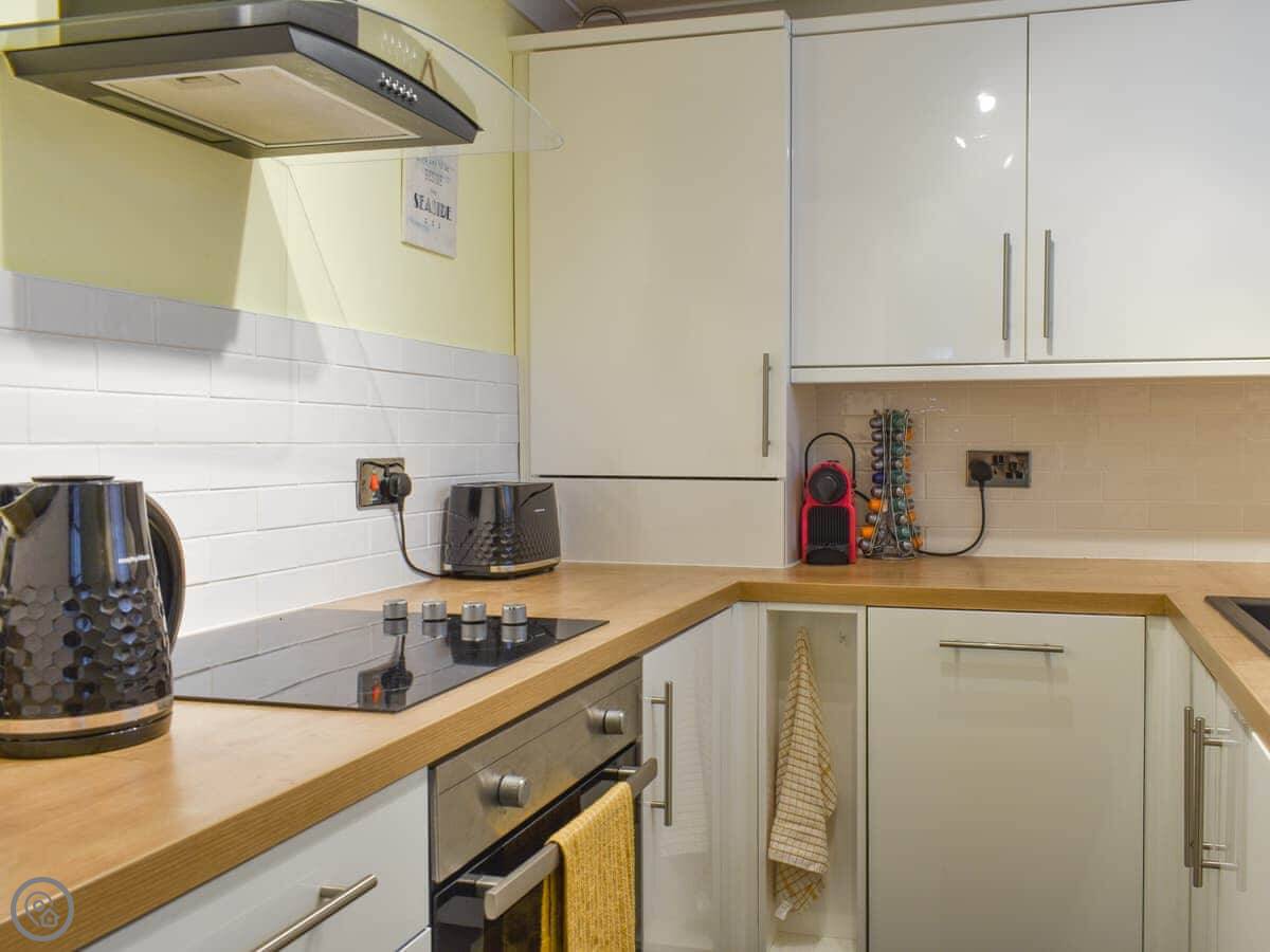 It sleeps four people. Two bedrooms, and one shower room. It's got a 4 Star rating. It's comfortable and clean. The kitchen is a proper galley kitchen, so it's narrow but it has everything you need. The door from there leads to a small yard, which is fenced in.