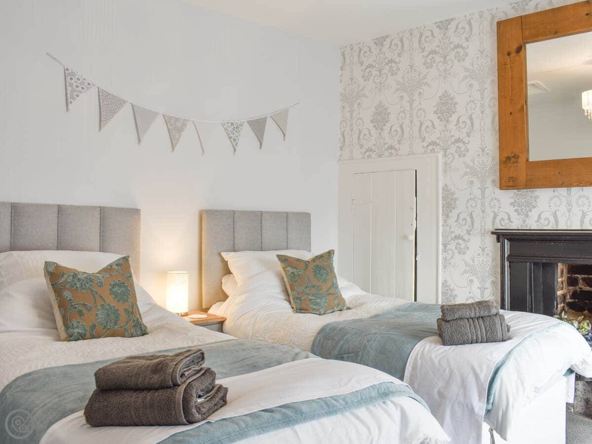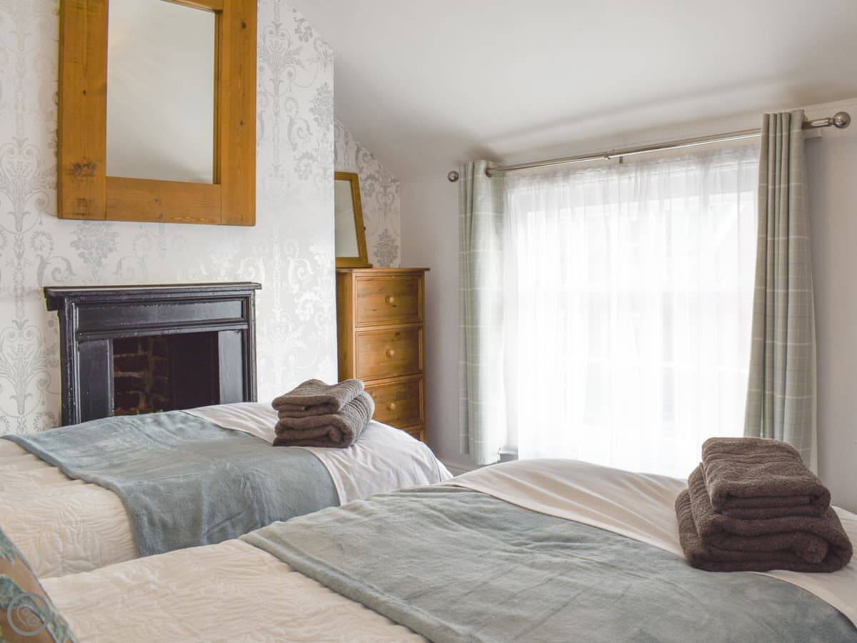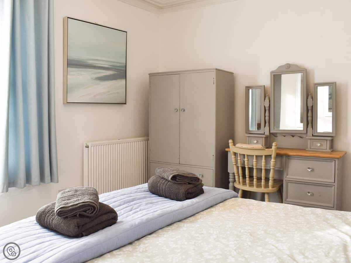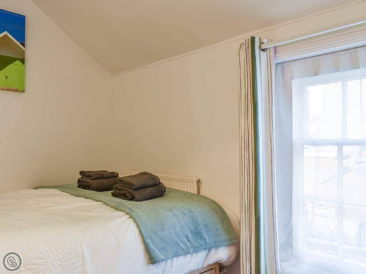 It sleeps four people. Two bedrooms, and one shower room. It's got a 4 Star rating. It's comfortable and clean. The kitchen is a proper galley kitchen, so it's narrow but it has everything you need. The door from there leads to a small yard, which is fenced in.