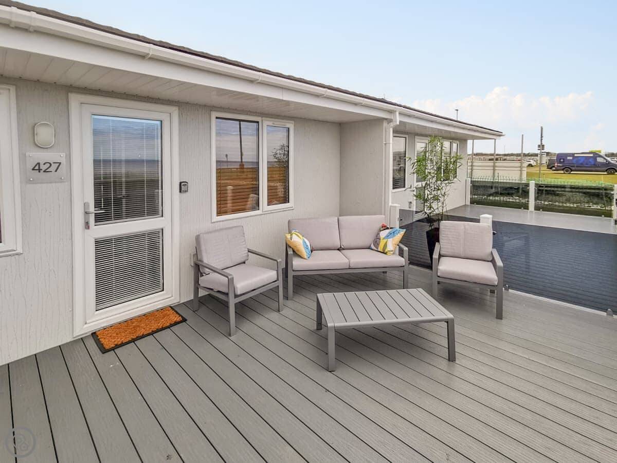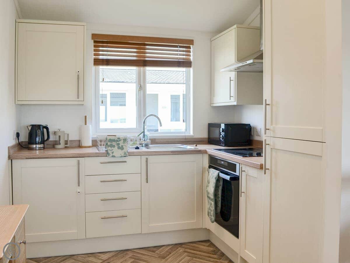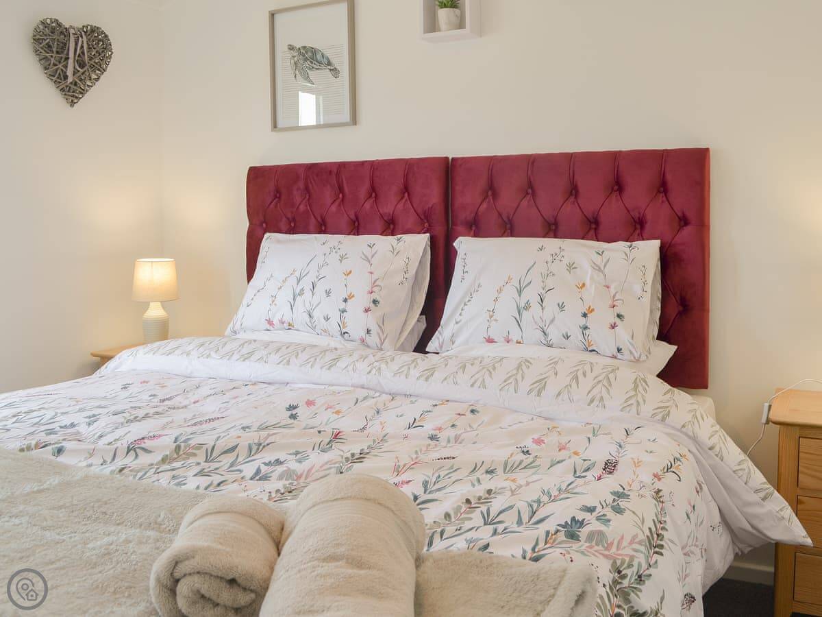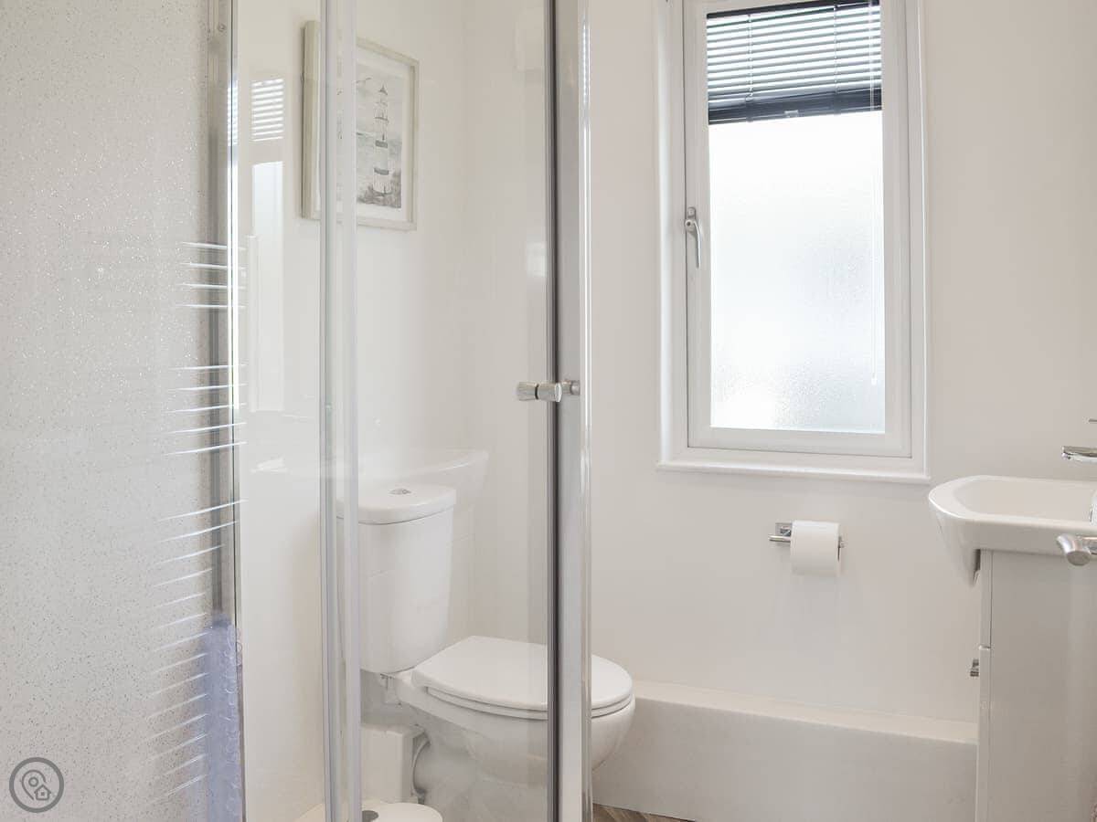 Facilities are what you'd expect. WiFi, washing machine, bedding and towels are included. There's parking right outside. The decking at the front is enclosed, which is useful if you're bringing dogs. You can bring two.