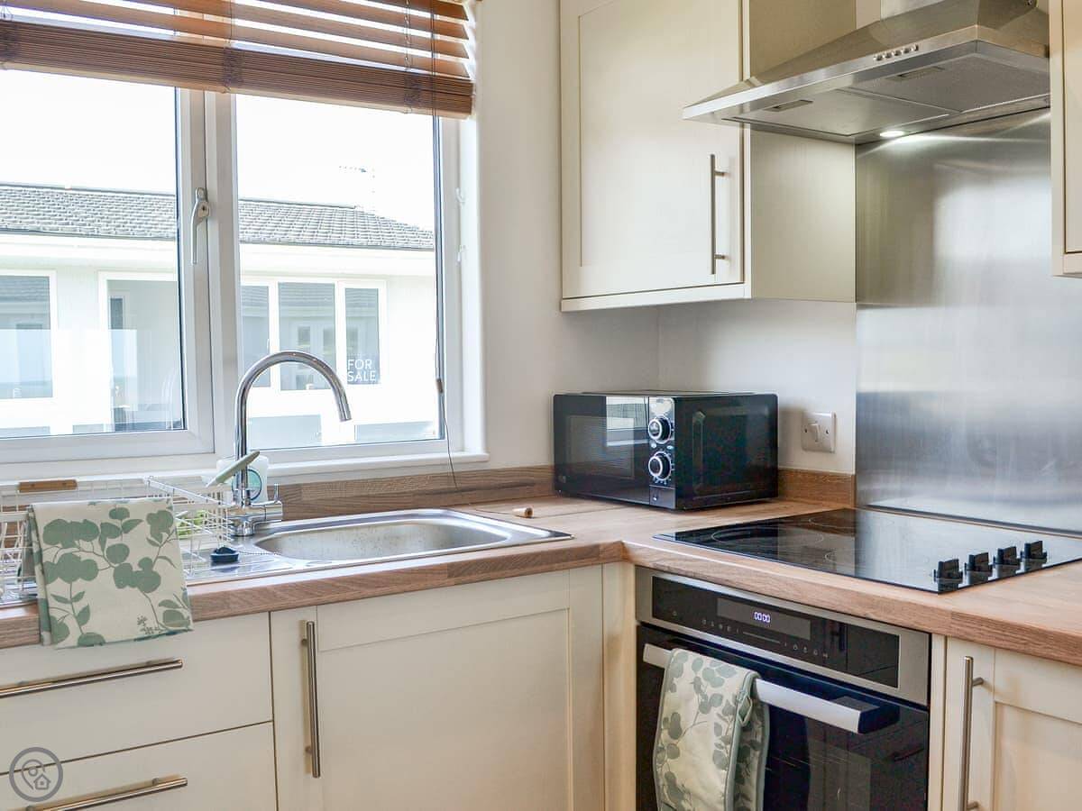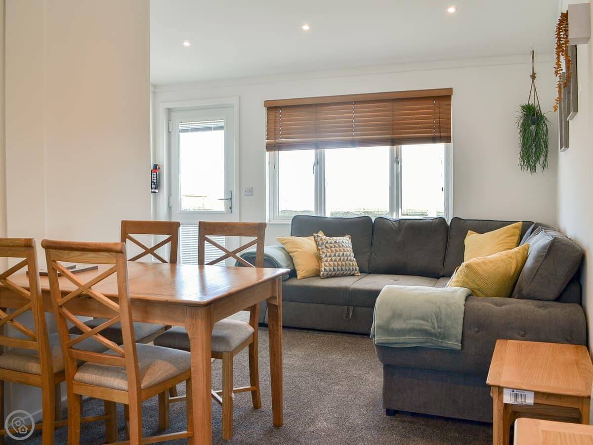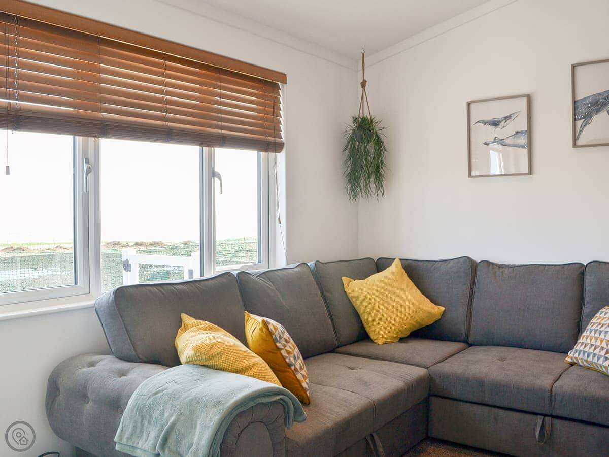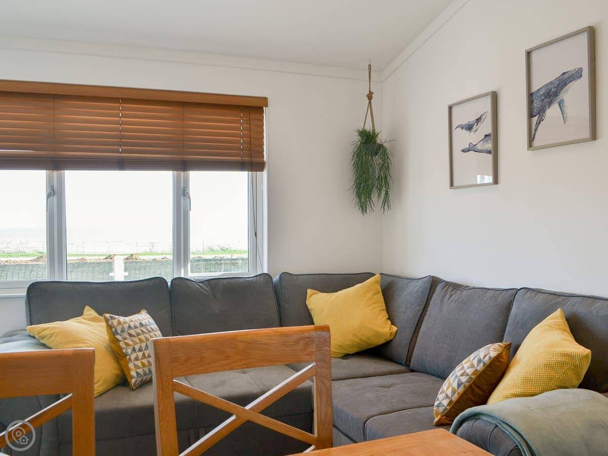 The main living area is all open plan. There's a decent-sized kitchen, a table for four, and a sofa area facing the big front window. The view is the selling point. You look right out over the beach and the sea.