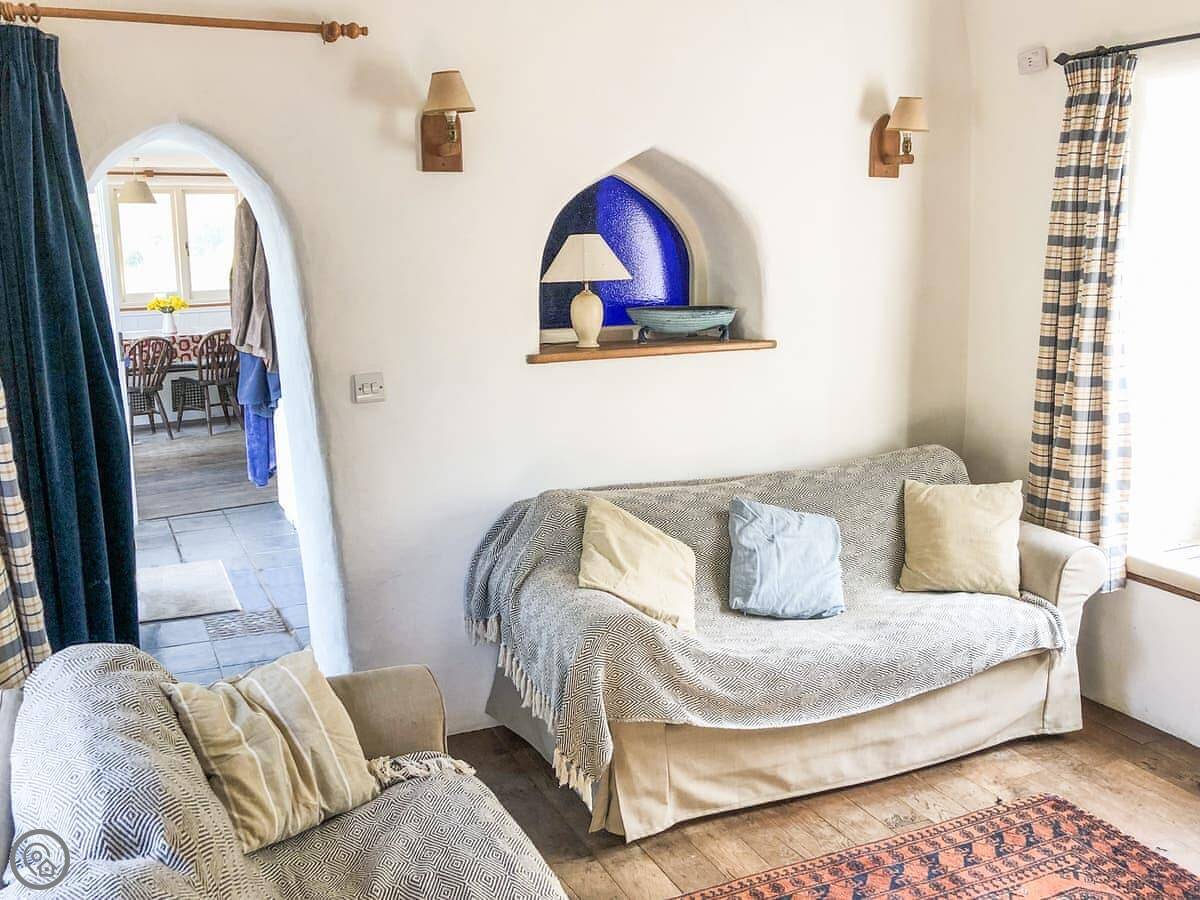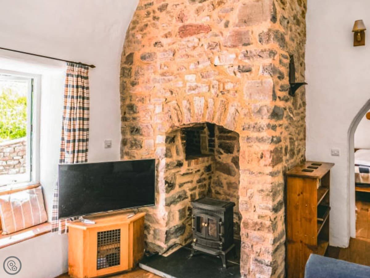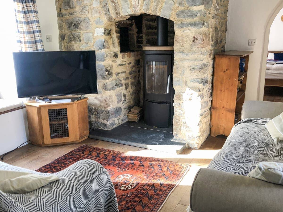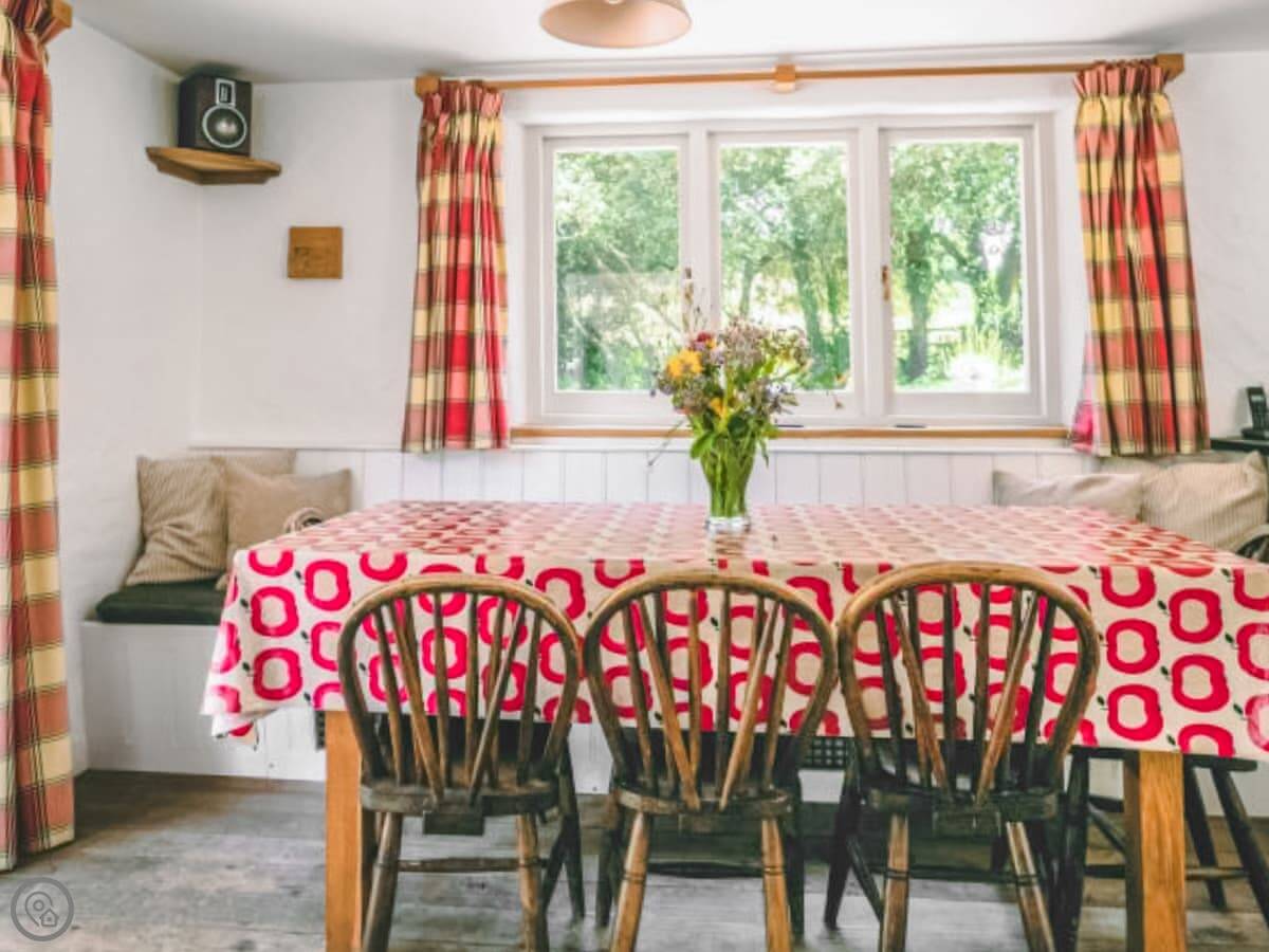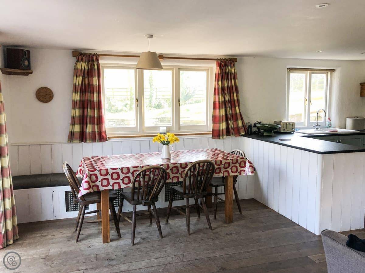 Inside, it's an old cottage. Stone floors, low beams in some rooms, a wood burner in the living room. The kitchen has what you need, including a dishwasher. There's a utility room with a washing machine. One dog is allowed. There's parking.