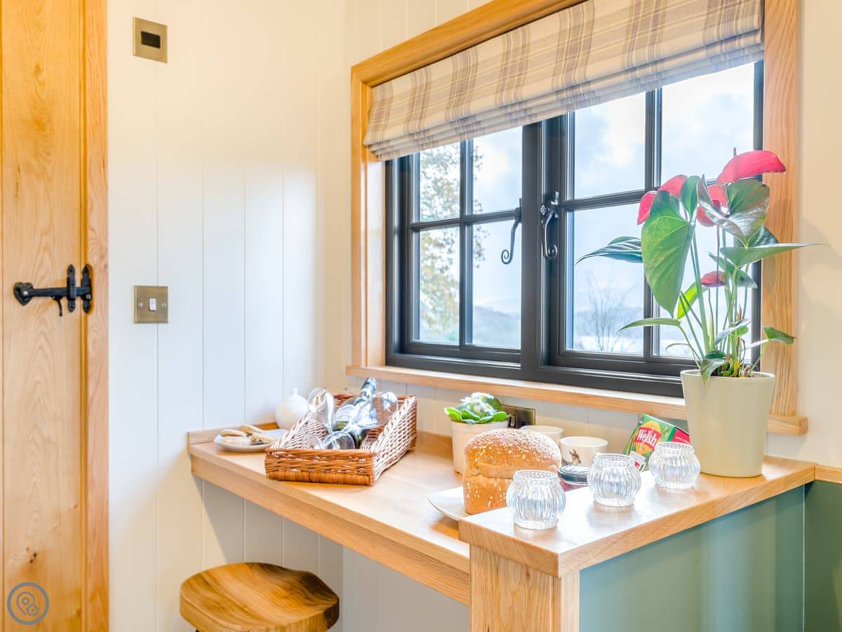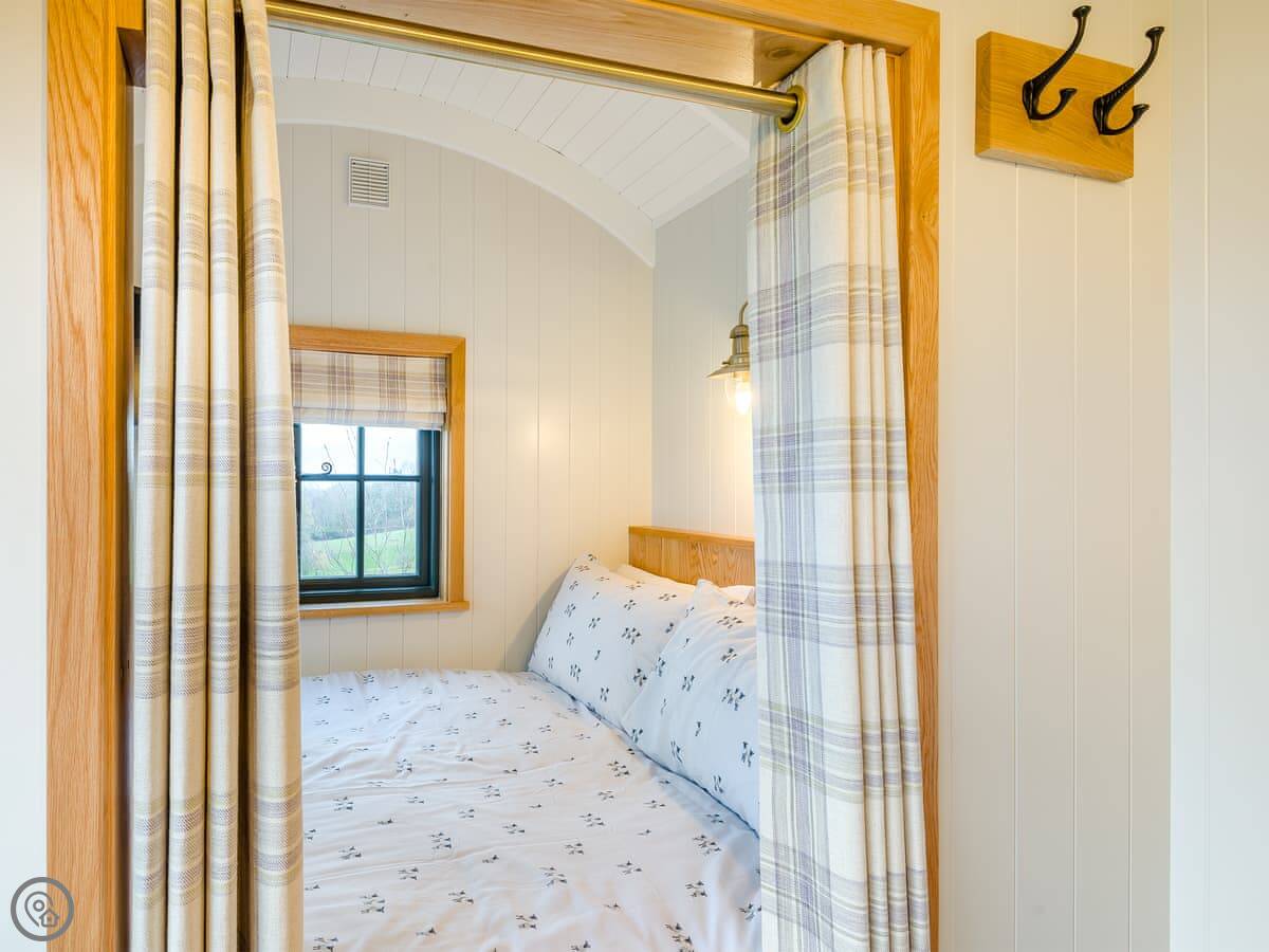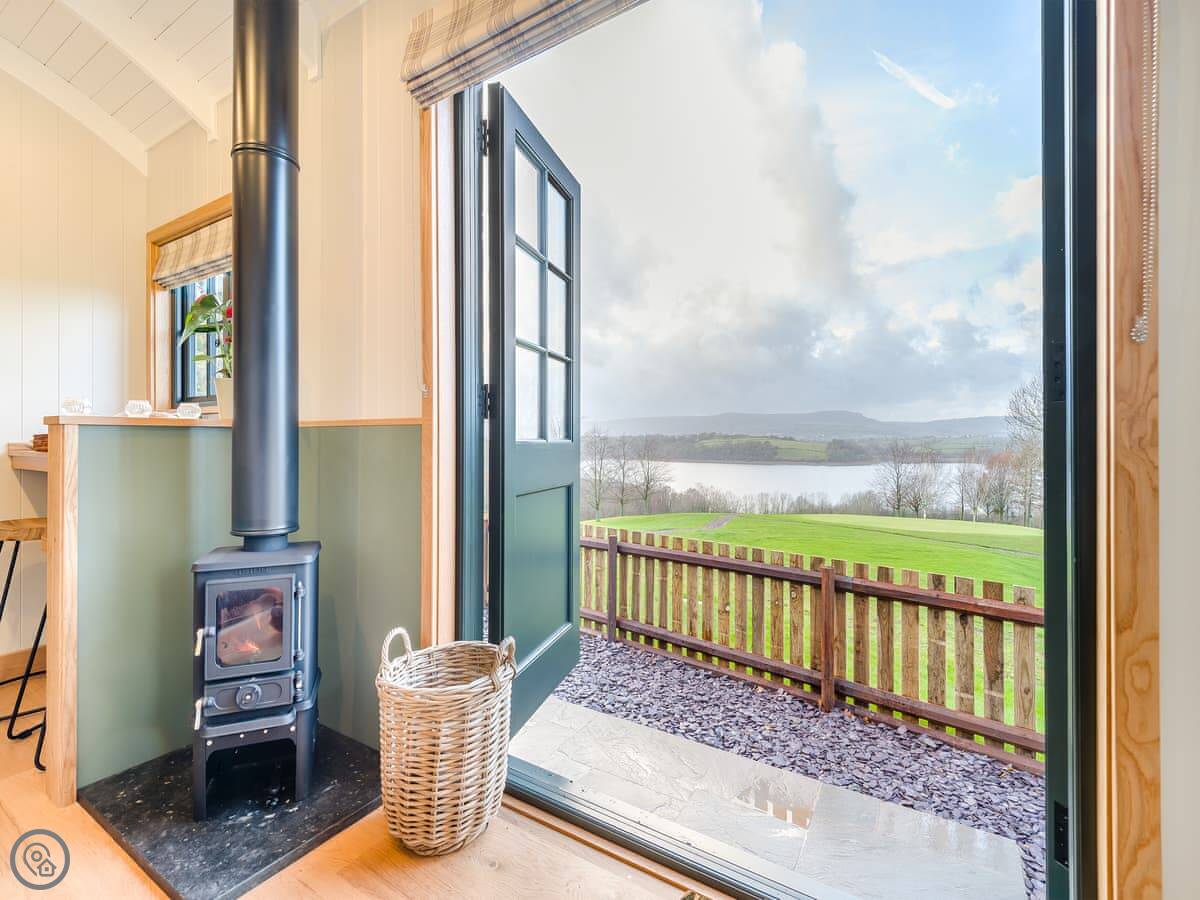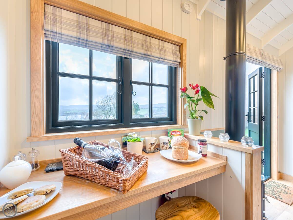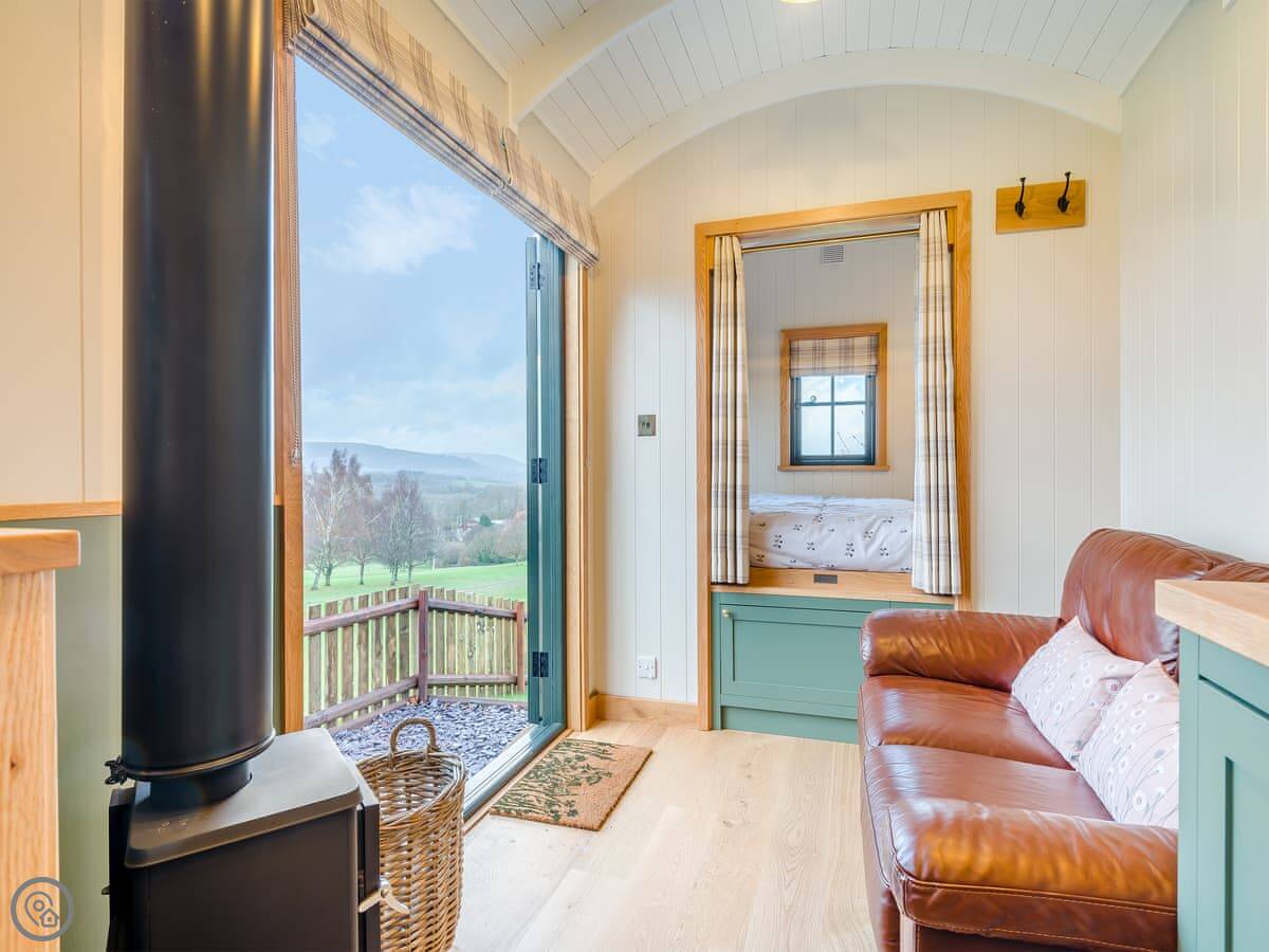 The inside is one open room. There's a double bed at one end, a sofa, a small kitchen area with a breakfast bar, and a shower room. It has a wood burner for heat. It's a 5 Star, so it's done to a high standard.