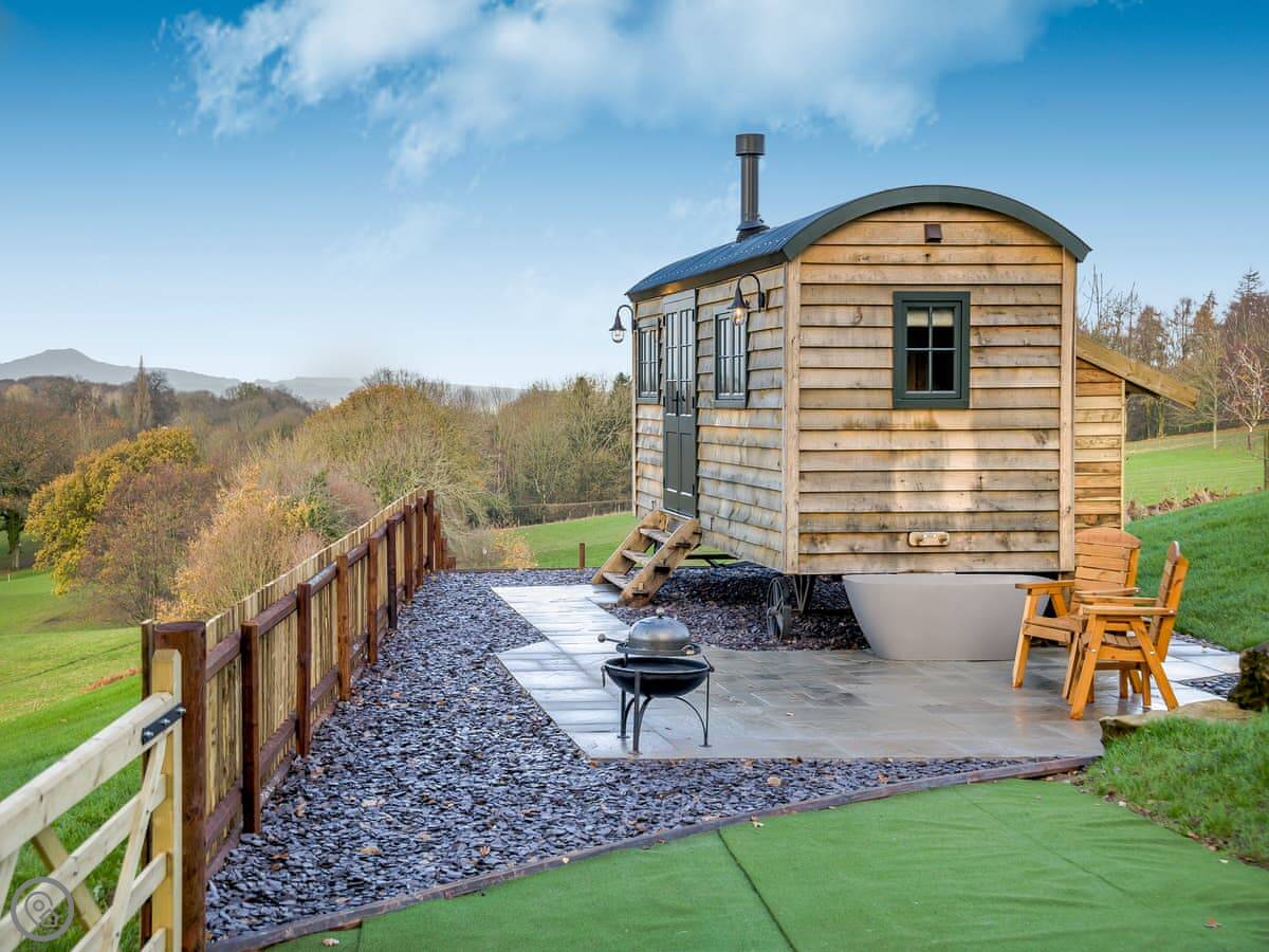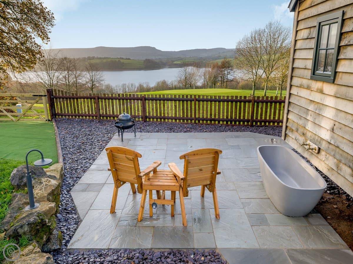 The main thing is the outside. You have an enclosed garden up there. The view looks over Llandegfedd Reservoir towards the Brecon Beacons and the Black Mountains. There's outdoor seating, a barbecue firepit, and a stone bath with hot water.